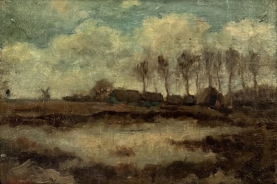 Schilderij van Felix Kohn (1922-2000), uitgevoerd in olie op board in de stijl van de Haagse School. Voorstelling van een uitgestrekt polderlandschap met molen, bomenrij en boerderijen onder een bewolkte lucht. Opvallend zijn het gedempte kleurenpalet en de atmosferische werking. Linksonder gesigneerd in rode verf. Gedateerd midden 20e eeuw.