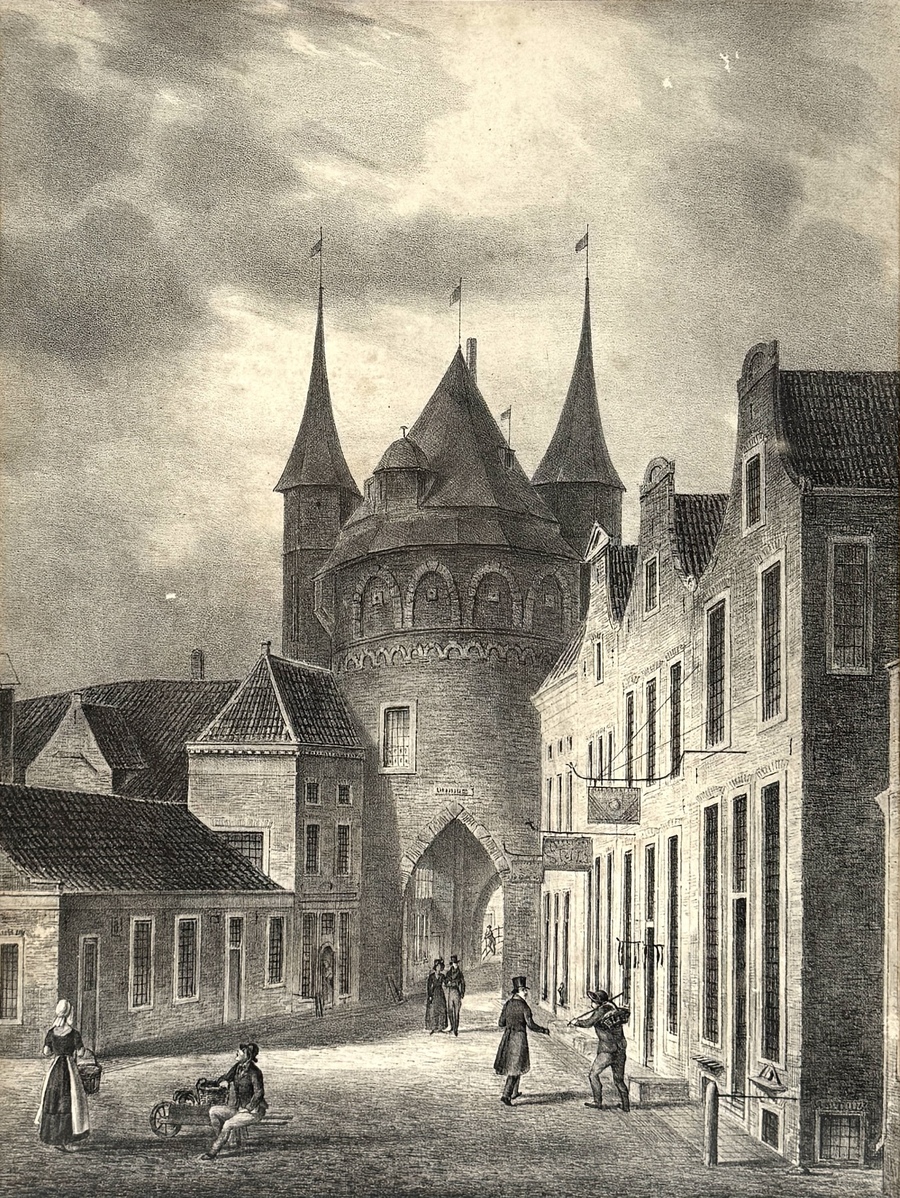 Litho, gedateerd circa 1832, van de Binnen Apoort te Groningen. De prent toont een gedetailleerde weergave van de stadspoort met torens en omliggende gebouwen. Op de voorgrond zijn figuren op straat afgebeeld. De atmosfeer wordt bepaald door een bewolkte lucht. Uitgevoerd op papier in zwart-wit, met fijne arceringen. Toegeschreven aan Joannes Nicolaus Schoonbeek.