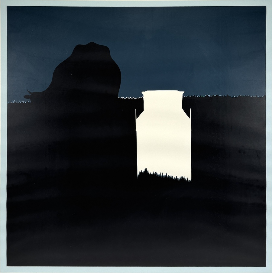 Zeefdruk op papier van Han Jansen (1931–1994), uitgevoerd in een minimalistische stijl met contrasterende kleurvlakken. De voorstelling toont een wit silhouet van een melkbus tegen een donker gestileerd landschap. Met potlood gesigneerd rechtsonder, omstreeks 1970. Druktechniek en vlakverdeling verwijzen naar grafische kunst uit eind twintigste eeuw.