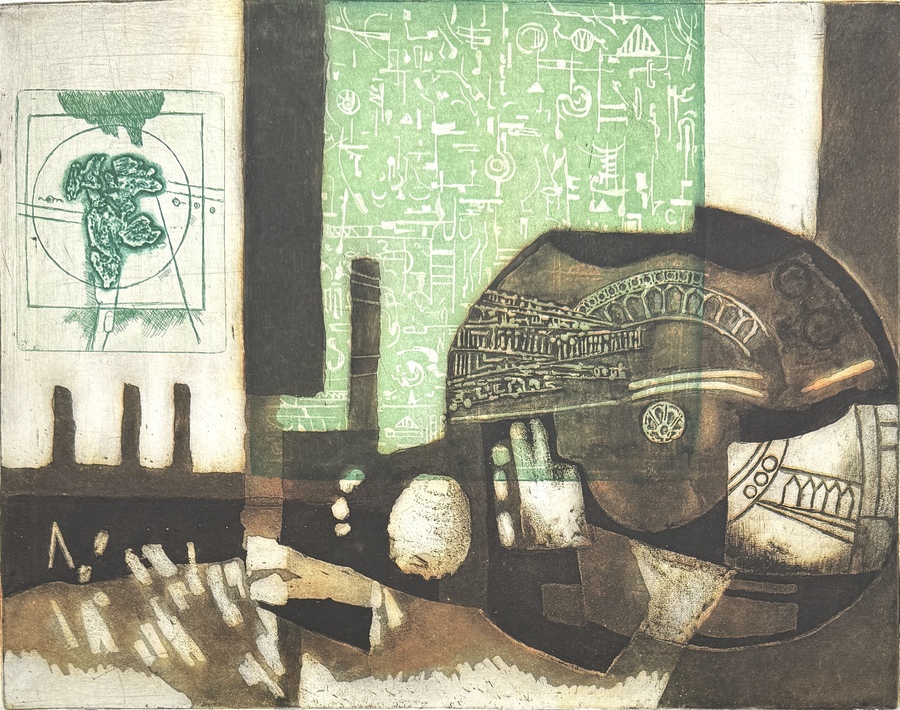 Een ets met aquatint van Lucas van der Pol (1935-2014), gedateerd 1977. Het werk is abstract met architectonische en organische elementen in diverse texturen en kleuren. Het toont onder andere een schijfvormig element, een groen vlak met symbolen, en een organisch patroon. Getiteld "voor koningin en vaderland" linksonder, gesigneerd Lucas v.d. Pol en gedateerd 1977 rechtsonder, met oplagenummer 9/10 midden onder.