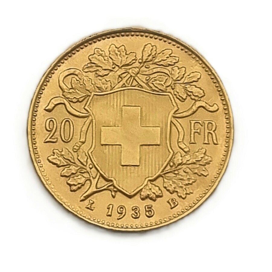 Zwitserse 20 frank gouden munt in klassiek-allegorische stijl, ontworpen door Fritz Landry (1886–1965). Datering 1935 met ‘L’ en muntteken ‘B’. Goud 900/1000, geslagen muntwerk. Voorzijde: buste Helvetia met Alpen en opschrift HELVETIA. Keerzijde: Zwitsers wapenschild in eikenkrans, waarde 20 FR en jaartal.