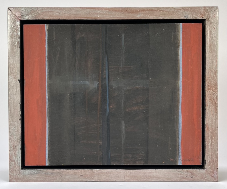 Schilderij van H. Sakata, gedateerd 1993, in abstract expressionistische stijl. Het werk is geschilderd in acryl op paneel. De compositie bestaat uit een donker vlak, geflankeerd door twee oranjerode banen met een blauwe lijn. Het werk is gevat in een metaalkleurige lijst. Rechtsonder gesigneerd en gedateerd.