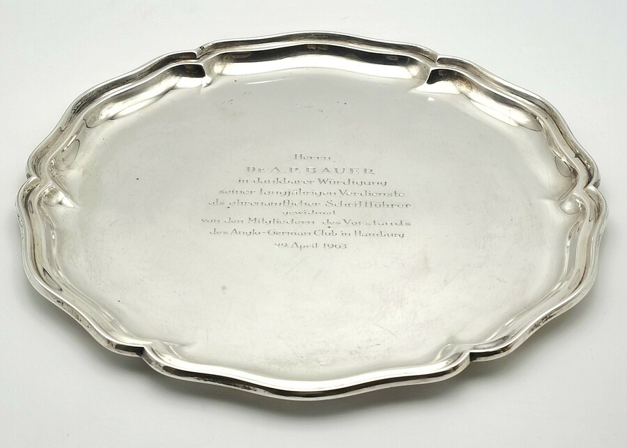 Rond zilveren dienblad in klassiek, rococo-geïnspireerd model met geschulpte, geprofileerde rand. Vervaardigd door Wilkens & Söhne, Bremen, datering 29 april 1963, middenvlak met Duits gegraveerde opdracht aan Dr. A. P. Bauer van het bestuur van de Anglo-German Club in Hamburg. Onderzijde gemerkt ‘Wilkens’, 835 (tweede gehalte zilver) en diverse keurmerken.