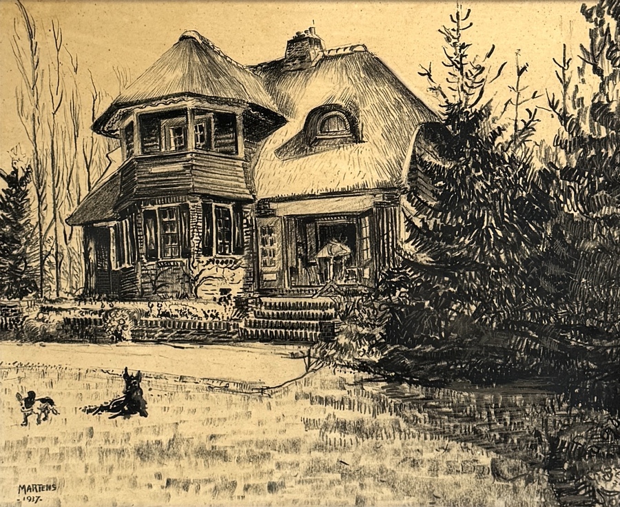 Klassieke interbellum tekening met architecturale focus door Georg Martens (1894–1979), gedateerd 1937. Uitvoering in pen en zwarte inkt met grijze lavis. Afgebeeld is villa De Holten aan de Rijksstraatweg in Haren, met erker, veranda, coniferen en twee honden. Linksonder gesigneerd en gedateerd.