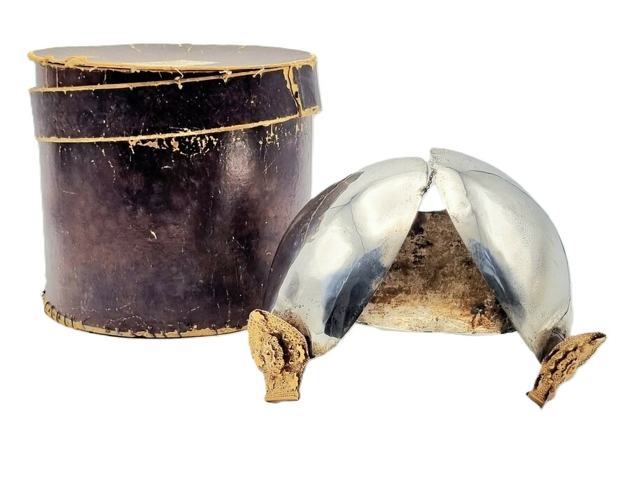 Zilveren oorijzer met 14 karaat gouden rozetbroches, Nederlands streekdracht-sieraad. Kap in tweede zilvergehalte (833), binnenzijde gemerkt lopende leeuw 2, broches gemerkt met eikenblad. Handgesmeed gedreven zilver, broches in filigrain en granulatie. Met korte veiligheidsketting en bijbehorende cilindrische doos. Datering omstreeks 1865.