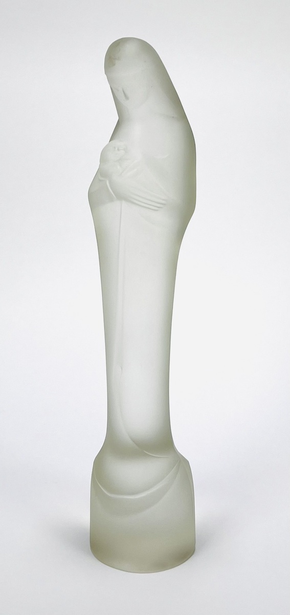 Art Deco beeld “Madonna met kind”, ontwerp Stef Uiterwaal (1889–1960) voor Glasfabriek Leerdam, 1929. Uitgevoerd in gesatineerd persglas met satijnmatte afwerking. Langgerekte, streng gestileerde figuur met neerwaartse blik, vasthoudend kind en vloeiende mantelcontouren. Onderzijde gemerkt met monogram van de ontwerper.