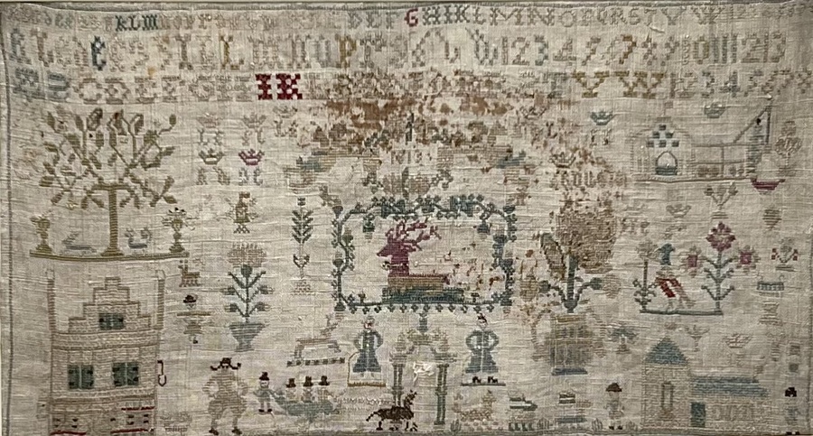 Merklap uit 1813, uitgevoerd op linnen met zijde- en katoengaren in kruissteekborduurwerk. Centraal staat een hert binnen een bloemenkrans, geflankeerd door diverse figuren, een levensboom, bloemen, dieren en gebouwen zoals een trapgevelhuis. De merklap bevat alfabetten, cijfers en initialen in meerdere kleuren. De datering 1813 is aan de bovenzijde van het textiel ingeweven.