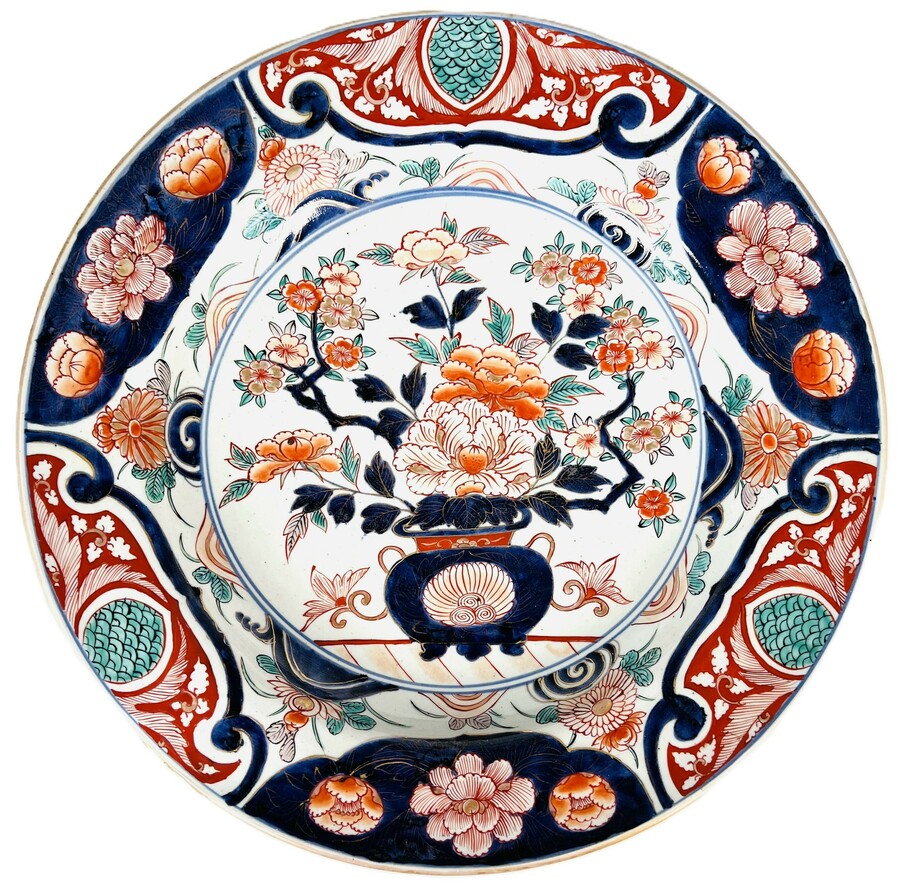 Groot formaat Japanse Imari porseleinen schaal, 18e eeuw. Handbeschilderd in kobaltblauw met rood, groen en zwart. Centraal rond medaillon met bloemvaas en pioenrozen; brede rand met cartouches, schub- en bloemmotieven. Onderrand met eenvoudige takdecoratie; binnenzijde met steunpuntsporen. Diep uitgeholde vorm met afgeschuinde rand. Achterzijde met dubbele blauwe concentrische cirkels en smalle, ongeglazuurde voetring.
