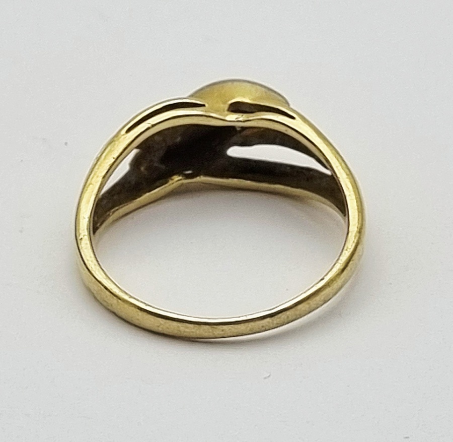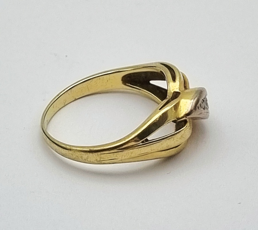 Gouden ring uit circa de tweede helft van de 20e eeuw. De ring is vervaardigd van 14 karaat goud in een tweekleurig design van geel en wit goud. De ringband wordt gevormd door gekruiste banden, met diamanten gezet in het witgouden gedeelte. Deze tweekleurige ring is een voorbeeld van moderne sieraden met een dynamische vormgeving. Binnenzijde gemerkt met meesterkeur LL en 585. Eerst deze gouden ring zien voordat je biedt? Bezoek onze kijkdagen op 29, 30 en 31 augustus van 11:00 tot 17:00 uur! |