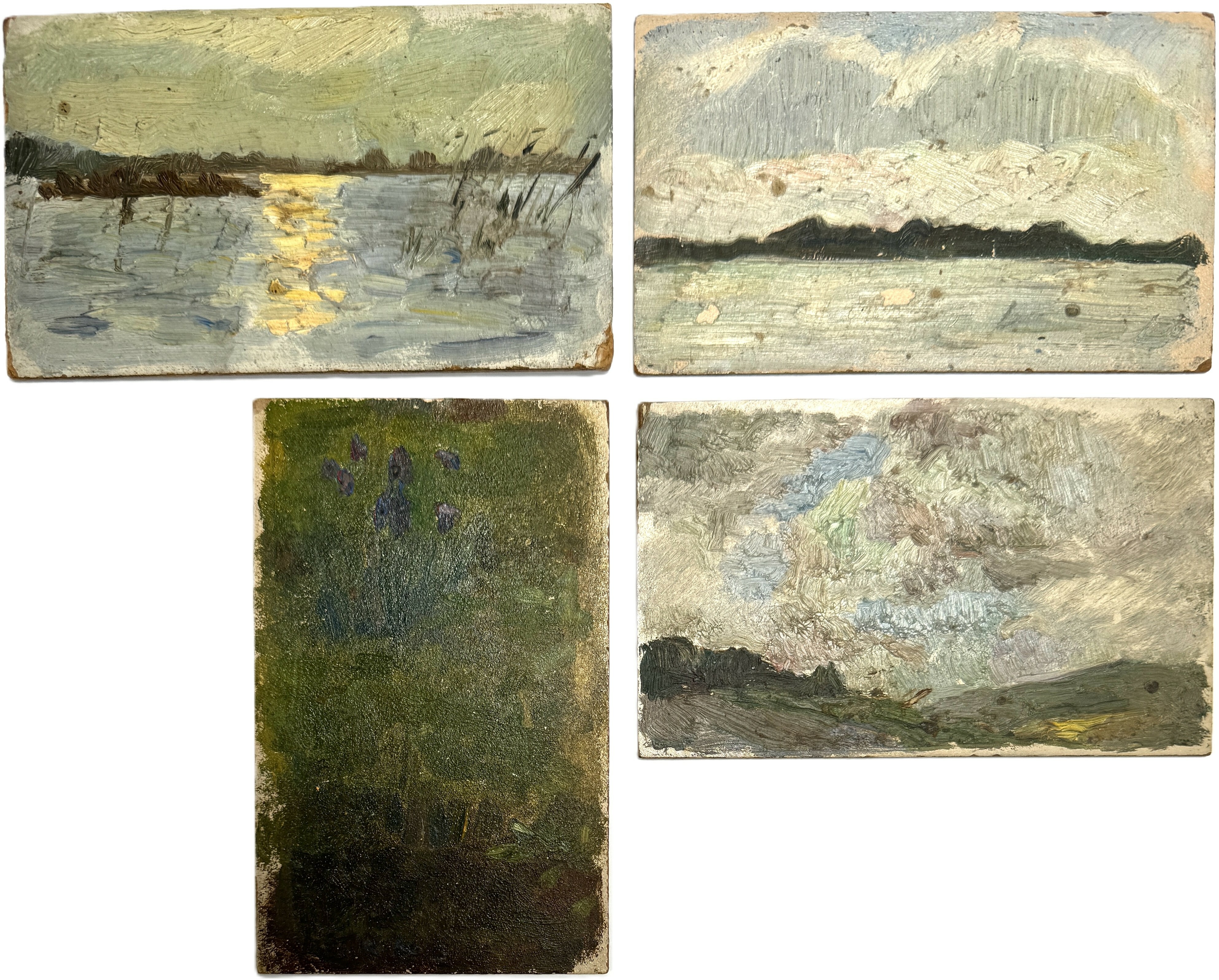 Set van vier miniatuur schilderijtjes van Reinhart Dozy (1880–1947), uitgevoerd in olieverf op schilders karton in impressionistische stijl. De scènes tonen landschappen en een bloem stilleven, met nadruk op lichtval, lucht en vegetatie. Begin 20e eeuw, eén achterzijde met potlood gedateerd 1903. Afkomstig uit de collectie van de zoon van de kunstenaar. Geïnteresseerd? Bezoek onze kijkdagen op 29, 30 of 31 augustus van 11:00 tot 17:00 uur! |