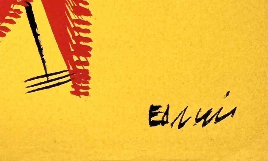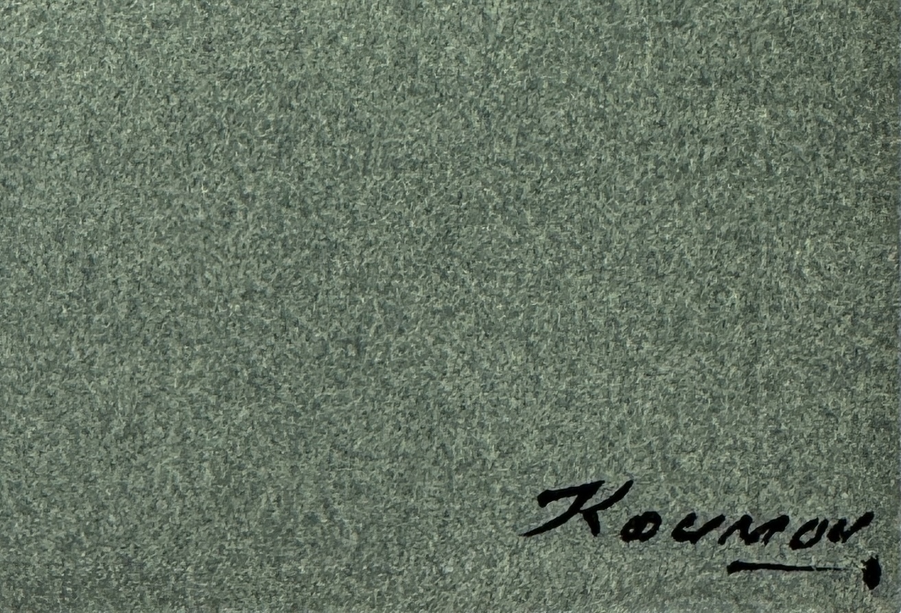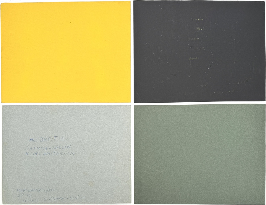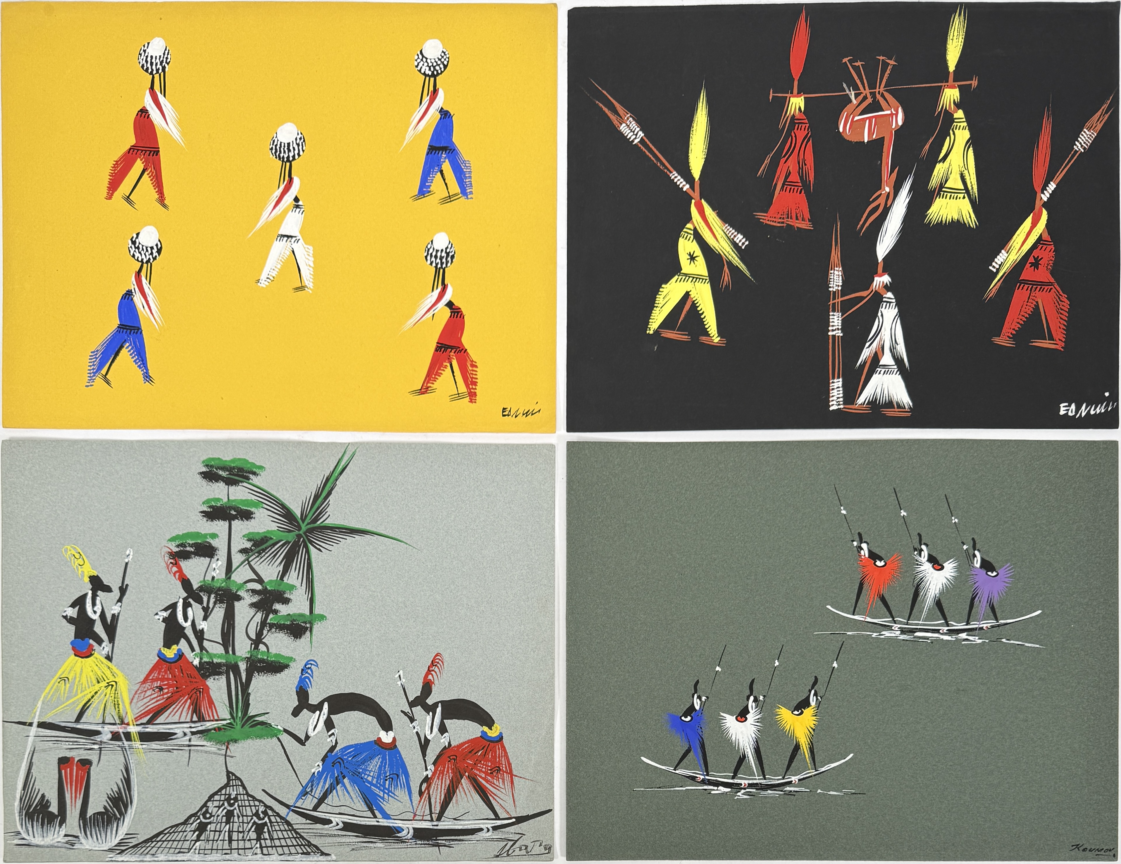 Vier modernistische tekeningen, gesigneerd door Ed Nui, Koumon en een derde maker, uitgevoerd op getint karton. Voorstellingen van dansende en jagende figuren. Visuele kenmerken zijn onder meer de vlakverdeling in primaire kleuren, gestileerde menselijke vormen en Afrikaans thematisch motief. Oorsprong: Ivoorkust of Congo-Brazzaville, circa jaren 1950–1960. Rechtsonder gesigneerd. Zelf beoordelen? Je bent welkom op onze kijkdagen op 29, 30 en 31 augustus! |