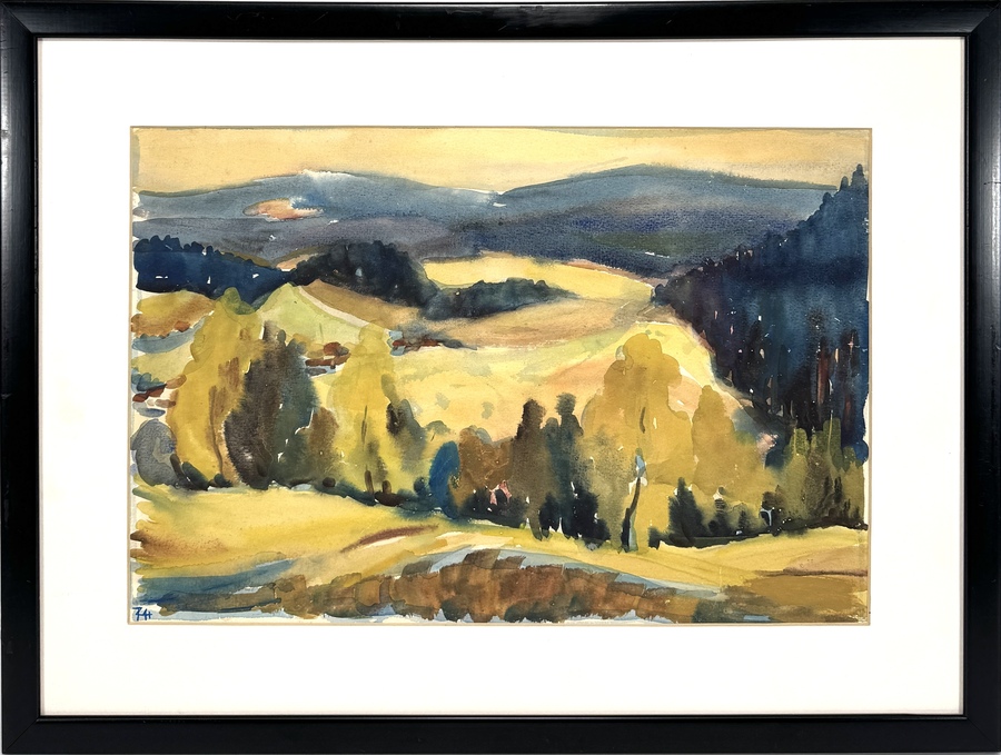 Aquarel van een impressionistisch landschap met heuvels en bomen, toegeschreven aan Ferdinand Hodler, uitgevoerd op papier, 20e eeuw. Het werk kenmerkt zich door losse penseelstreken en een focus op de weergave van licht en sfeer, met levendige oker, blauwe en groene tinten. Gesigneerd linksonder met het monogram FH. Wil je direct deelnemen? Plaats vanaf 22 augustus alvast een schriftelijk bod via onze website! |