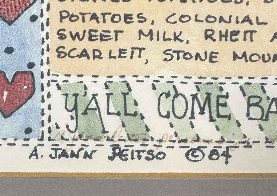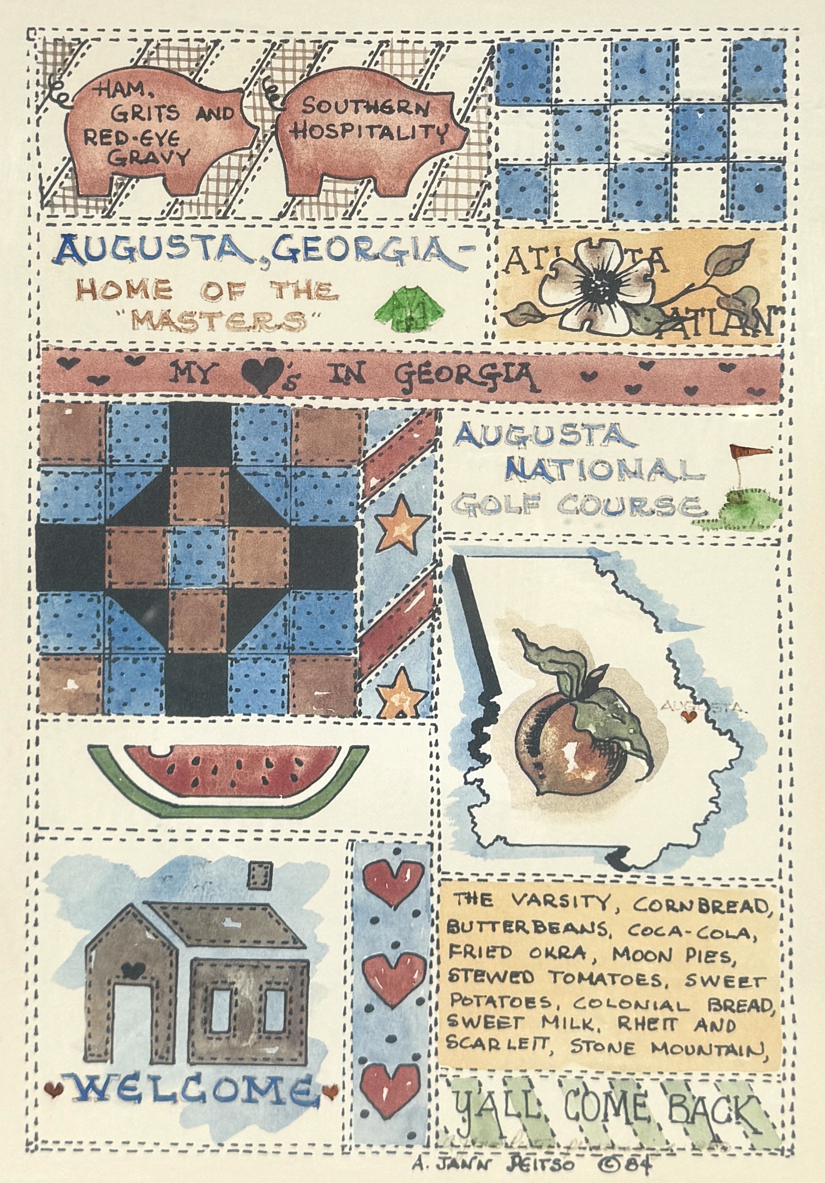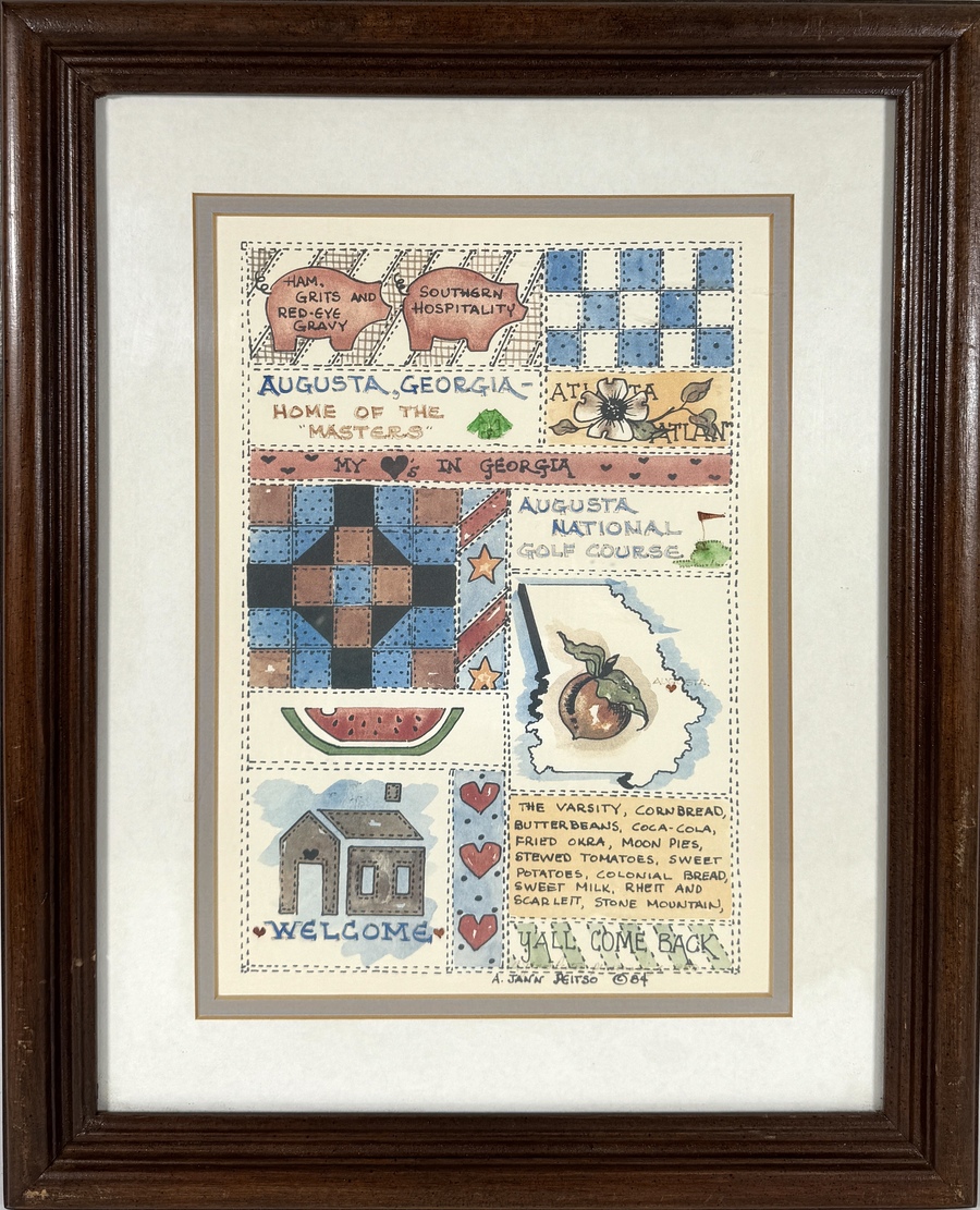 Tekening van A. Jann Peitso uitgevoerd in pen en aquarel op papier, gedateerd 1984, rechtsonder gesigneerd. Illustratief werk met quiltmotieven en folk art-stijl, waarin typisch Zuid-Amerikaanse cultuur en Georgia-symboliek samenkomen. Elementen als Augusta National, traditionele gerechten en plaatsnamen zijn decoratief verwerkt binnen een patchworkcompositie met tekst en illustraties.