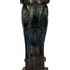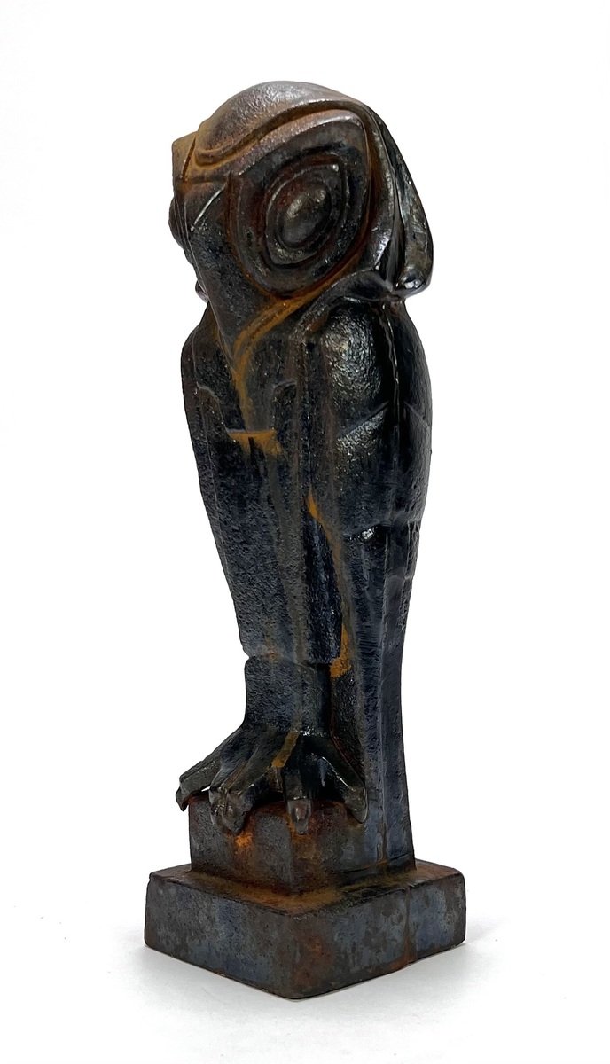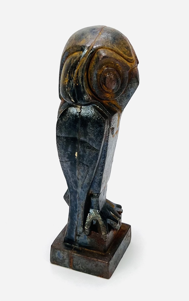 Dit gietijzeren beeld van een gestileerde uil is uitgevoerd in de Art Deco-stijl, laatste kwart 20e eeuw. Het object heeft een compacte, hoekige vorm met concentrische cirkels als ogen en vereenvoudigde vlakken voor het lichaam. Het staat op een vierkante basis en vertoont een donkere, roestige patina. Wil je dit beeld in het echt bekijken? Kom naar de kijkdagen op 29, 30 en 31 augustus! |