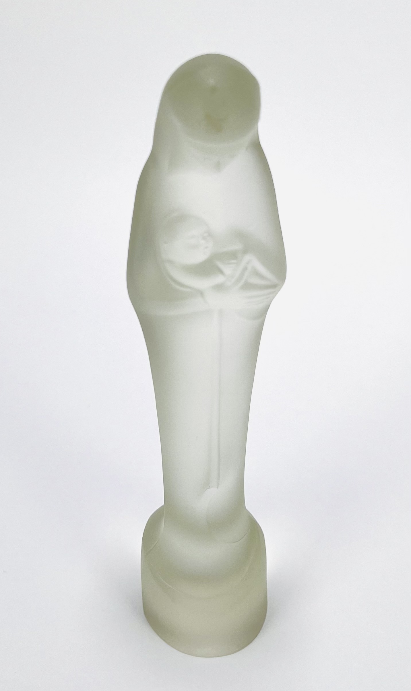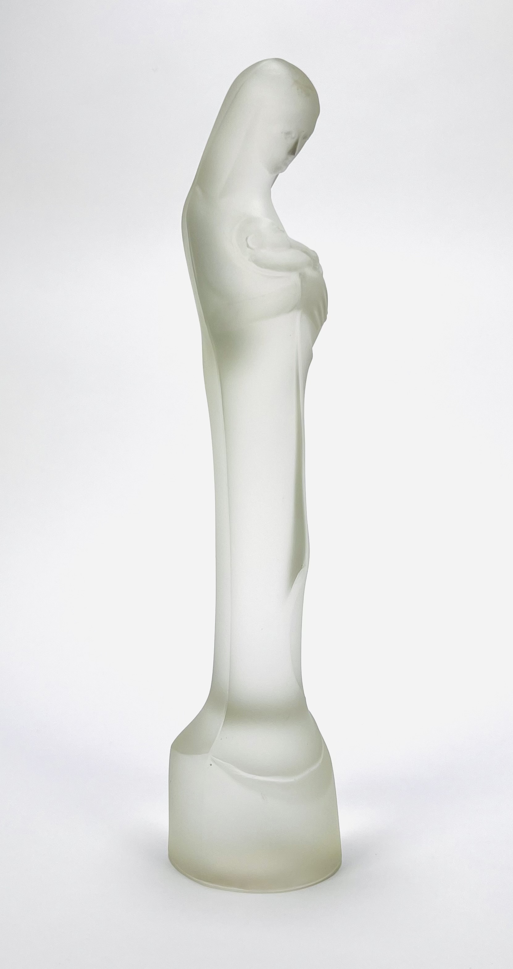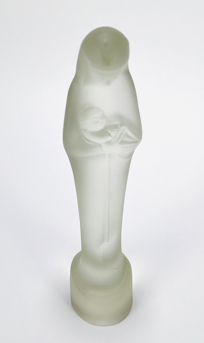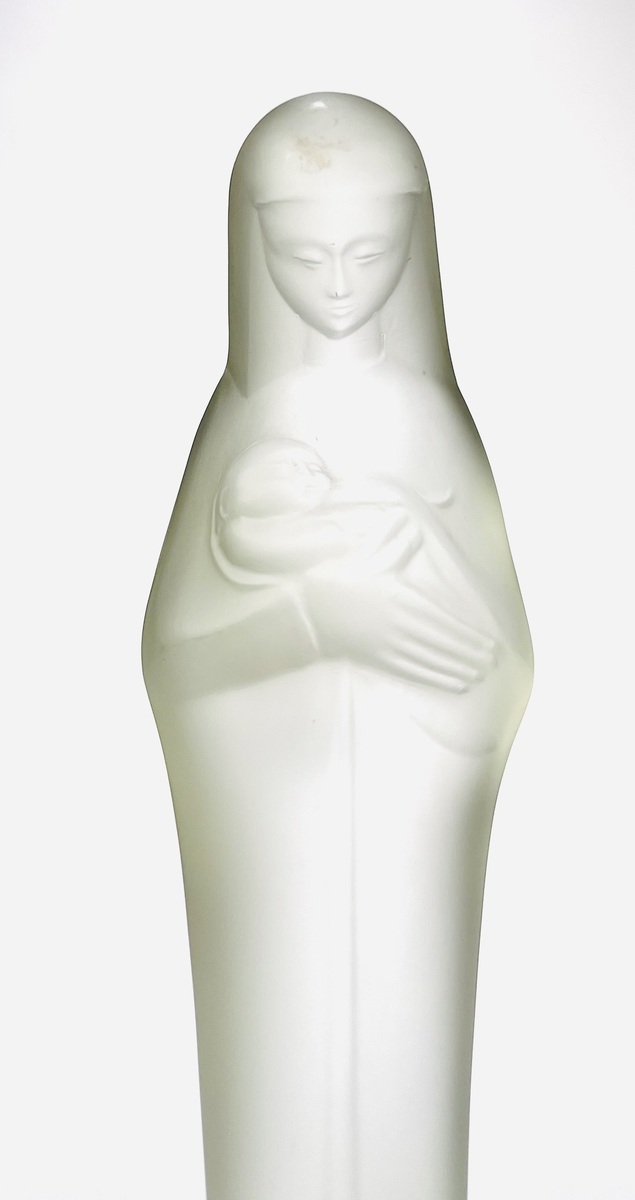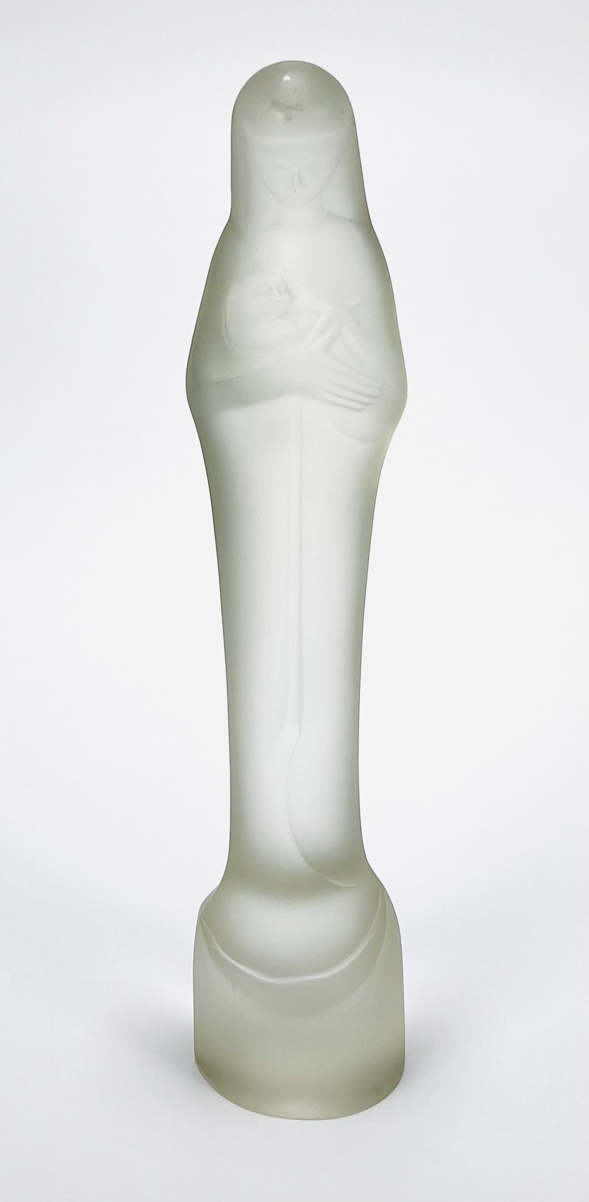 Art Deco beeld “Madonna met kind”, ontwerp Stef Uiterwaal (1889–1960) voor Glasfabriek Leerdam, 1929. Uitgevoerd in gesatineerd persglas met satijnmatte afwerking. Langgerekte, streng gestileerde figuur met neerwaartse blik, vasthoudend kind en vloeiende mantelcontouren. Onderzijde gemerkt met monogram van de ontwerper. Zeker zijn van deelname? Plaats vanaf 22 augustus een schriftelijk bod online! |