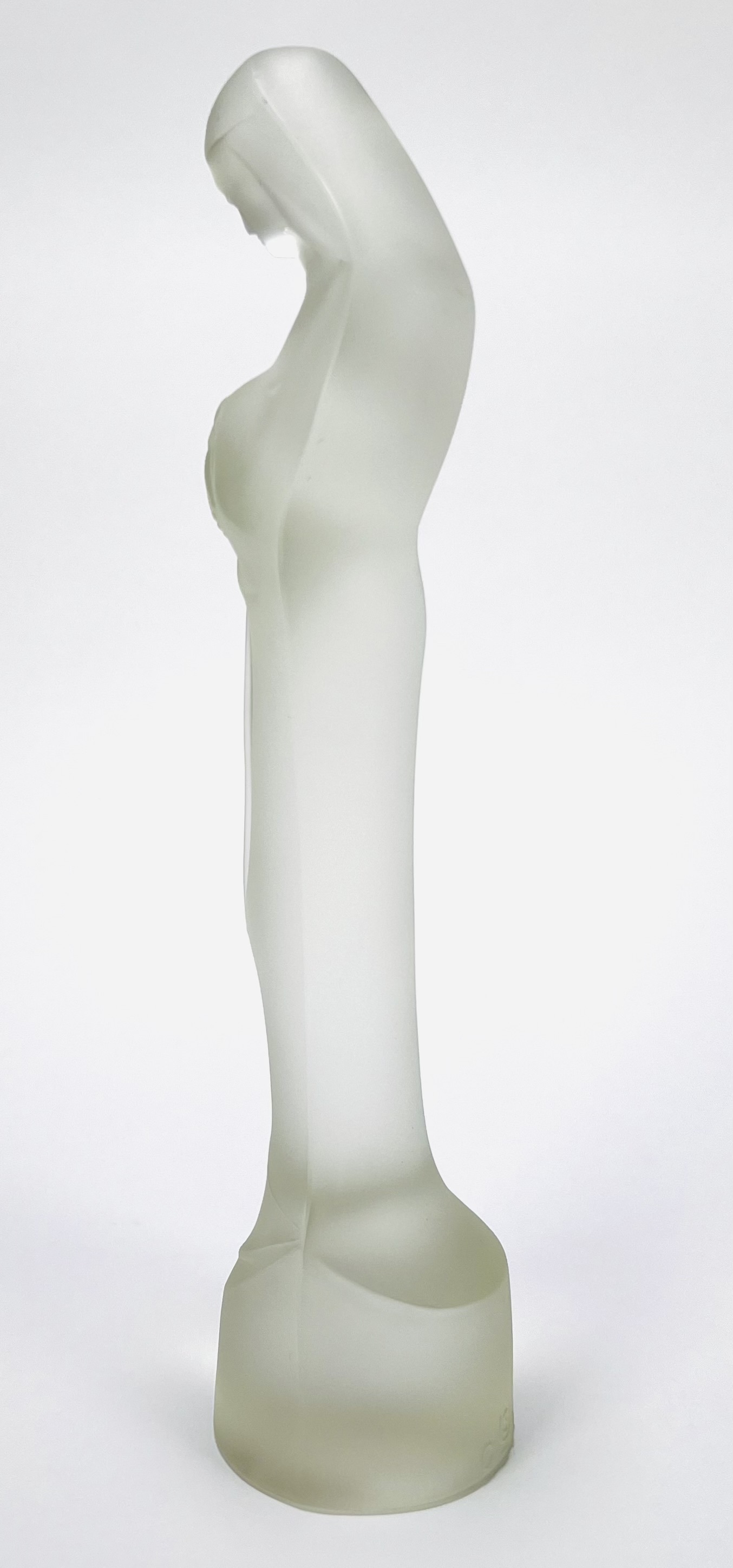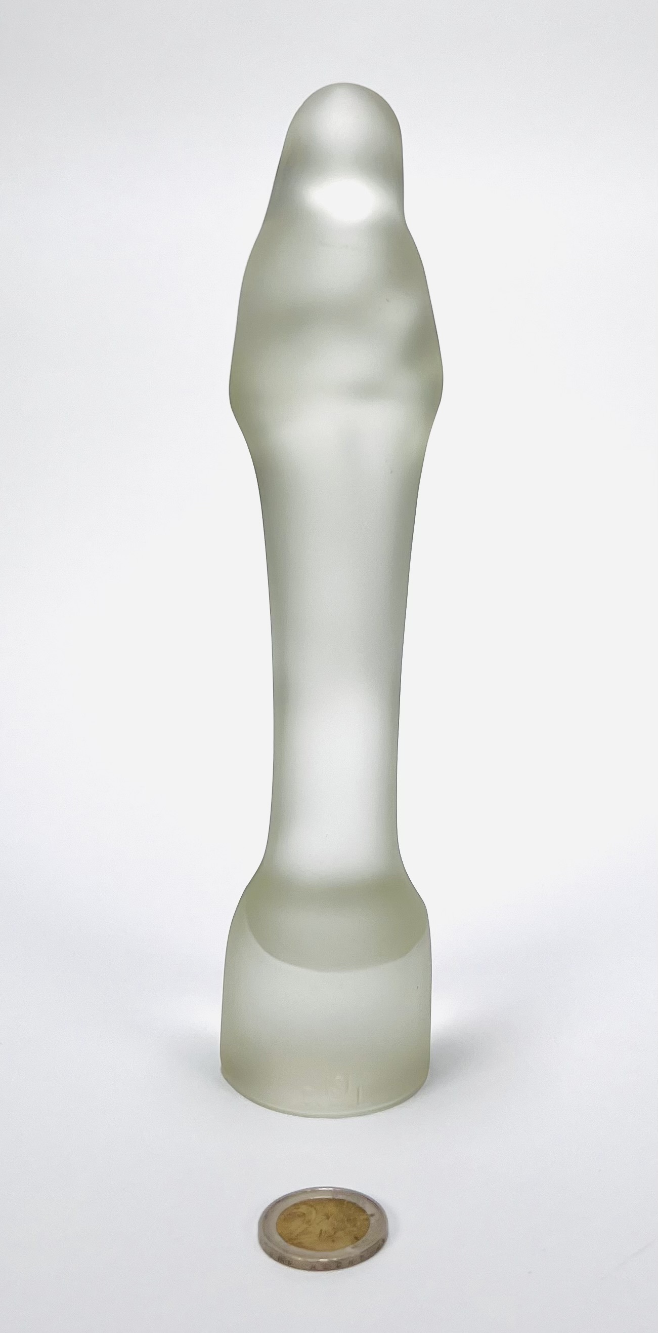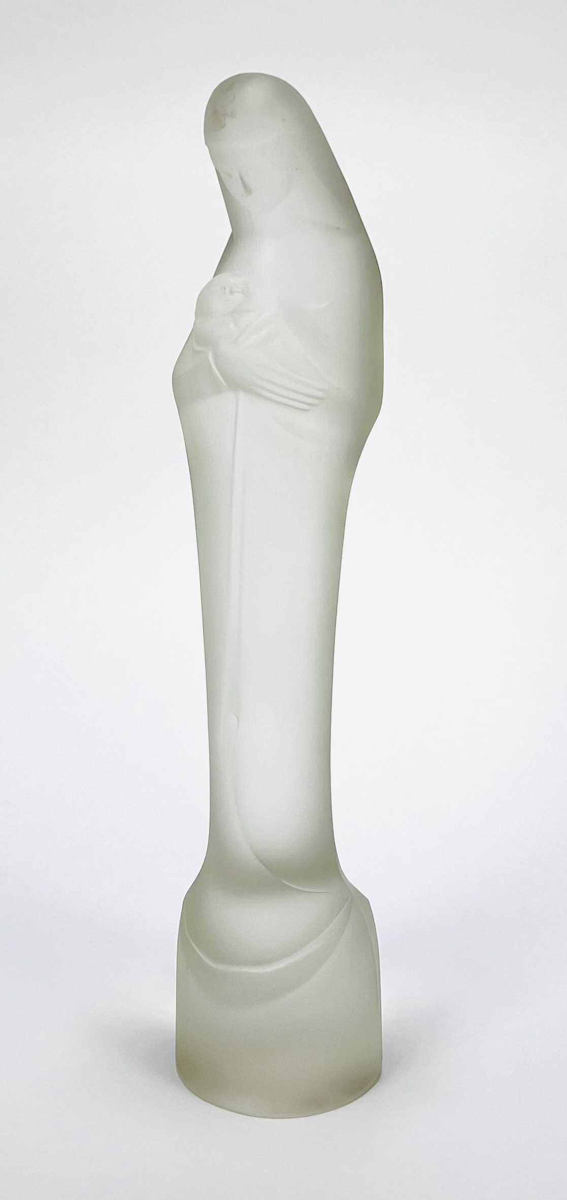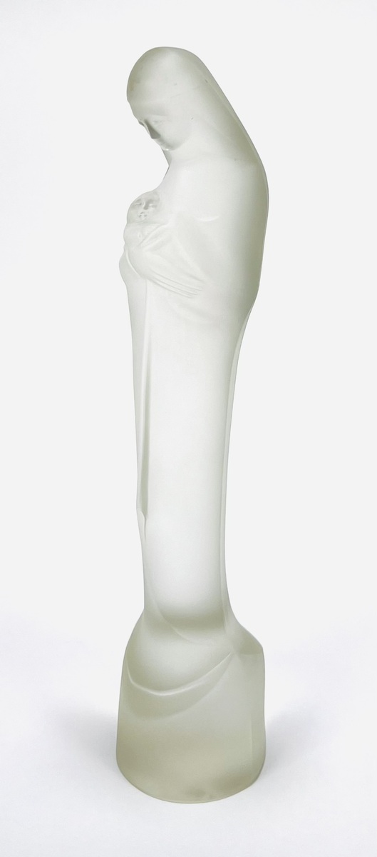 Art Deco beeld “Madonna met kind”, ontwerp Stef Uiterwaal (1889–1960) voor Glasfabriek Leerdam, 1929. Uitgevoerd in gesatineerd persglas met satijnmatte afwerking. Langgerekte, streng gestileerde figuur met neerwaartse blik, vasthoudend kind en vloeiende mantelcontouren. Onderzijde gemerkt met monogram van de ontwerper. Zeker zijn van deelname? Plaats vanaf 22 augustus een schriftelijk bod online! |