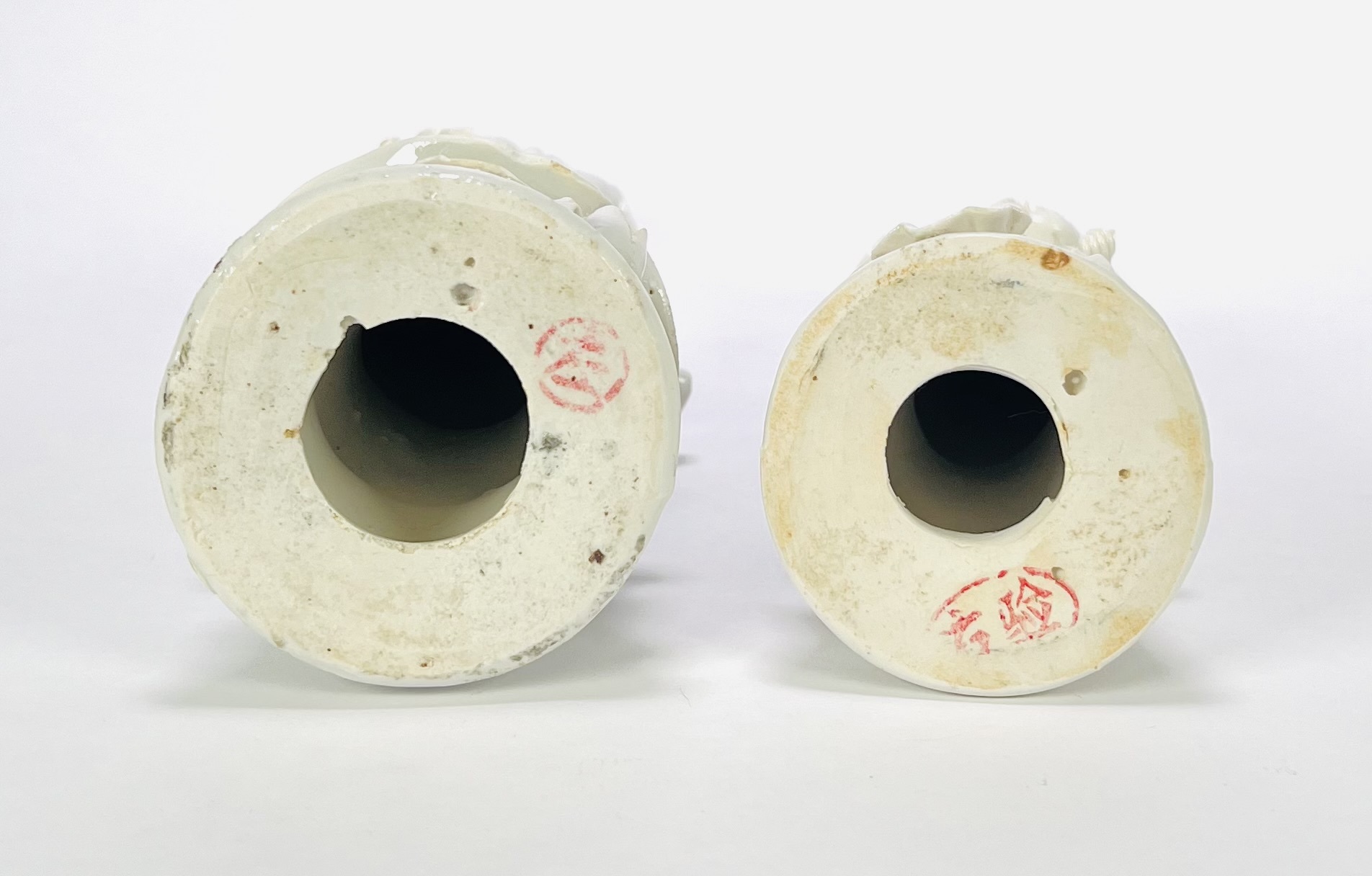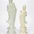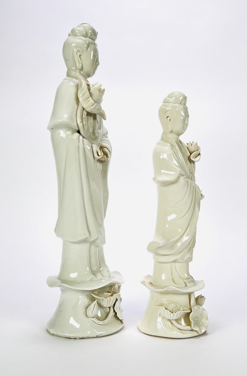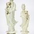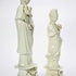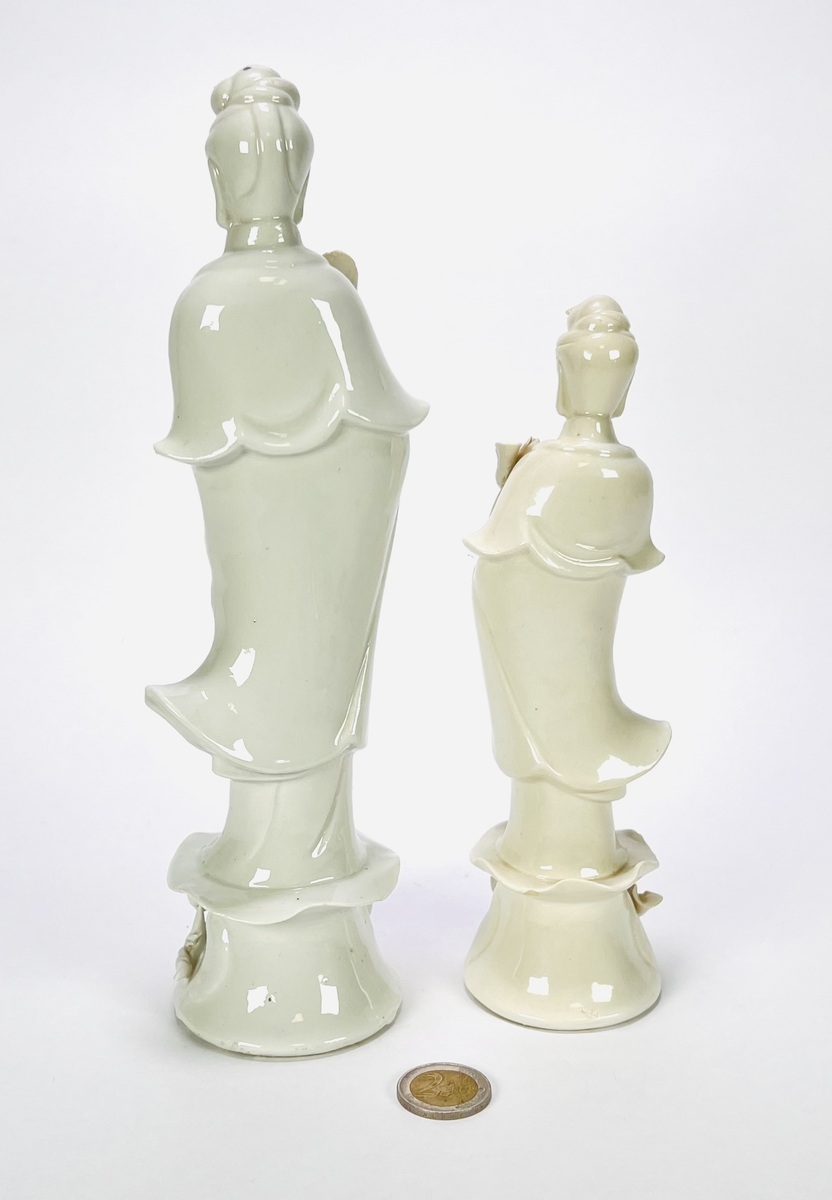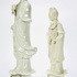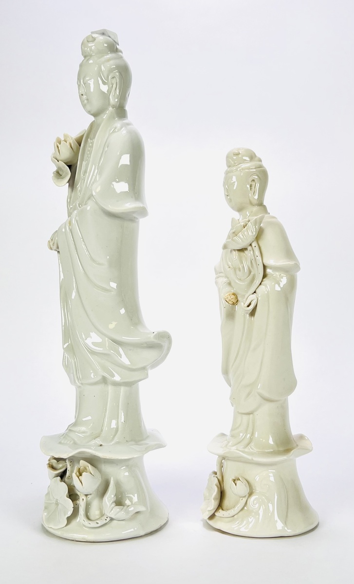 Een paar Chinese Blanc de Chine porseleinen figuren, daterend uit het begin tot midden 20e eeuw, vermoedelijk Guanyin en een begeleidende figuur. De beelden hebben een wit glazuur, met gedetailleerde gewaden en lotusbloem-attributen. De sokkels zijn eveneens lotus-vormig. Aan de onderzijde zijn de figuren voorzien van een rood stempelmerk. Registreer nu en bied eenvoudig online mee op deze beelden. |