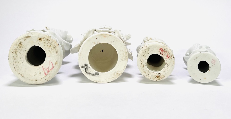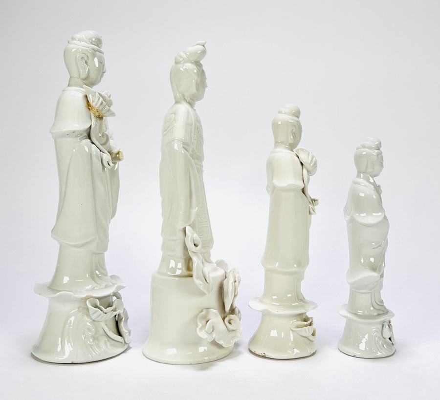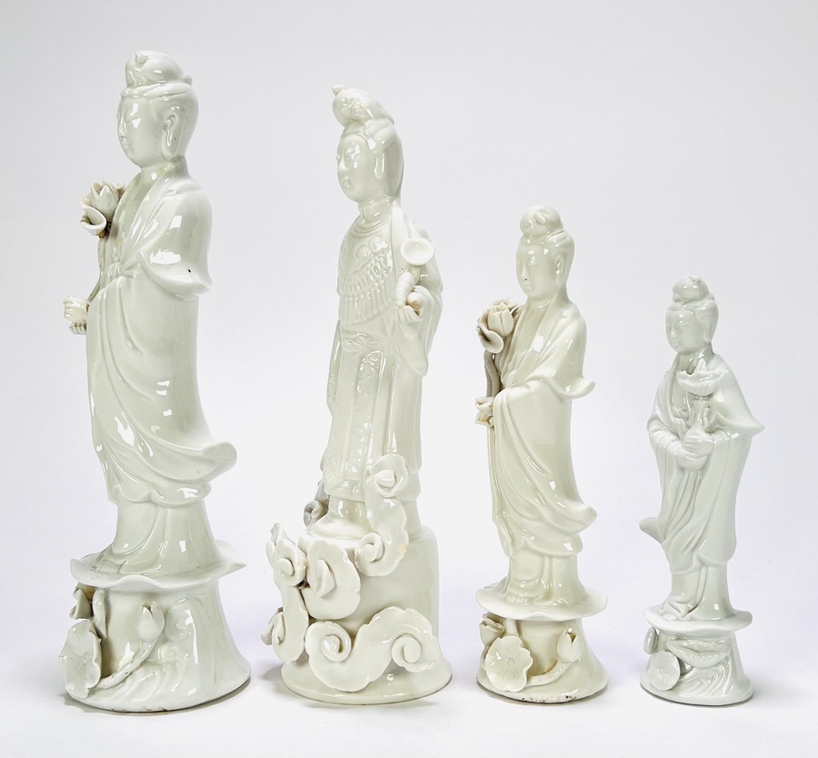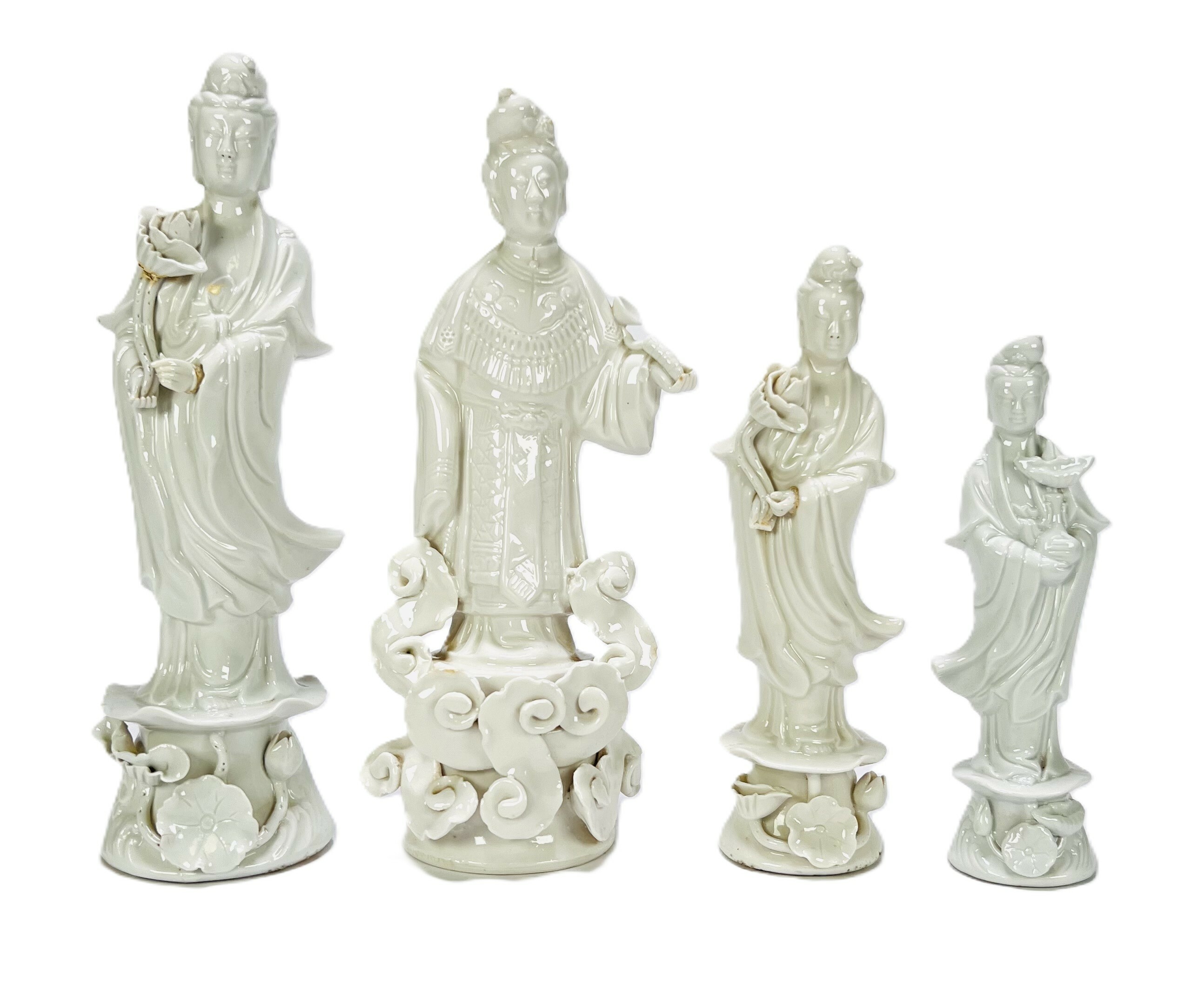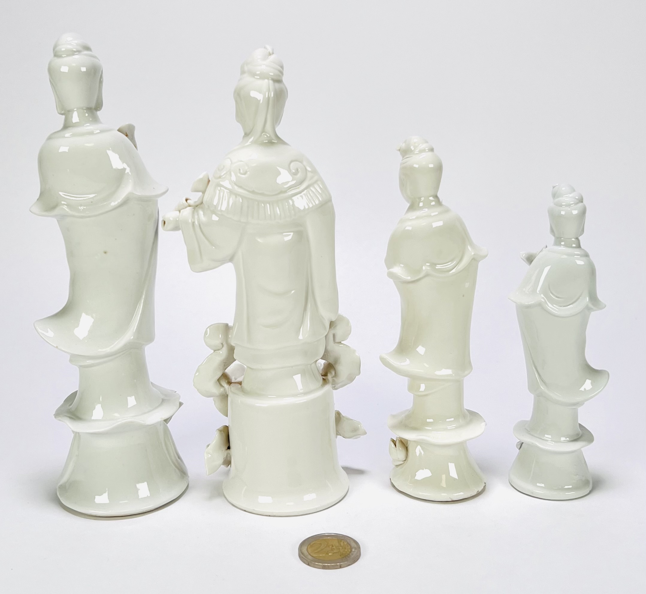 Vier Blanc de Chine porseleinen beelden, vermoedelijk goden of bodhisattva's, daterend uit het begin tot midden 20e eeuw, De beelden zijn uitgevoerd in een helderwit glazuur met gedetailleerde gewaden en attributen zoals lotusbloemen. De beelden, variërend in hoogte, zijn gemerkt met een rood stempelmerk aan de onderzijde. Kom langs tijdens de kijkdagen (29 t/m 31 augustus) en ontdek deze beelden zelf! |