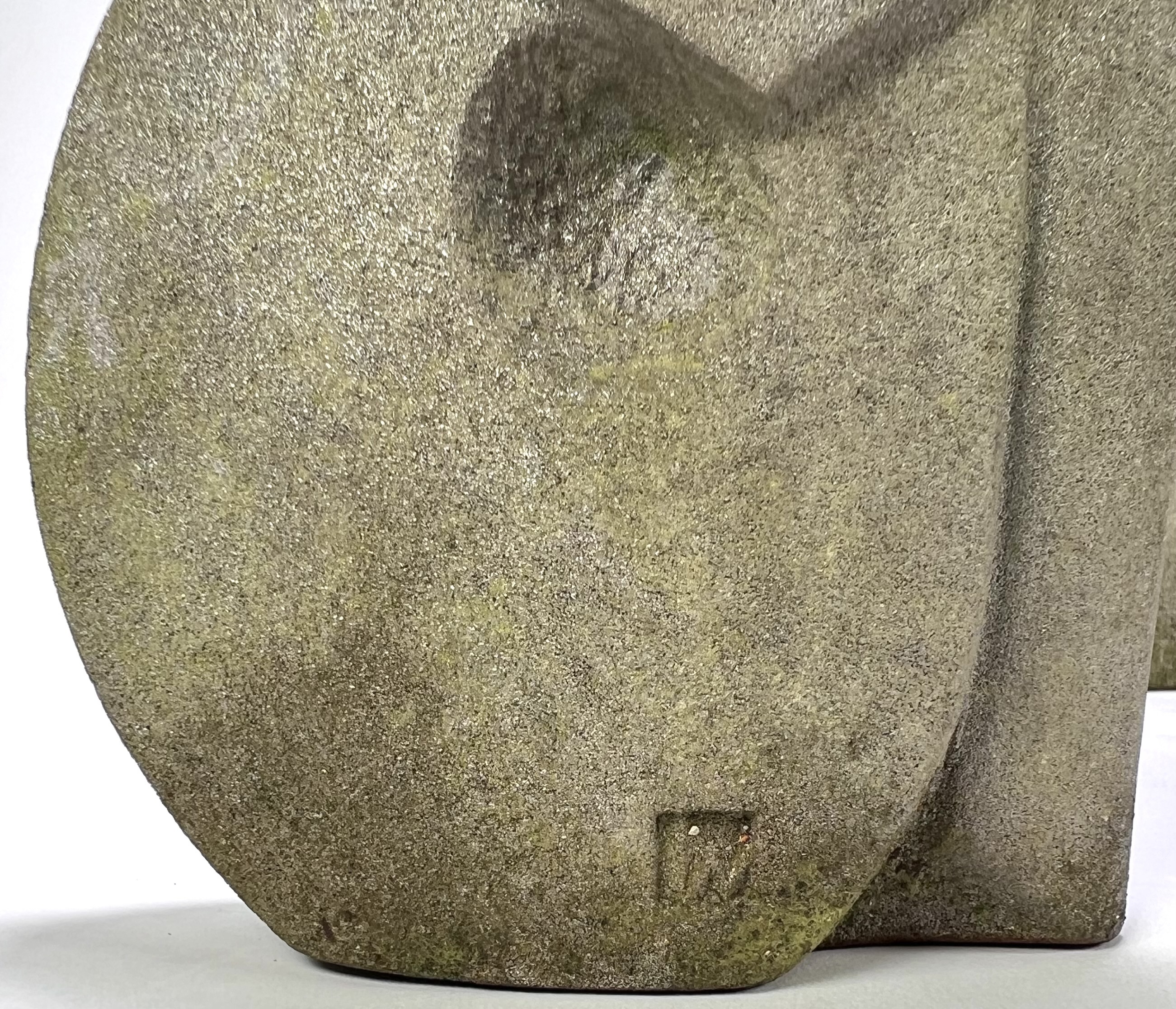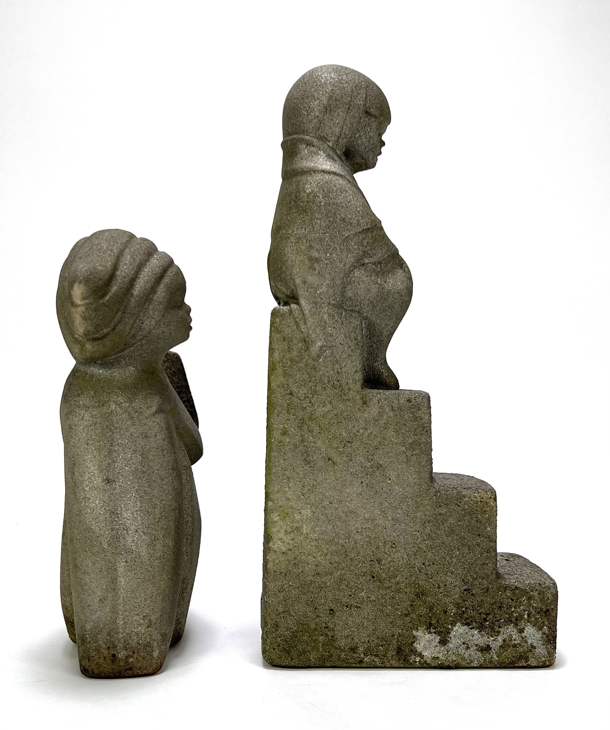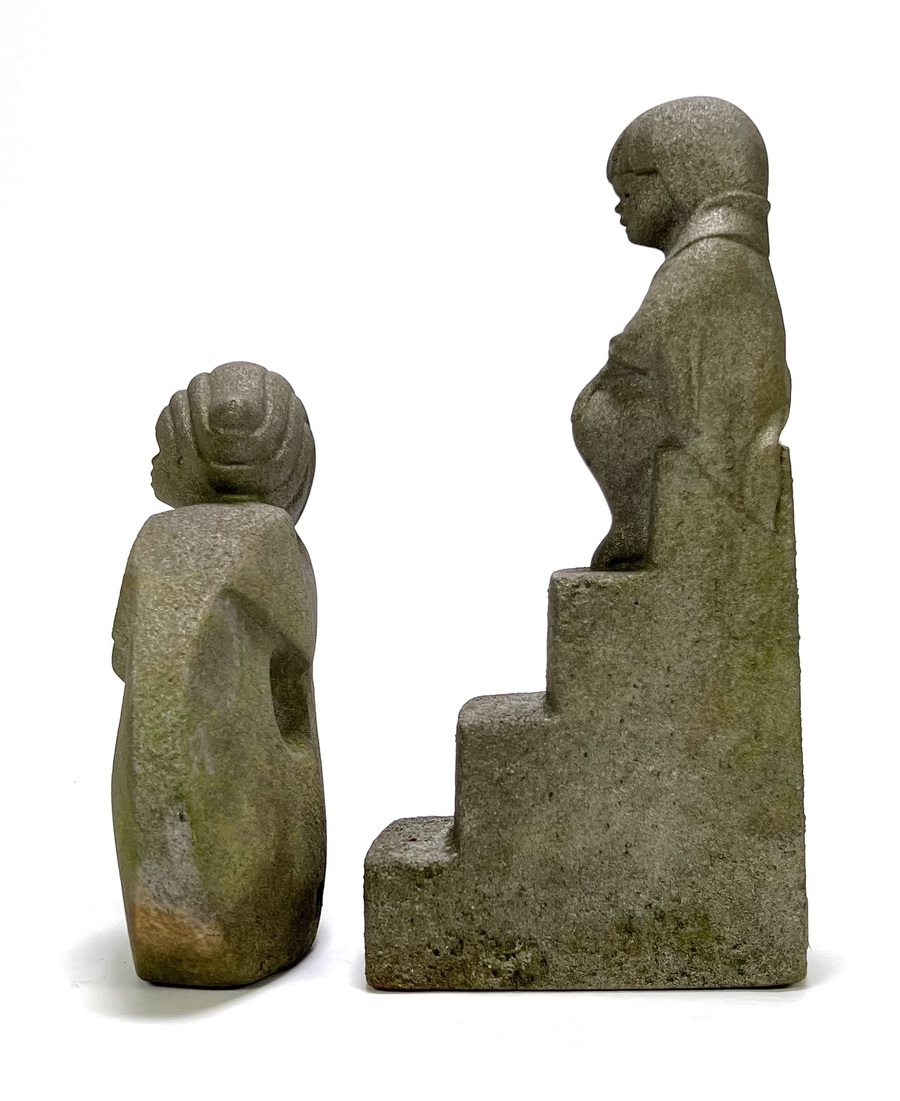 Twee moderne beelden door onbekende maker, midden 20e eeuw, vervaardigd uit geconglomereerd gietsteen. De beelden stellen gestileerde menselijke figuren voor, één zittend op een trap, de ander gehurkt. Eén beeld aan de zijkant initiaal "W". Kom langs tijdens de kijkdagen (29 t/m 31 augustus) en ontdek deze beelden zelf! |