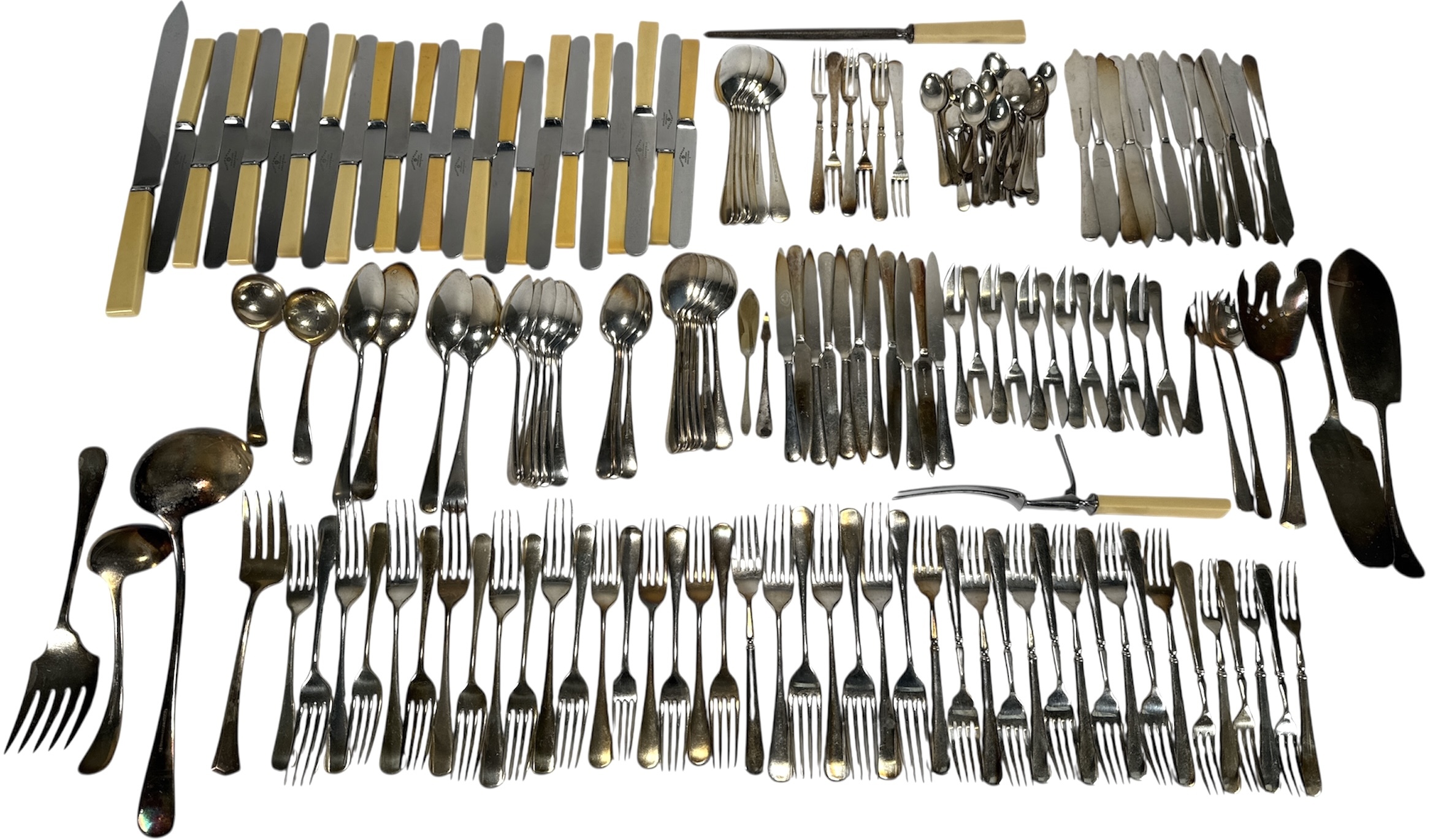 Uitgebreide bestekset van metaal, deels met lichtkleurige heften, bestaande uit tafelmessen, vorken, lepels, dessertbestek en diverse serveeronderdelen. Het bestek heeft een klassiek, tijdloos ontwerp met eenvoudige lijnen en geprofileerde details. Klaar om te bieden? Registreer je nu en doe mee aan de veiling! |
