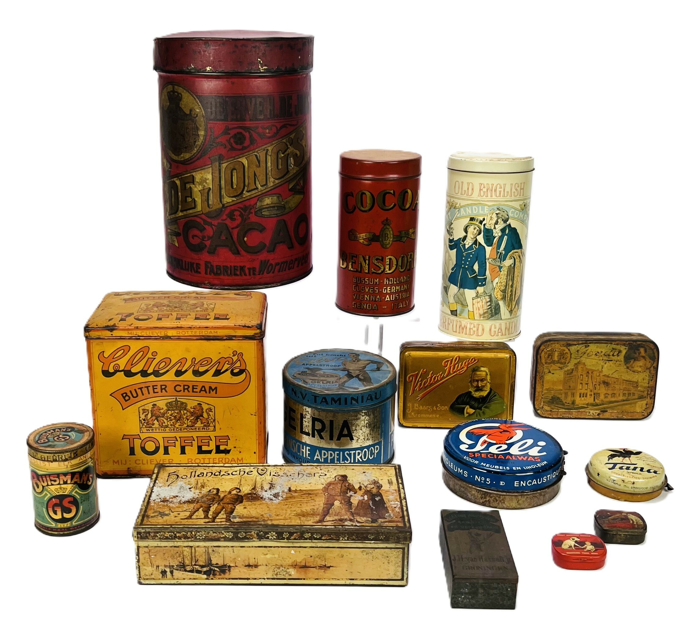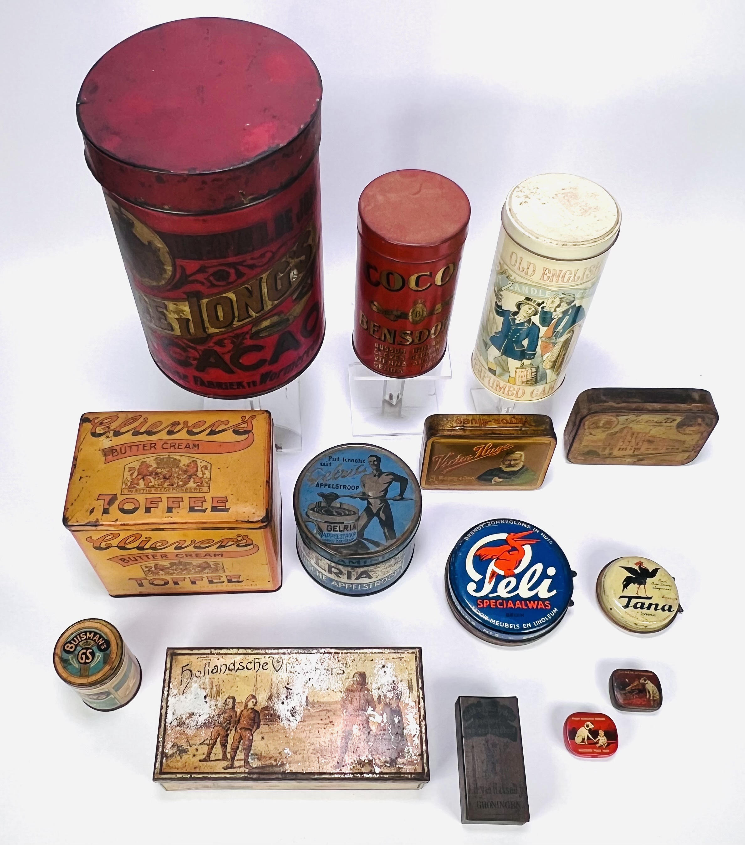 Een verzameling van veertien vintage en antieke blikken, daterend van de laat 19e tot midden 20e eeuw. De blikken, variërend in formaat en vorm, zijn gedecoreerd met diverse afbeeldingen voor producten zoals cacao en toffee. De collectie omvat items van Nederlandse producenten zoals De Jong en Cliver's, inclusief een blik van J.H. van Hasselt jr. uit Groningen. Zelf beoordelen? Je bent welkom op onze kijkdagen op 29, 30 en 31 augustus! |