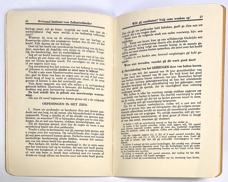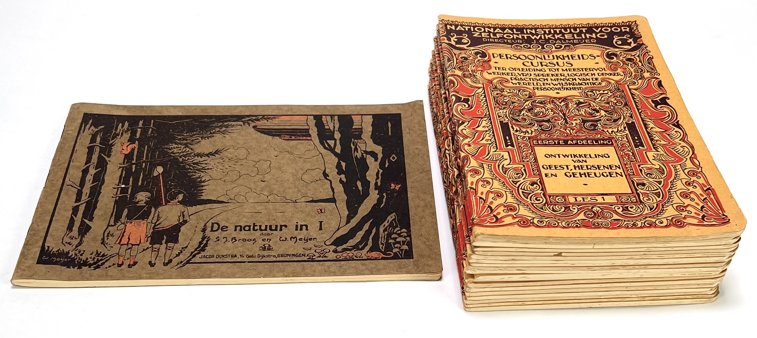 Art Nouveau boekjes uit omstreeks jaren 1920–1930, uitgegeven door het Nationaal Instituut voor Zelfontwikkeling (deel 17 ontbreekt in de serie van 20 ). Omslagen met decoratieve illustraties en typografie, binnenwerk bevat tekst en botanische afbeeldingen zoals korenaren. De set omvat cursussen voor geestelijke ontwikkeling en natuurinzichten. Gedrukt in papier en karton. Hierbij een boekje "De natuur in I" door S.J. Broos en W. Meijer. Registreer nu en bied eenvoudig online mee op deze boeken! |