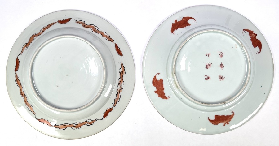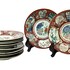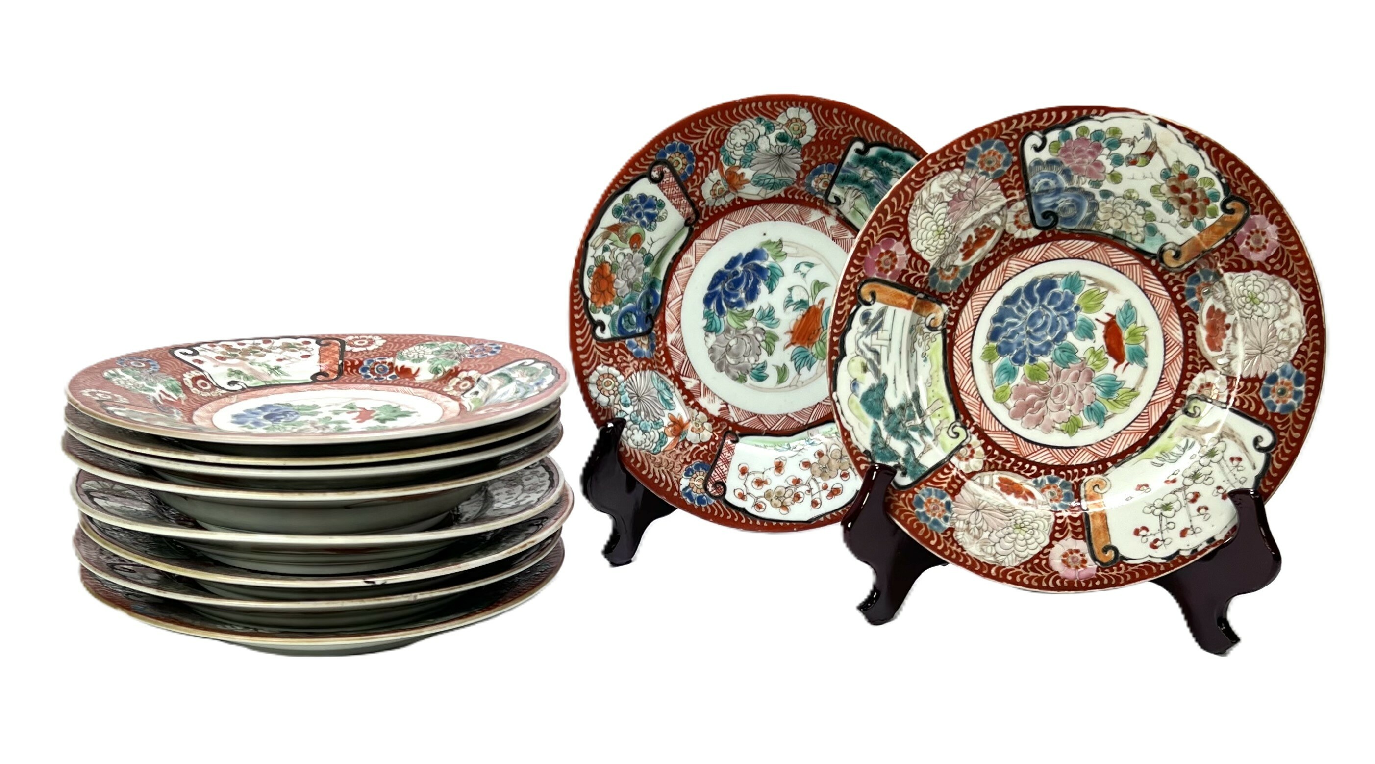 Tien Japanse Kutani porseleinen borden, midden onder gemerkt met zes rode karakters. De borden zijn uitgevoerd in porselein met handbeschilderd polychroom decor met bloemmotieven en panelen met rood, blauw, groen en goud. Op de achterzijde bevinden zich vleermuisdecoraties in rood. Wil je de borden in het echt bekijken? Kom naar de kijkdagen op 29, 30 en 31 augustus! |