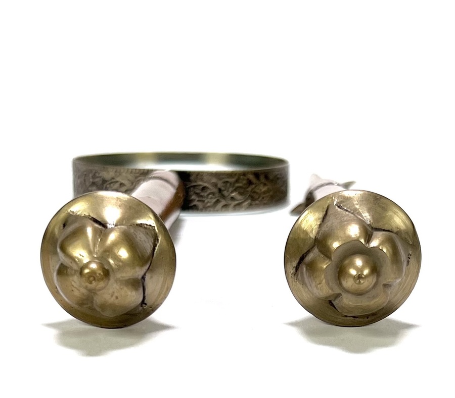 Set van een vergrootglas en briefopener, uitgevoerd omstreeks midden 20e eeuw in messing, hout en glas. Beide objecten hebben gedraaide houten grepen, messing monturen met florale knoppen en gegraveerde details. Het vergrootglas heeft een ronde lens met messing rand, de briefopener een spits lemmet. Kom langs tijdens de kijkdagen (29 t/m 31 augustus) en ontdek deze set zelf! |