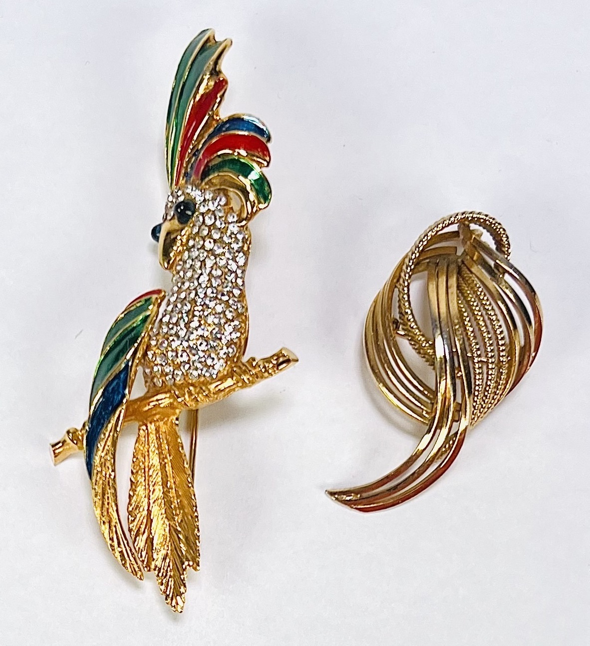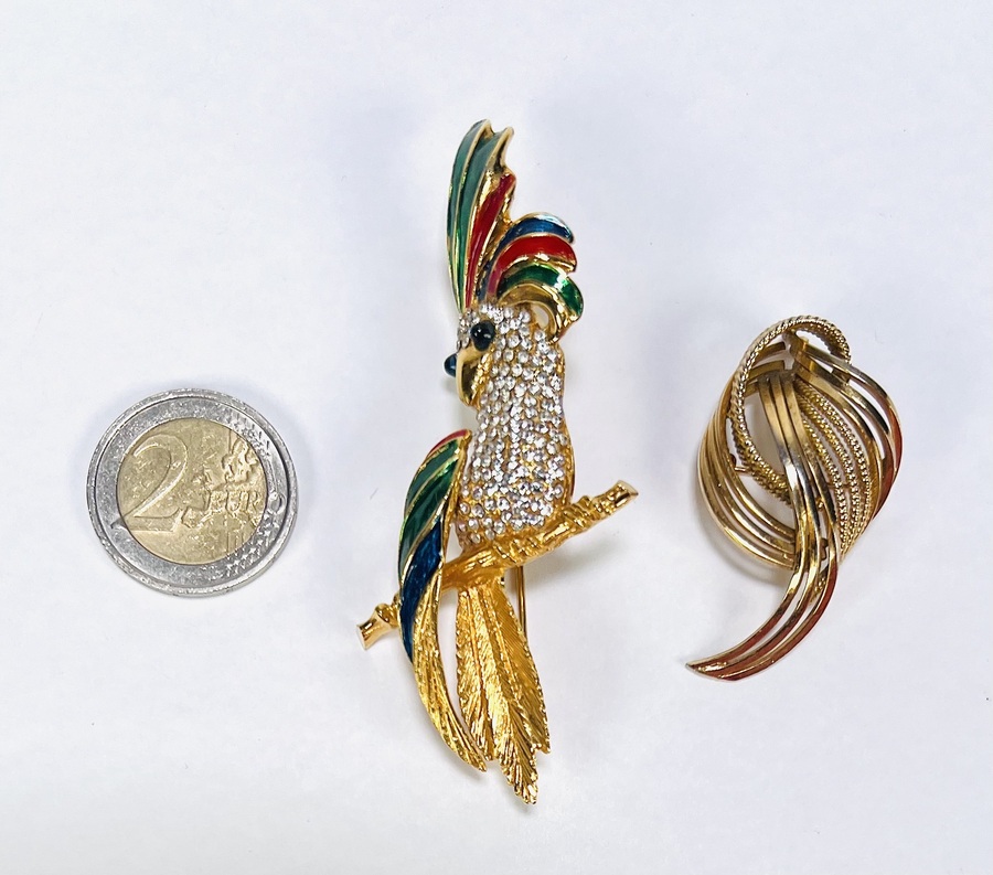 Een vintage set van twee broches. Een figuratieve kaketoe-broche van Carven, circa 1950-1970, van verguld metaal met strass-steentjes en kleurrijk emaille. Gemerkt "CARVEN 169 MODÈLE DÉPOSÉ" op de achterzijde. De tweede broche, van Grosse, gedateerd 1967, is abstract gevormd van verguld metaal met gelaagde, vloeiende lijnen. Gemerkt "GROSSE 67 GERMANY" op de achterzijde. Klaar om te bieden? Registreer je nu en doe mee aan de veiling! |