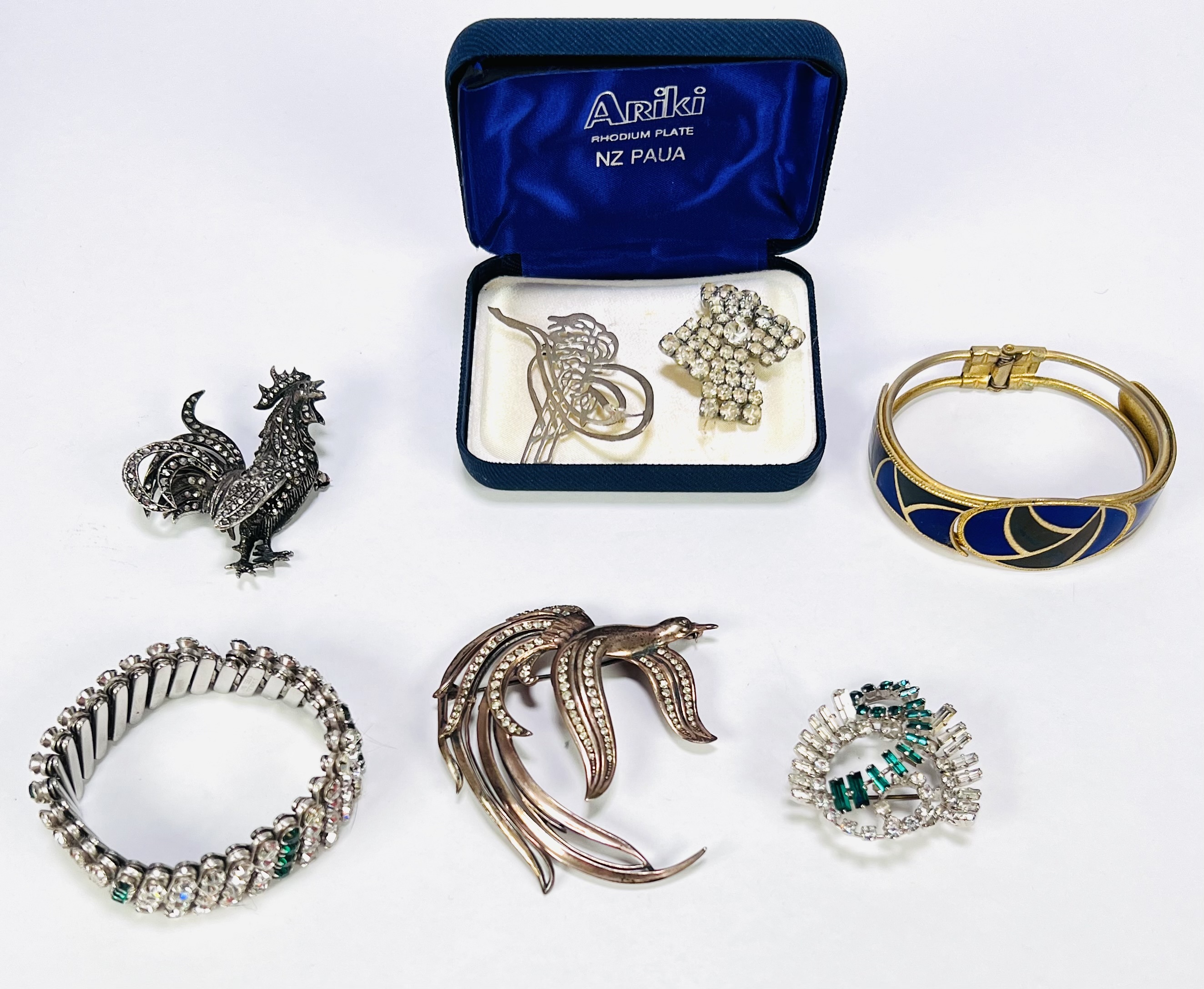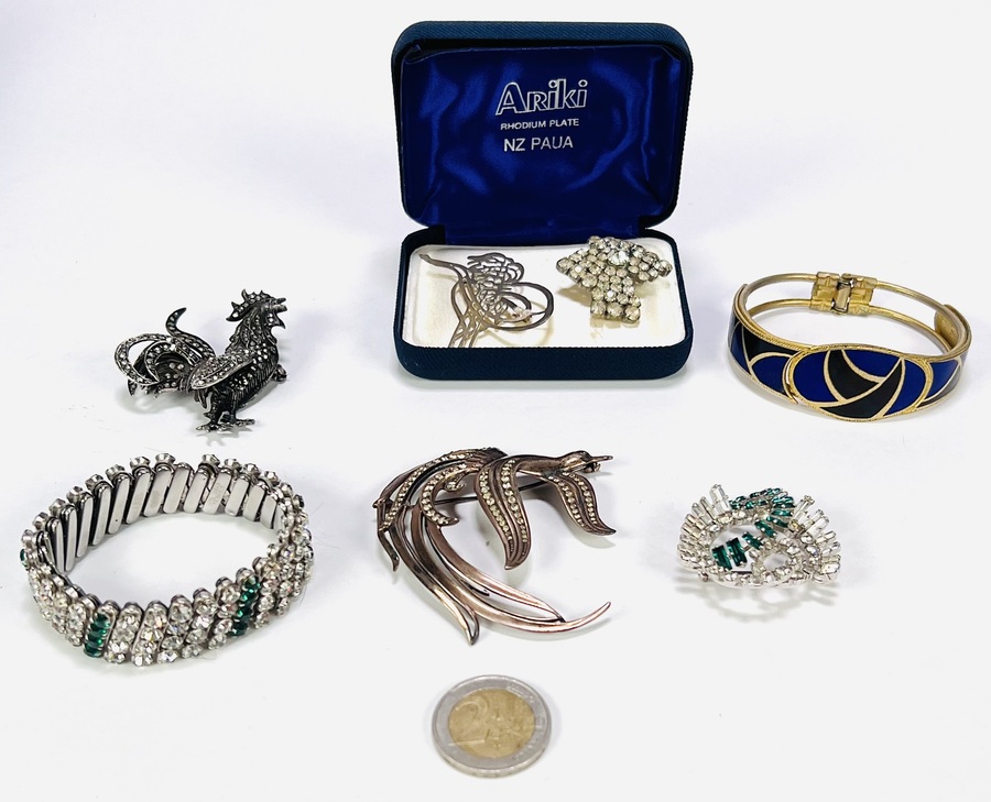 Diverse sieraden daterend uit de 20e eeuw in eclectische stijl bestaande uit broches, armbanden, oorbellen en een hanger. Gemaakt uit diverse metalen met emaille, strass en imitatiestenen. Klaar om te bieden? Registreer je nu en doe mee aan de veiling! |