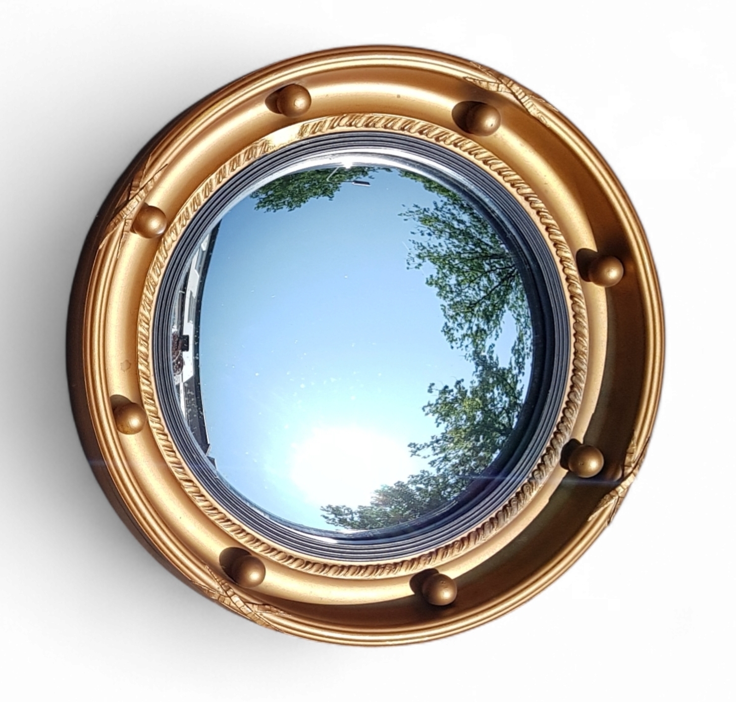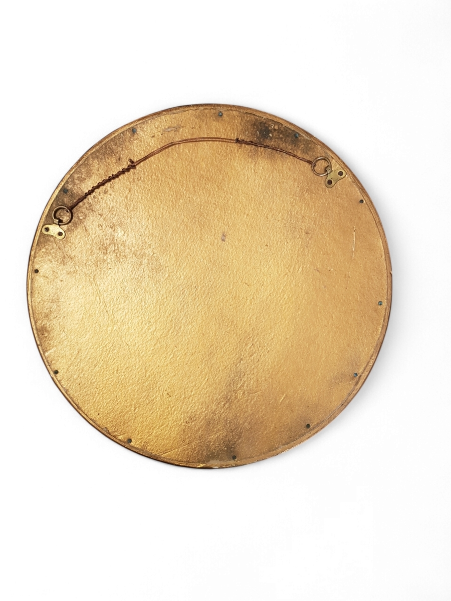 Butlerspiegel uit omstreeks midden 20e eeuw, uitgevoerd met goudkleurige houten lijst en convex spiegelglas. De lijst toont een decoratie met koord- en bolornamenten, typerend voor de empire stijl. Aan de achterzijde bevindt zich een metalen ophangsysteem met draad. Eerst zien voordat je biedt? Bezoek onze kijkdagen op 29, 30 en 31 augustus van 11:00 tot 17:00 uur. |