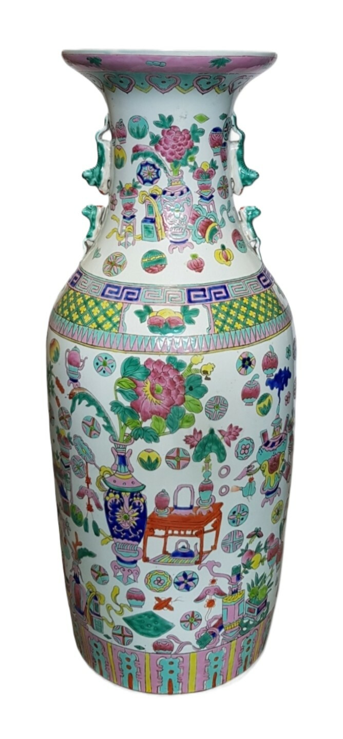Chinese famille rose vaas, 20e eeuw. Uitgevoerd in porselein met meerkleurige beschildering van bloemen, vazen en symbolische objecten. De langgerekte vaas heeft drakenhandgrepen en een brede uitlopende rand. Wil je deze vaas in het echt bekijken? Kom naar de kijkdagen op 29, 30 en 31 augustus! |