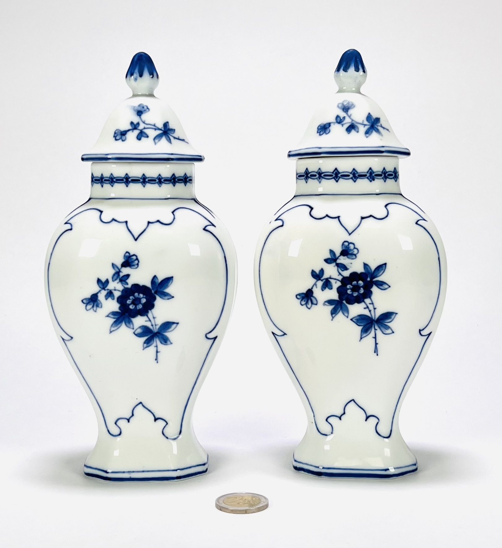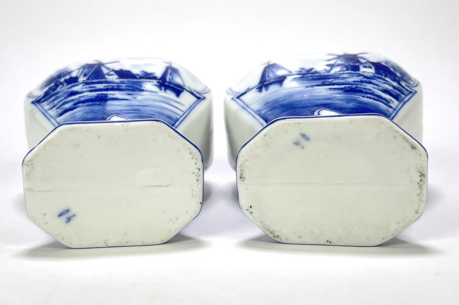 Delfts blauwe porseleinen dekselvazen daterend uit midden 20e eeuw (circa 1940-1970). De vazen hebben een baluster-vorm met achthoekige basis en zijn handgeschilderd met Nederlandse landschappen, molens en zeilboten. De vazen zijn voorzien van bijpassende deksels en decoratieve patronen, kenmerkend voor de stijl. Gemerkt op de onderzijde. Klaar om te bieden op deze dekselvazen? Registreer je nu en doe mee aan de veiling! |