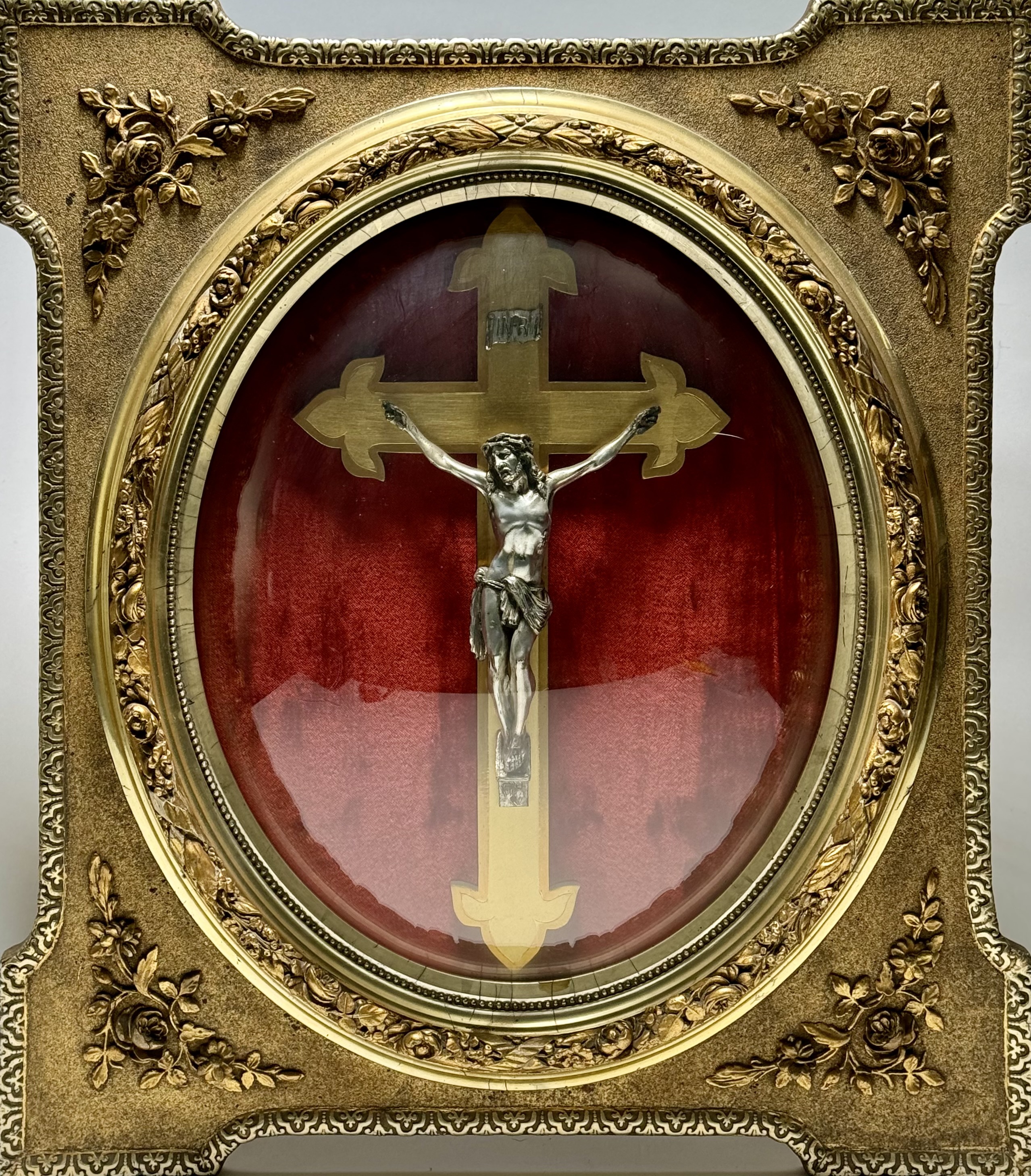 Deels vergulde houten crucifix met verzilverde corpus, bevestigd op een houten kruis met gestileerde uiteinden, geplaatst in een rijk gedecoreerde neobarokke lijst met ovaal glas en roodfluwelen achtergrond. Rond 1900 uitgevoerd in gesneden hout met deels vergulding en gegoten metaal, decoratief voorzien van bloemornamenten in reliëf.