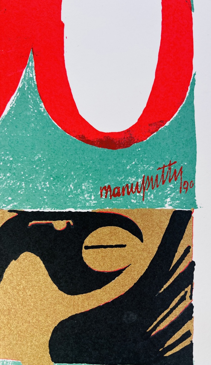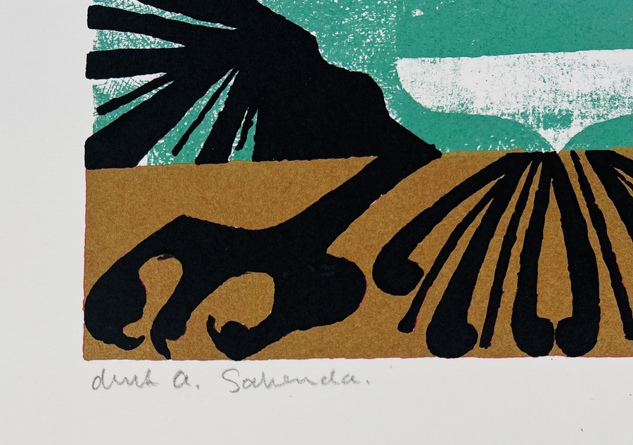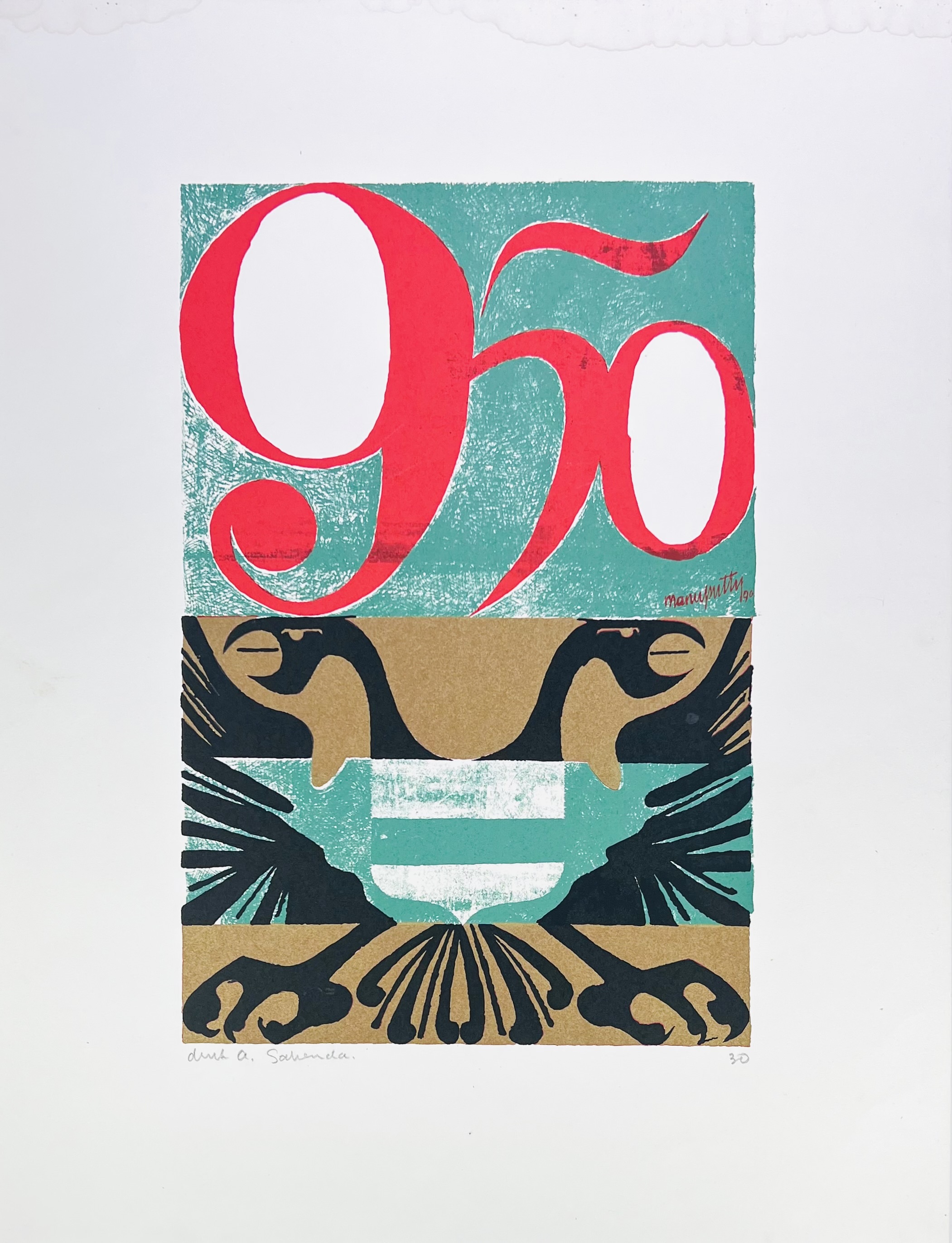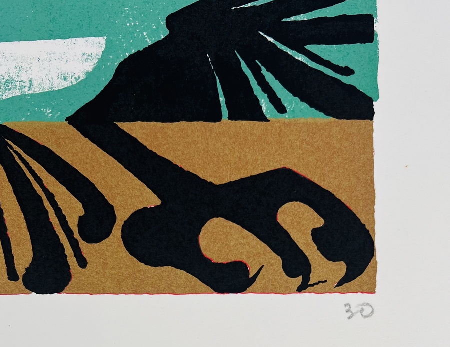 Een abstracte zeefdruk van Ruloff S.A. Manuputty (1926–2002) uit 1990, uitgevoerd in heldere kleuren. Het werk combineert de cijfers 950 met een symmetrisch grafisch element in zwart, turquoise en goud. De prent is gedrukt met scherpe contouren en egale kleurvlakken. Gesigneerd rechtsboven en linksonder vermelding druk A. Sahenda en rechtsonder oplagenummer 30 Deze zelfdruk zelf beoordelen? Je bent welkom op onze kijkdagen op 29, 30 en 31 augustus! |