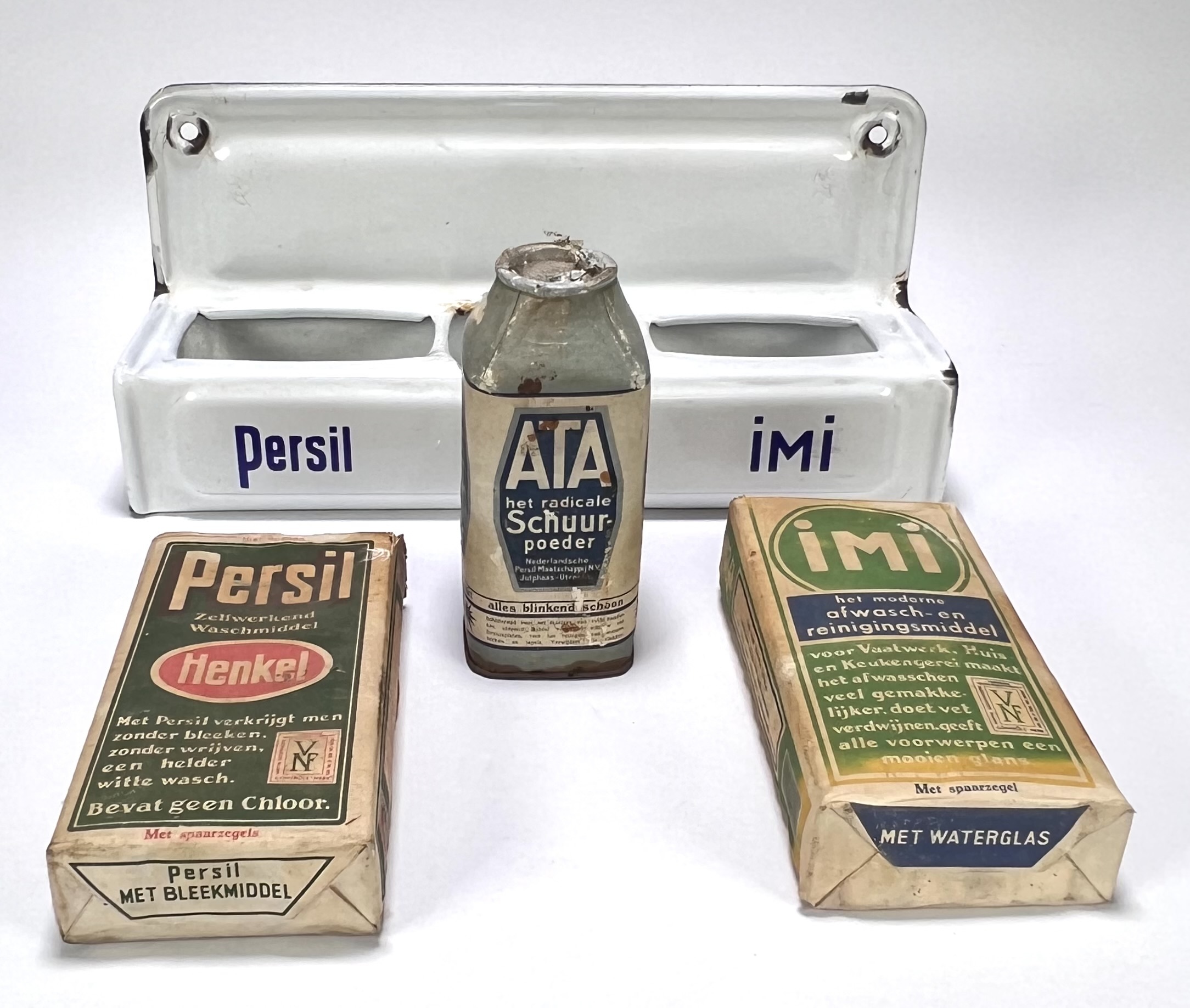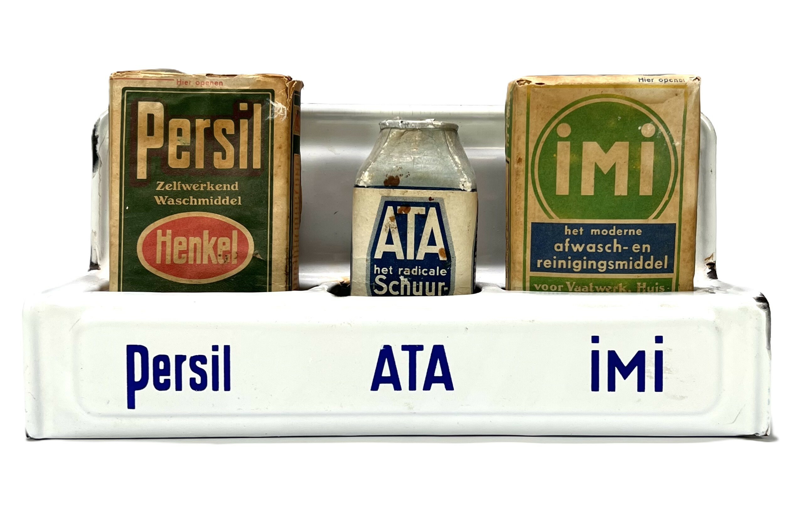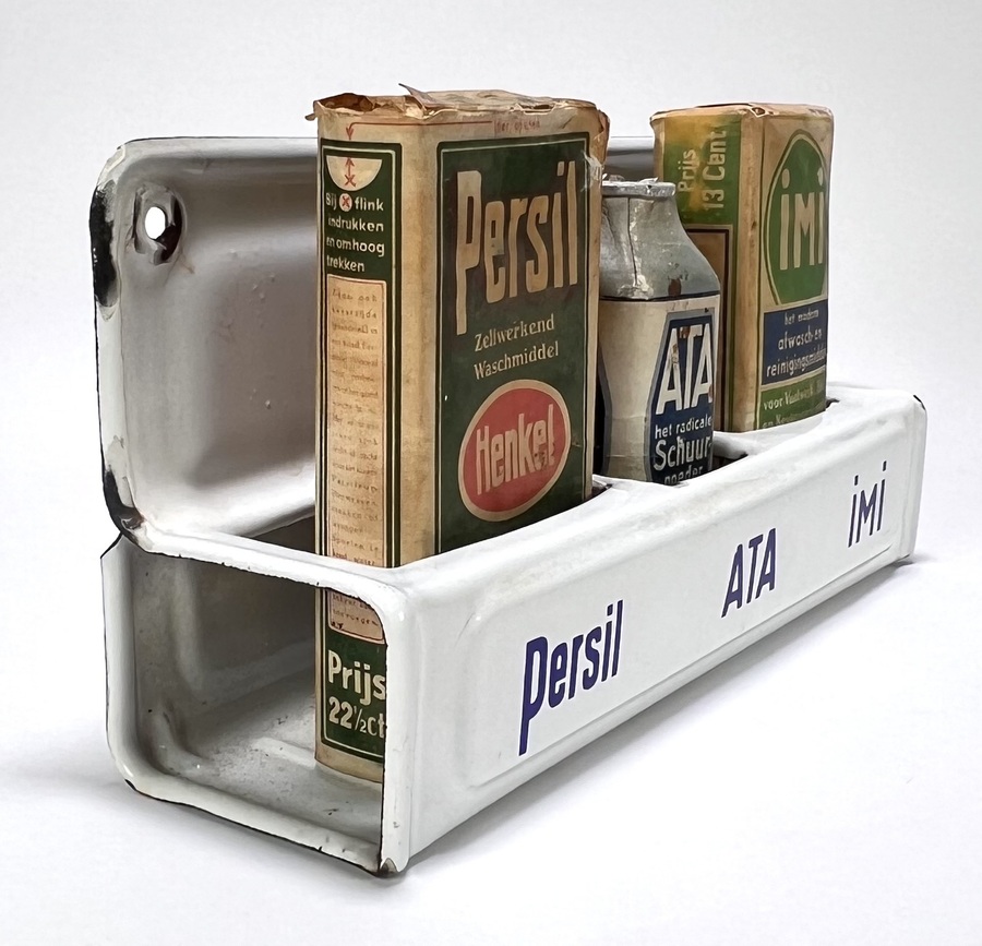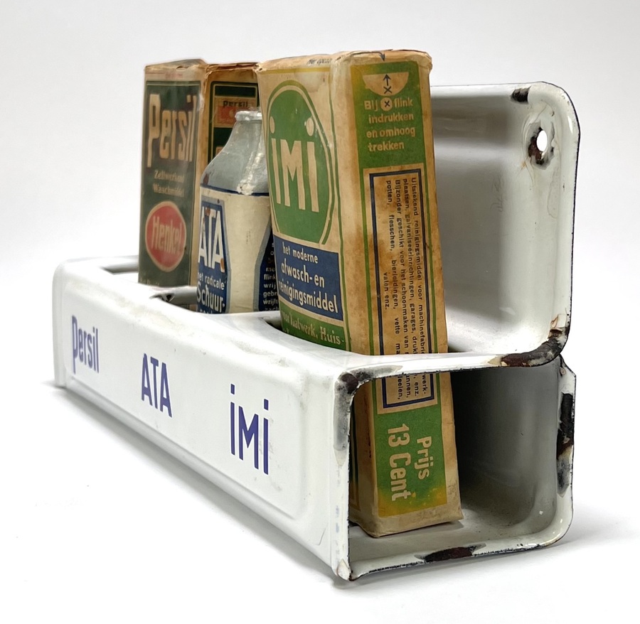 Vintage emaille rek vervaardigd uit geëmailleerd metaal, met wandophangsysteem en kobaltblauwe belettering voor Persil, ATA en imi. Uitgevoerd met drie compartimenten waarin originele verpakkingen zijn geplaatst. Typisch voor midden 20e-eeuwse huishoudstijl, vervaardigd circa 1950. De toegepaste techniek is emailleren op plaatstaal. Functioneel ontwerp met afgeronde vormen en heldere merktypografie, bedoeld voor huishoudelijk of winkelgebruik. Registreer nu en bied eenvoudig online mee op dit emaille rek!