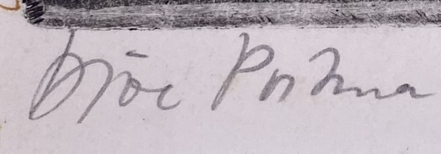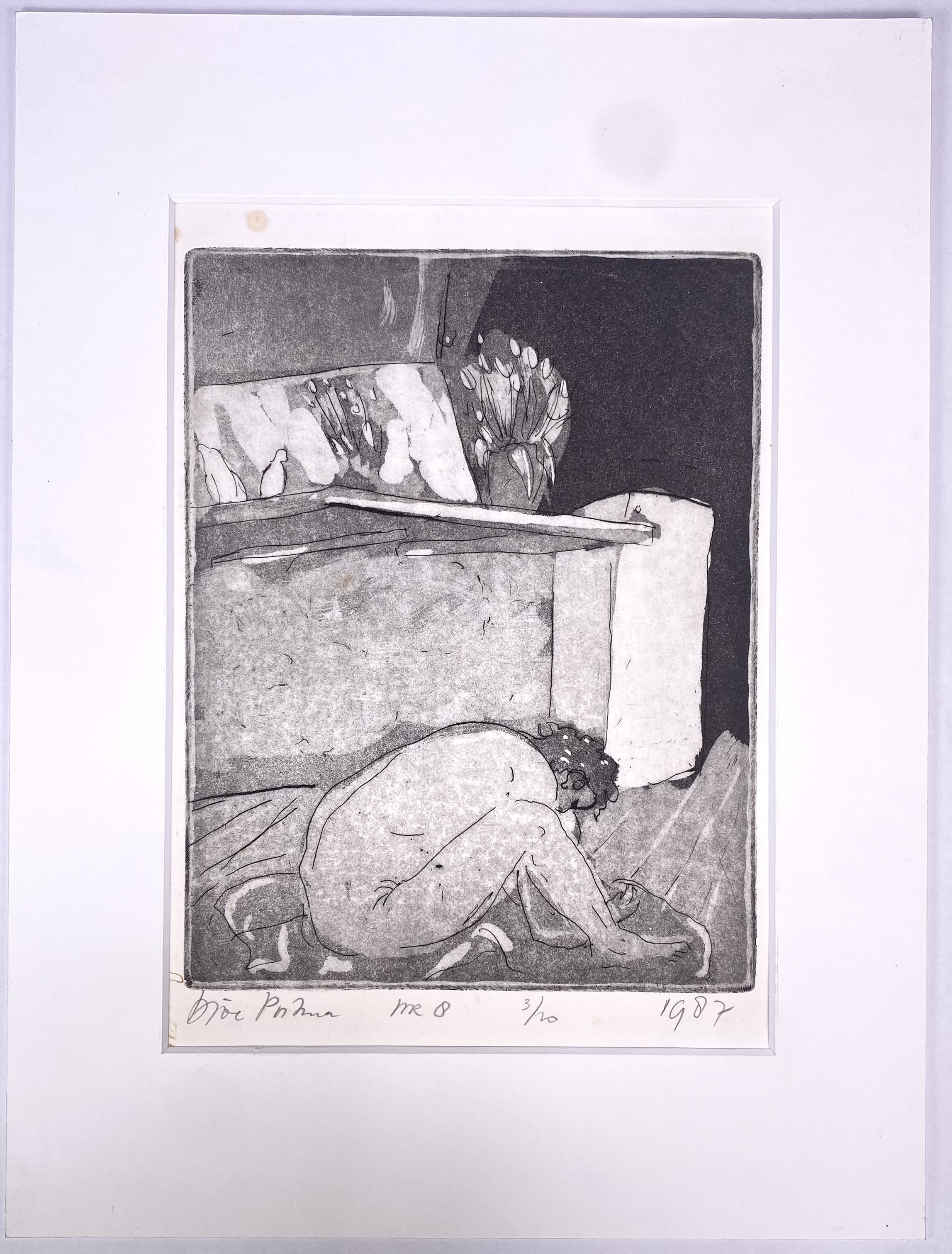 Ets met potlood linksonder onduidelijk gesigneerd, midden onder getiteld “mr 8” en oplagenummer 3/20., rechtsonder gedateerd 1987. Uitgevoerd op papier in expressieve stijl met een naakte, ineengedoken figuur in een interieur. De ingetogen scène en de moderne lijnvoering geven het werk een introspectief karakter. |