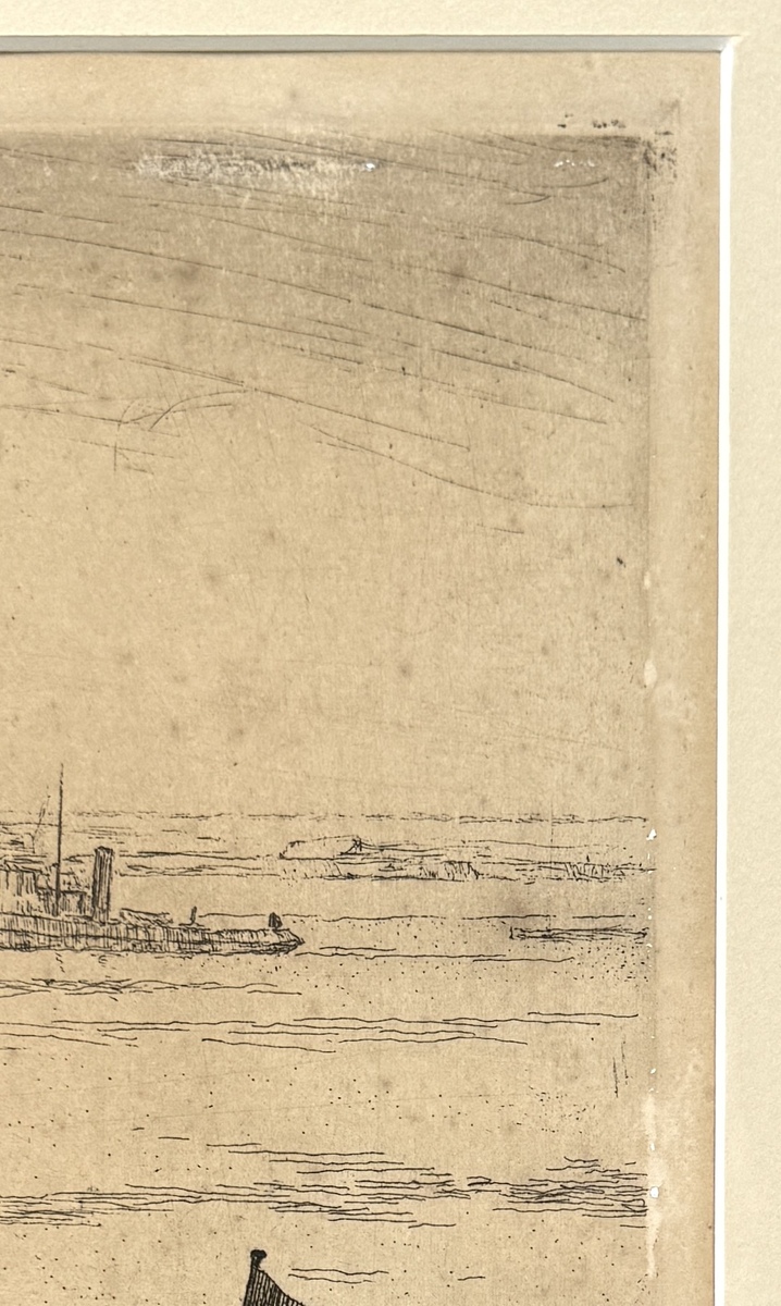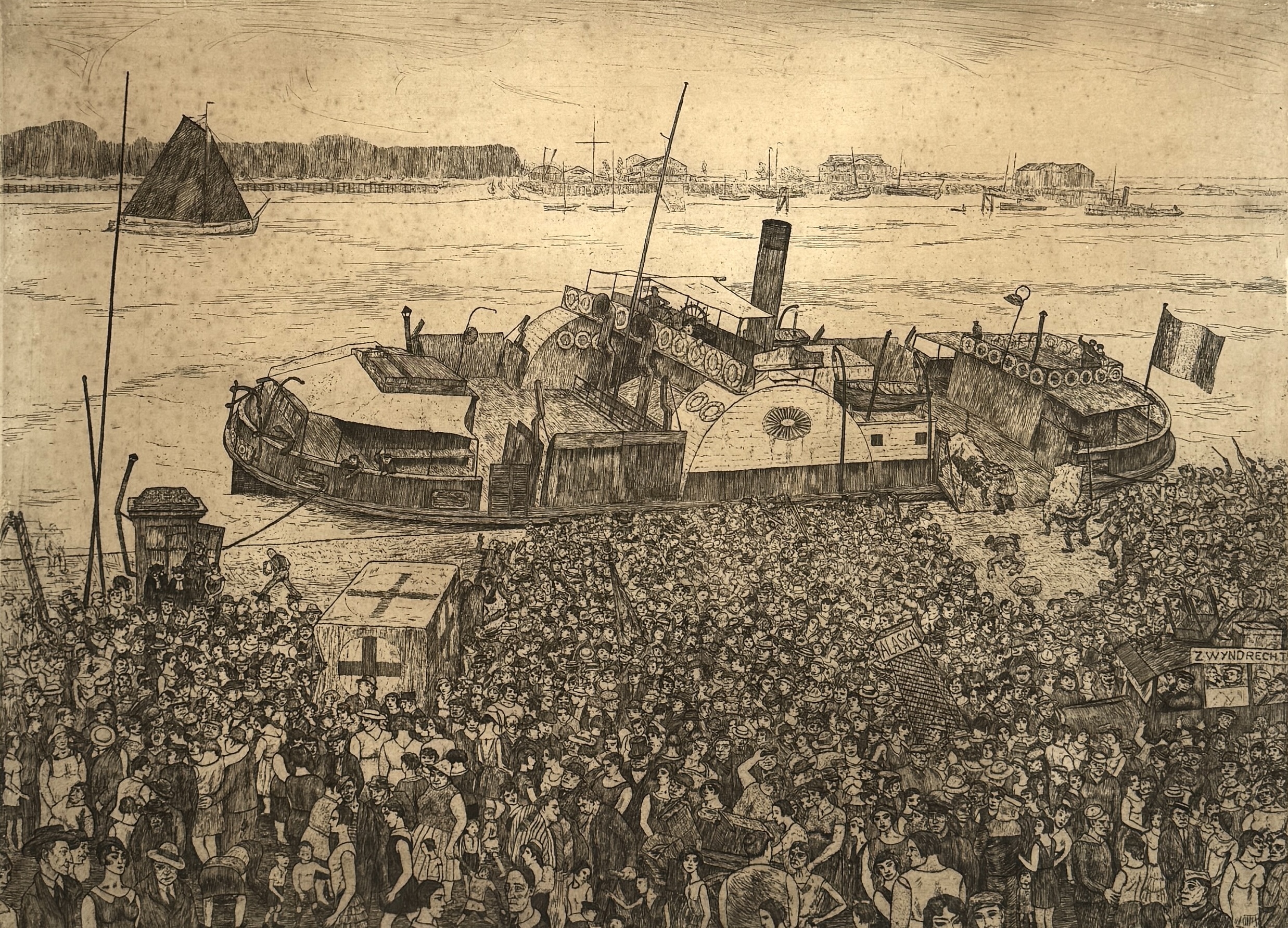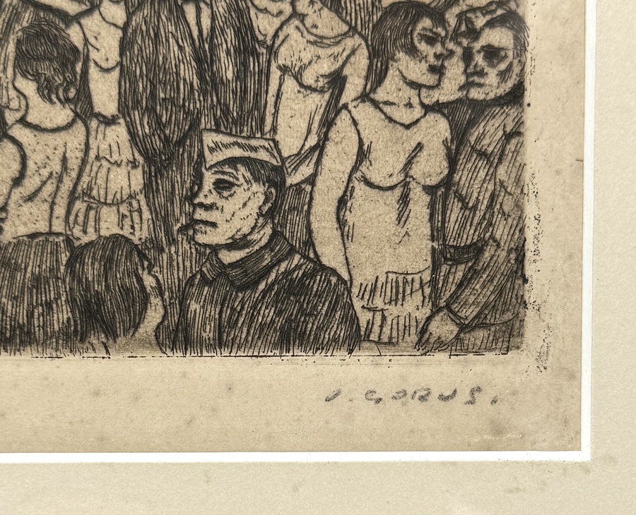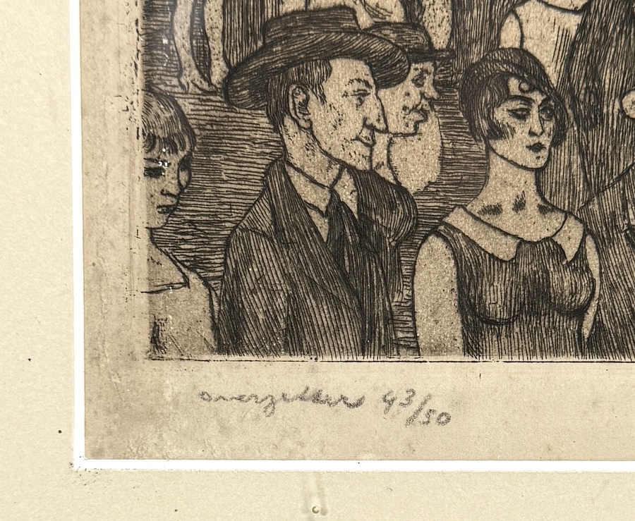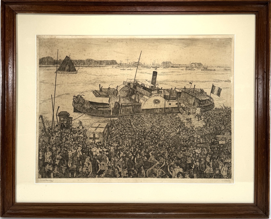 Ets van Jacques Gorus (1901–1981), midden 20e eeuw. Voorstelling van de veerboot aan Sint-Anneke te Antwerpen met een massale mensenmenigte en stadsdecor. Rechtsonder met potlood gesigneerd: J. Gorus, linksonder oplagenummer 43/50. Uitgevoerd op papier met fijne lijnvoering. In expressieve figuratieve stijl met sociaal-realistische invloeden. Inclusief boekje over de kunstenaar. Zelf beoordelen? Je bent welkom op onze kijkdagen op 29, 30 en 31 augustus! |