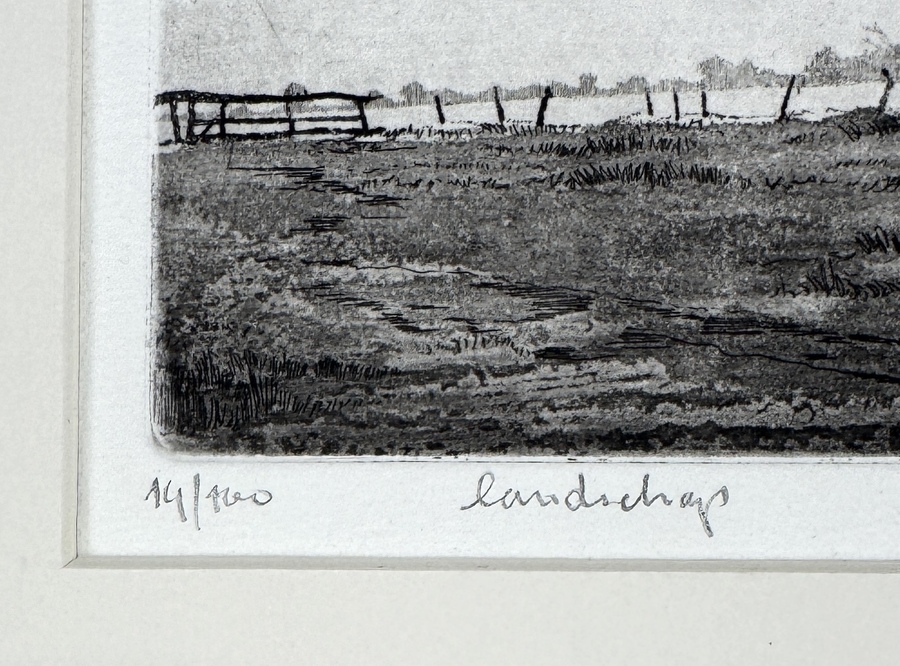 Ets door Warner Hemstede (1945), getiteld “landschap”, uitgevoerd op papier in realistische stijl. Voorstelling van een kaal bomenrijtje in een polderlandschap met boerderijen in de verte. Uitgevoerd in zwart-wit met verfijnde lijnvoering. Linksonder voorzien van oplagenummer 14/100, midden onder getiteld, rechtsonder met potlood gesigneerd. Vervaardigd omstreeks eind 20e eeuw. Zeker zijn van deelname? Plaats vanaf 22 augustus een schriftelijk bod online! |