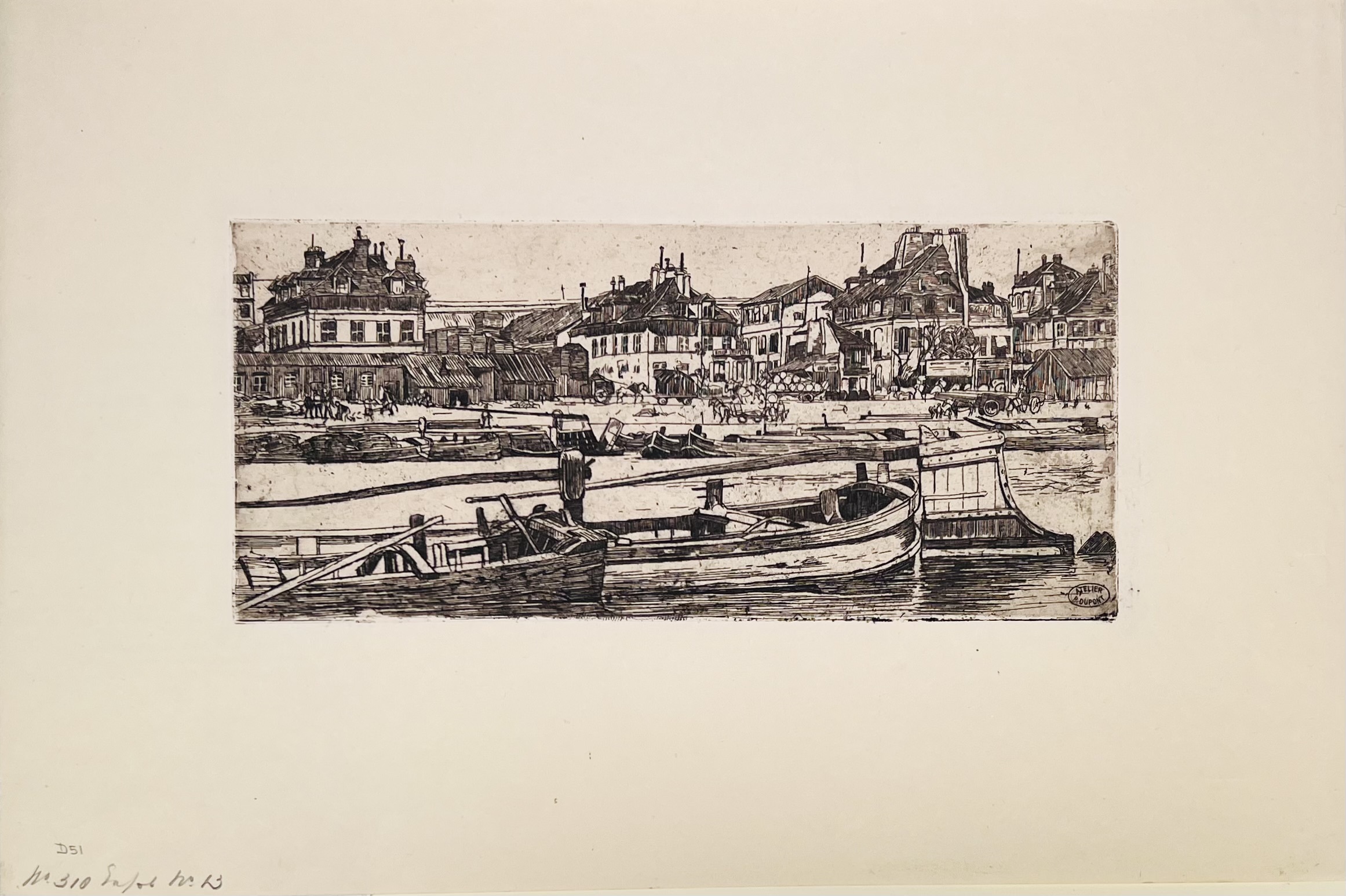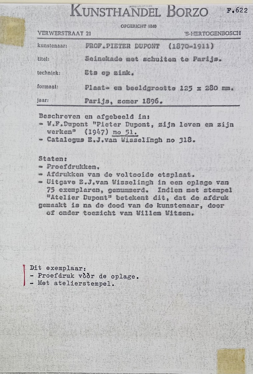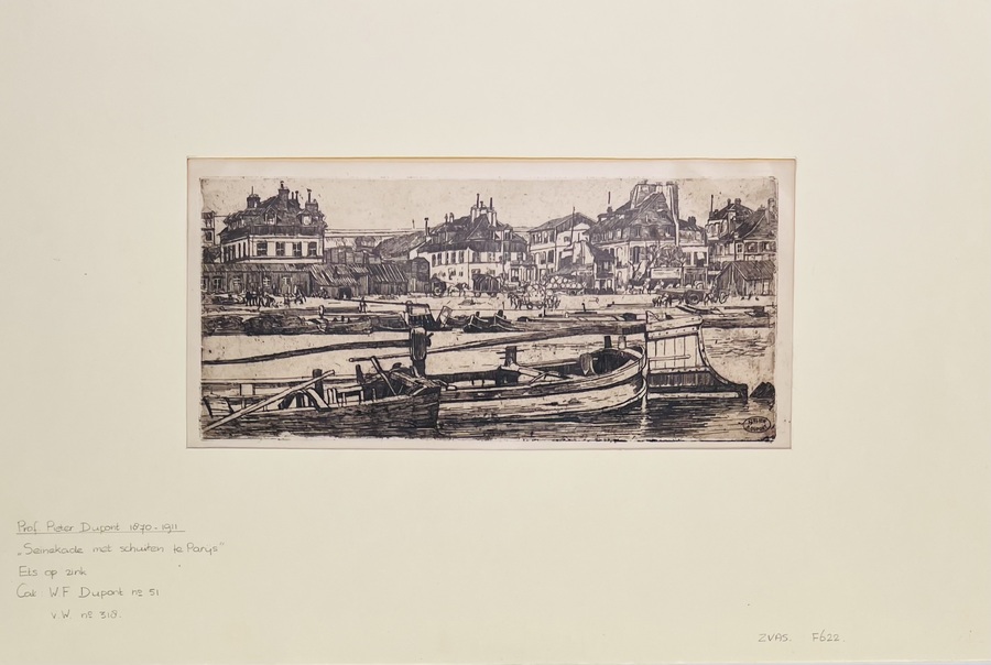 | Kavelnummer en naam | 622. Ets Prof. Pieter Dupont, “Seinekade met schuiten te Parijs”, 1896 | |