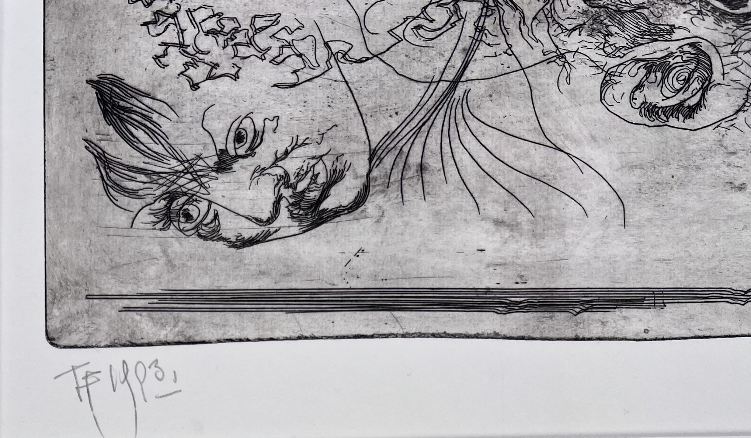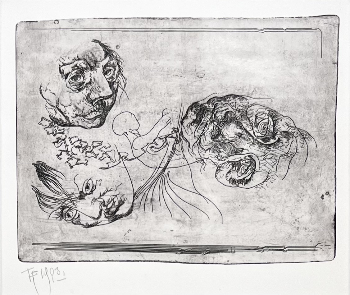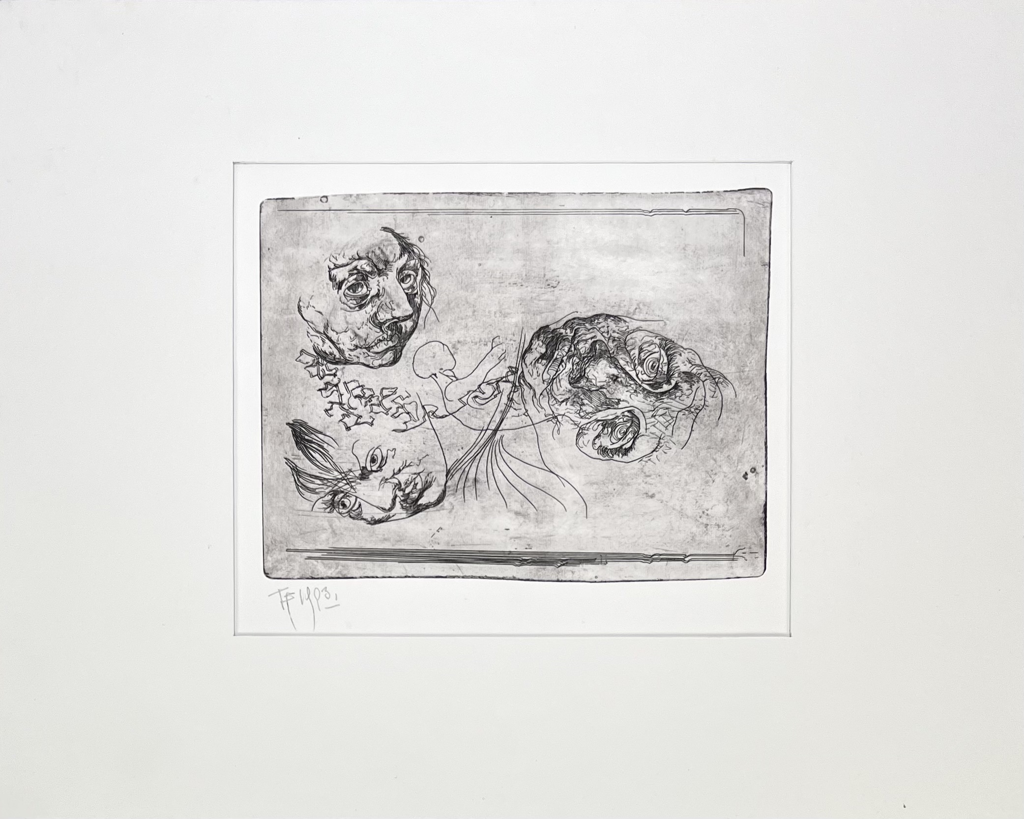 Ets van Theo Forrer (1923–2004), uitgevoerd in zwart op wit papier. Het werk toont een surrealistische compositie met expressief vervormde hoofden en lineaire verbindingsstructuren. Linksonder gesigneerd T. Forrer en gedateerd 1983. Gedrukt binnen zichtbare plaatranden met decoratieve accenten. De stijl is grafisch en introspectief, met nadruk op lijnvoering en emotionele vervreemding. Klaar om te bieden? Registreer je nu en doe mee aan de veiling! |