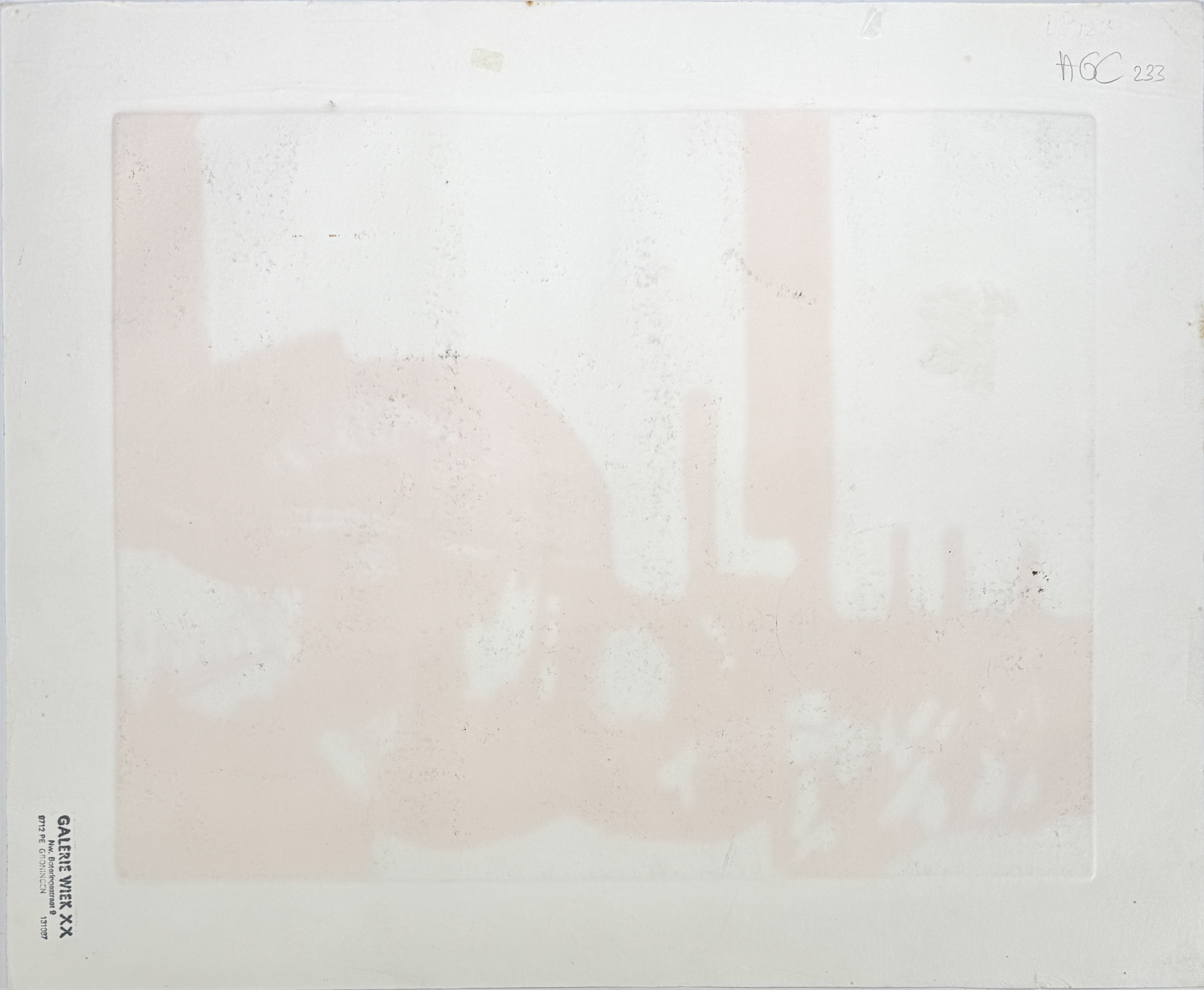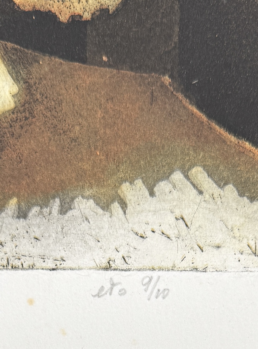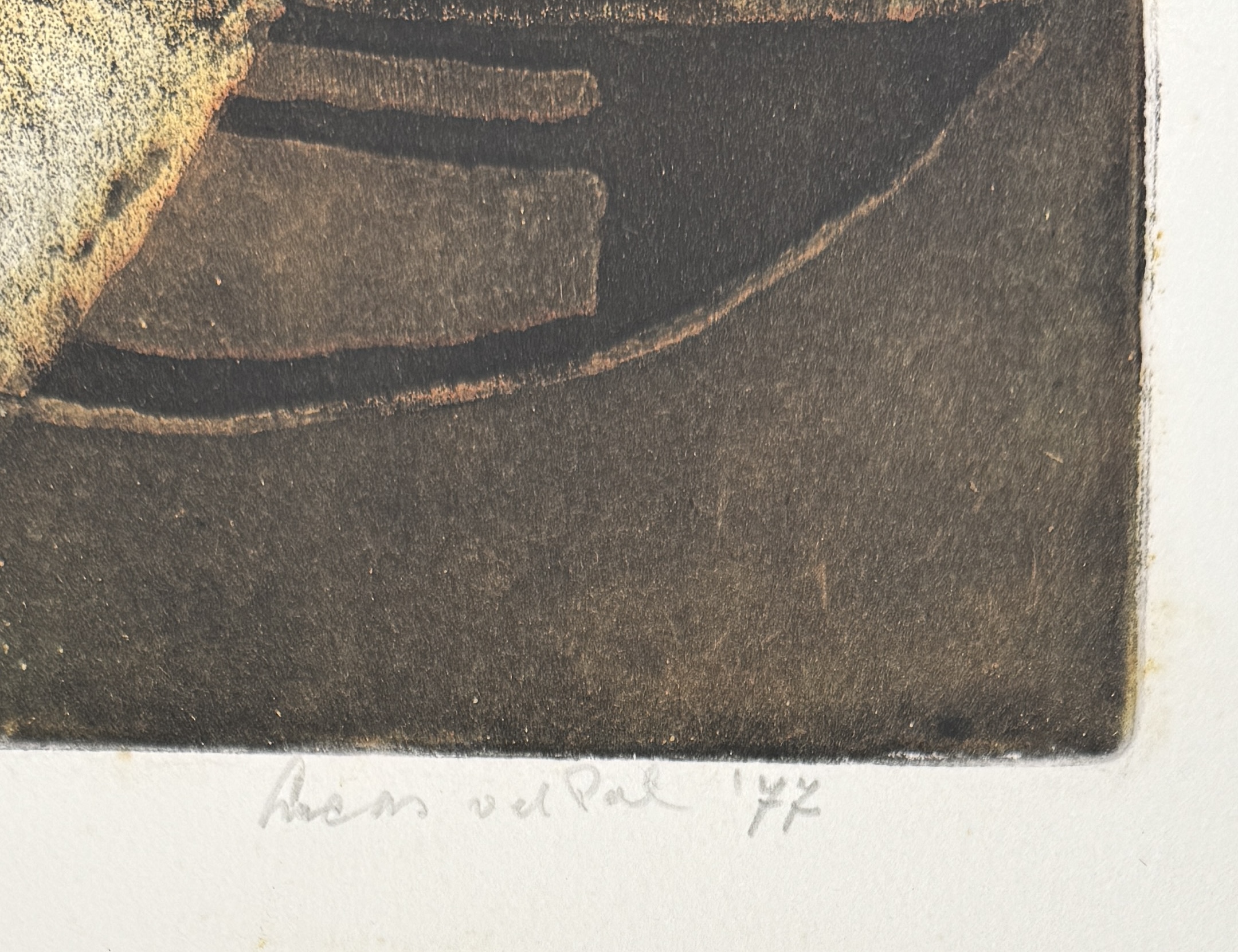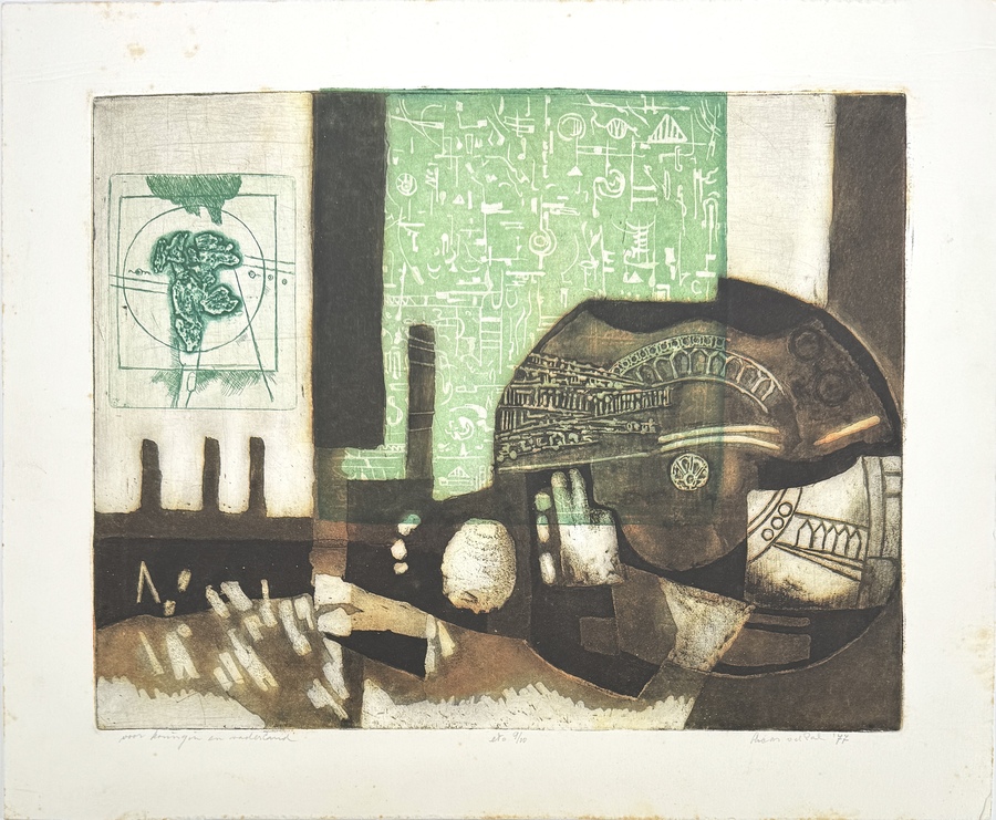 Een ets met aquatint van Lucas van der Pol (1935-2014), gedateerd 1977. Het werk is abstract met architectonische en organische elementen in diverse texturen en kleuren. Het toont onder andere een schijfvormig element, een groen vlak met symbolen, en een organisch patroon. Getiteld "voor koningin en vaderland" linksonder, gesigneerd Lucas v.d. Pol en gedateerd 1977 rechtsonder, met oplagenummer 9/10 midden onder. Ontdek deze ets en voeg het toe aan jouw collectie! Registreer nu voor de veiling. |