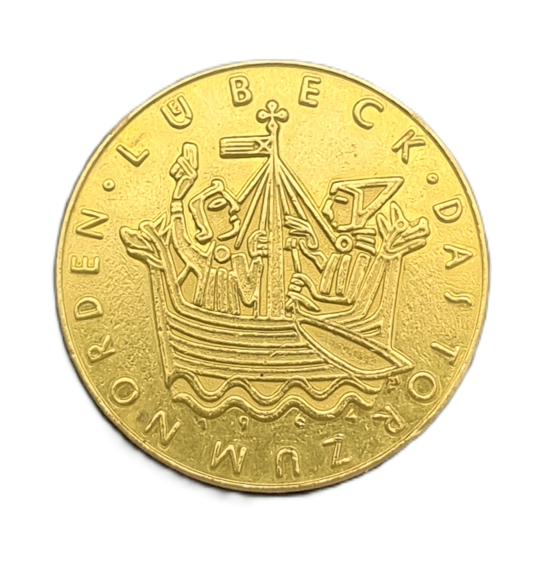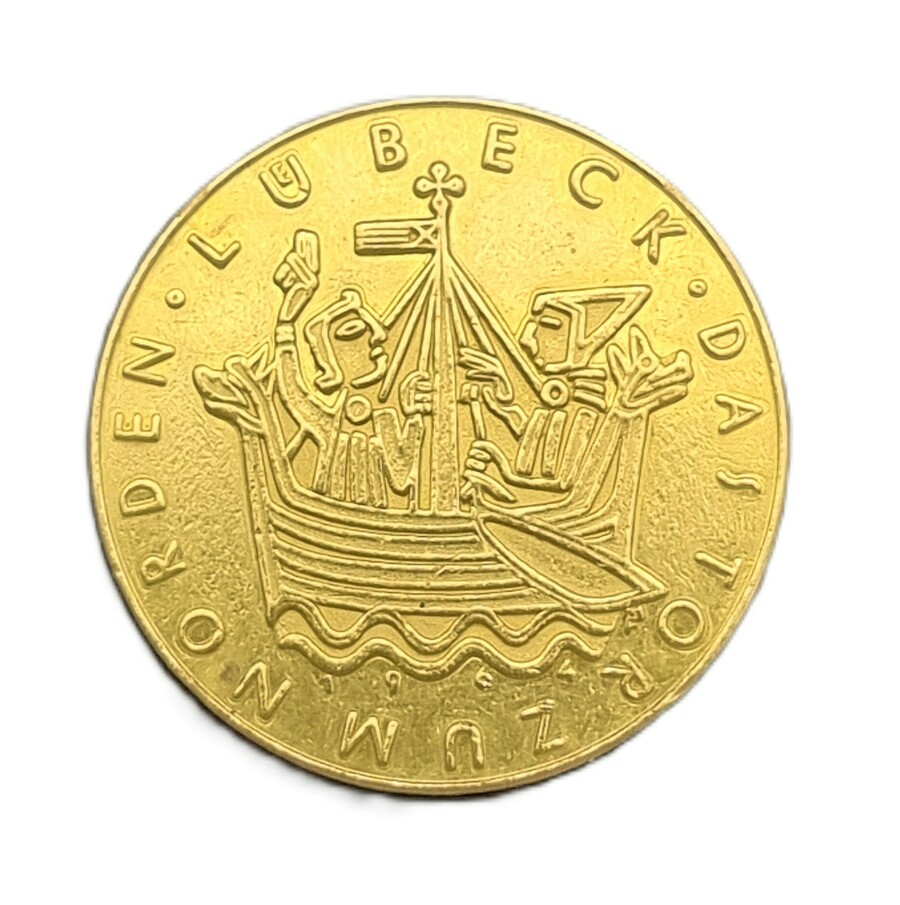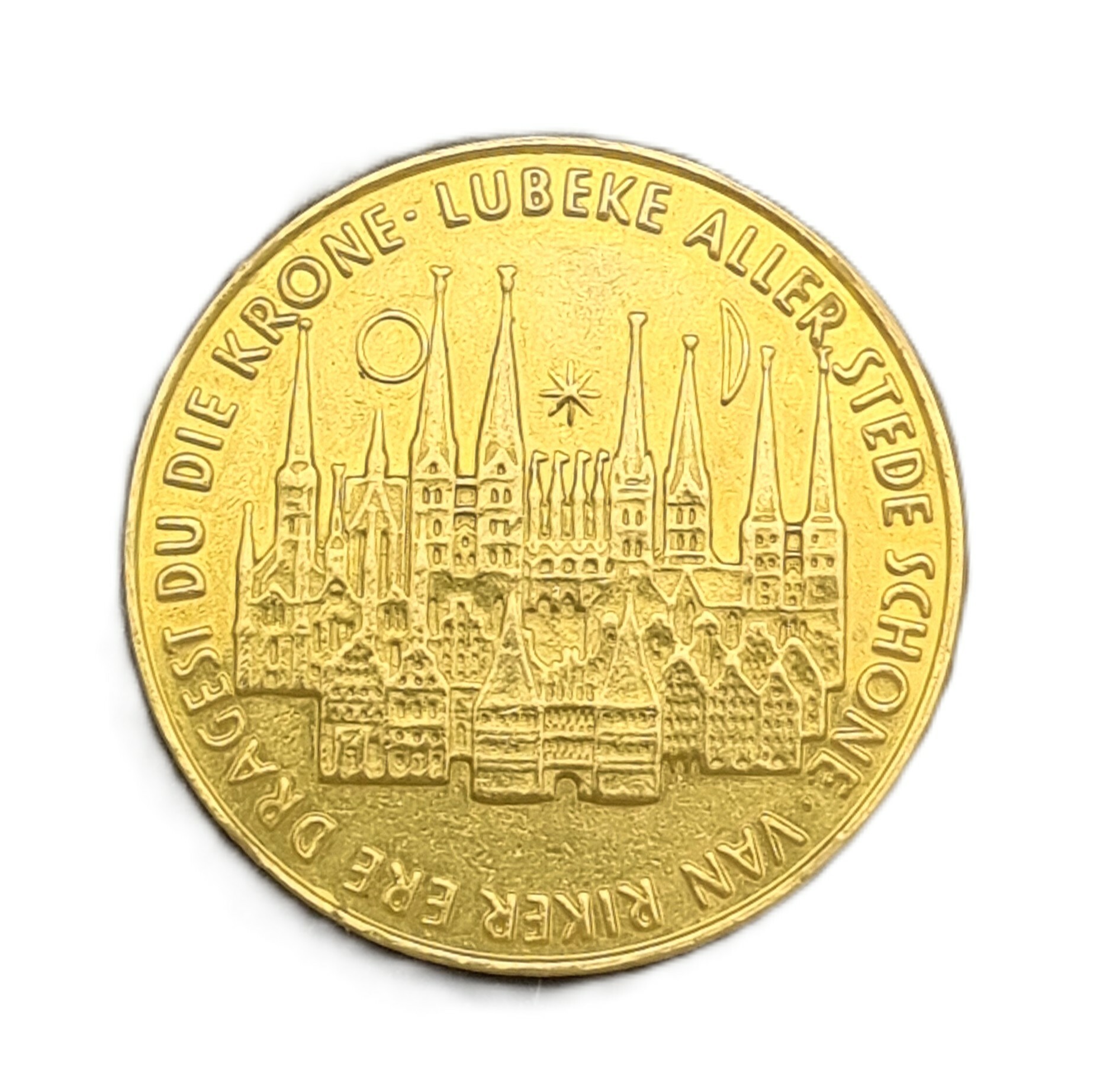 Een 21 karaat Duitse gouden herdenkingsmunt gewijd aan de Hanzestad Lübeck, De tekst op de munt luidt "ZUM 800 JAHRE JUBILÄUM DER STADT LÜBECK" en "LÜBECK DAT TOR ZUM NORDEN". Gemerkt in de rand 900 en getoetst, 20e eeuw. Kom langs tijdens de kijkdagen (29 t/m 31 augustus) en ontdek de munt zelf! |