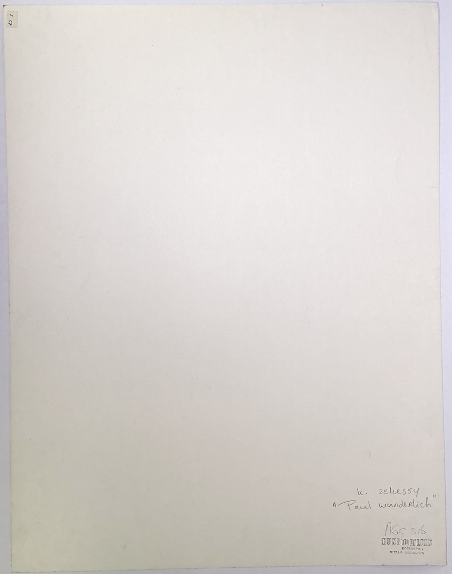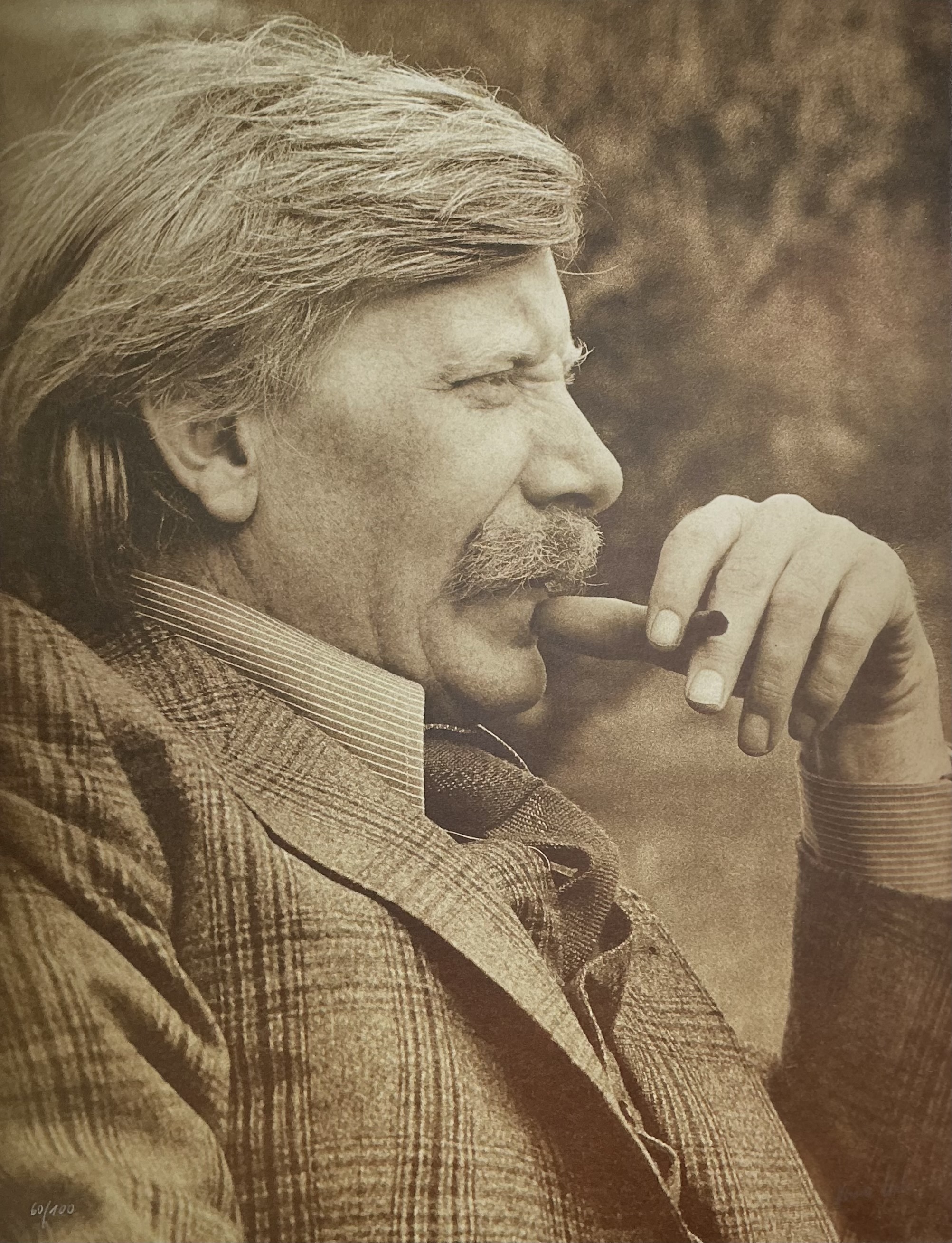 Een fotoprint van Karin Székessy (1939) uit circa 1970. De zwart-witfoto is een close-up portret van Paul Wunderlich in profiel met een sigaar. Het werk, dat een zachte sepia-tint heeft, is gesigneerd rechtsonder en genummerd 60/100 linksonder. De belichting en compositie benadrukken het gezicht en de details van het object. Verso vermelding naam, titel en nummer.