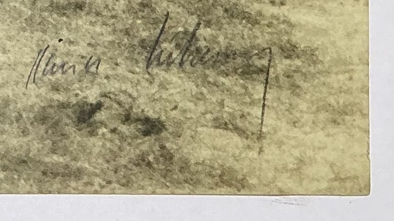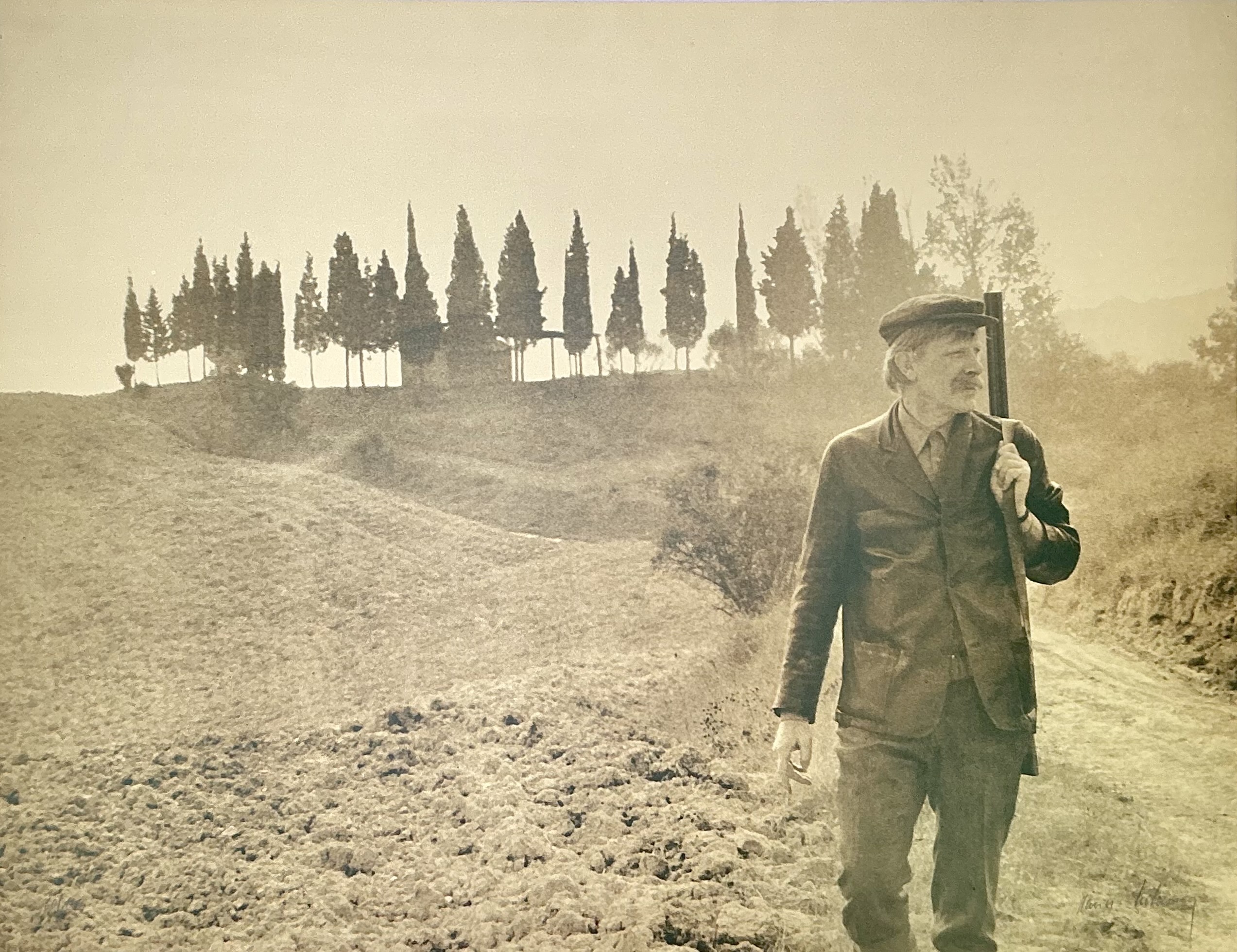 Monochroom sepia foto van Karin Székessy (1939-2010), getiteld "Wunderlich gew."uit circa 1970, voorstellend Paul Wunderlich in een geploegd landschap met cipressen op de achtergrond. Rechtsonder in de afbeelding gesigneerd "Karin Székessy". Verso vermelding naam, titel en nummer.