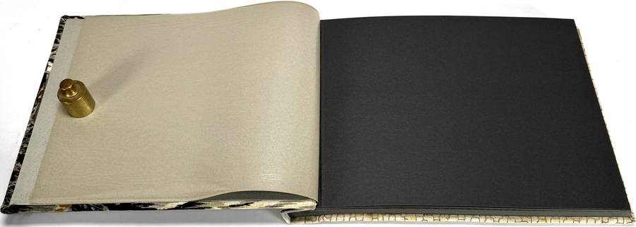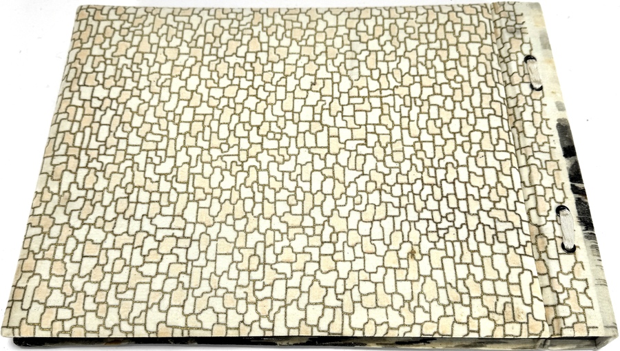Een vintage fotoalbum uit circa 1930 met een textiel omslag. De omslag is bedrukt met een Japanse landschapsillustratie; de berg Fuji, een tempel en boten. Het ongebruikte album heeft aan de binnenzijde zwarte en witte kartonnen bladen met beschermende tussenvellen en een touwsluiting. Gebonden met witte koorden langs de rugzijde, Zeker zijn van deelname? Plaats vanaf 22 augustus een schriftelijk bod online! |