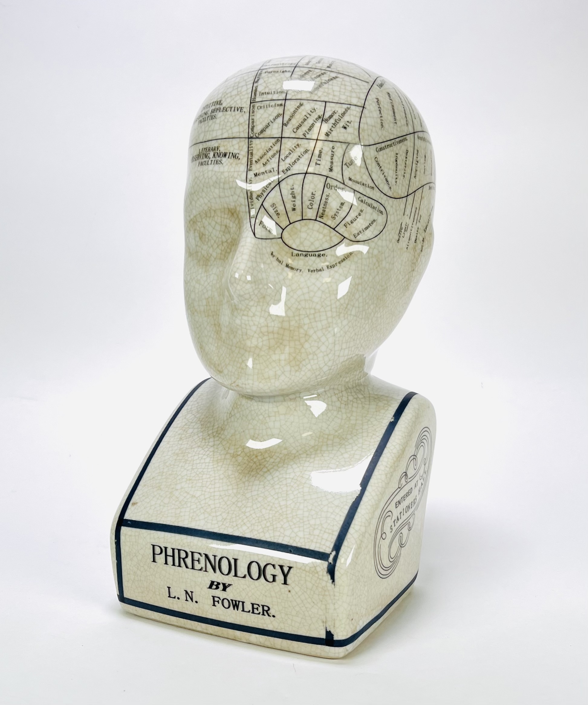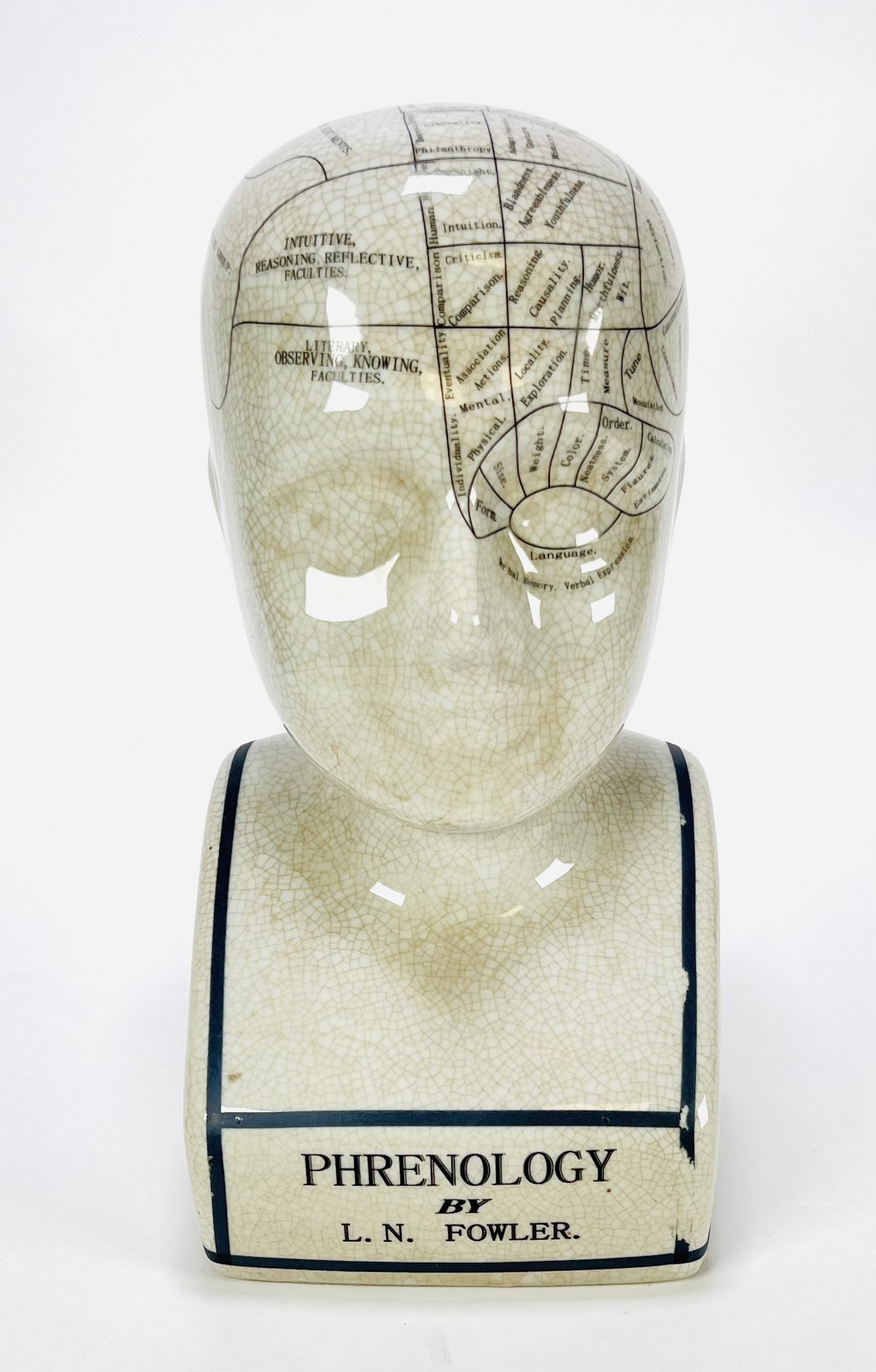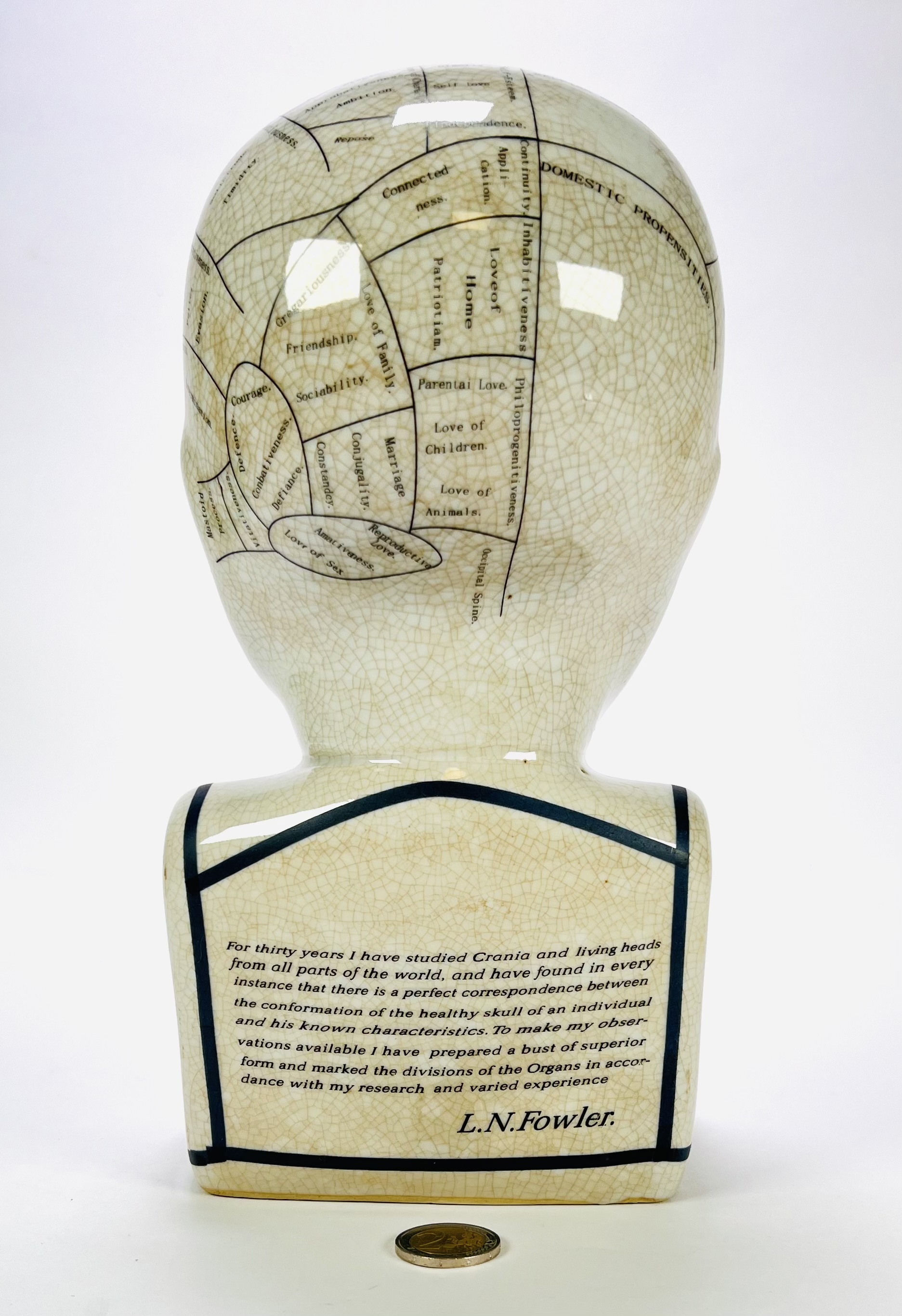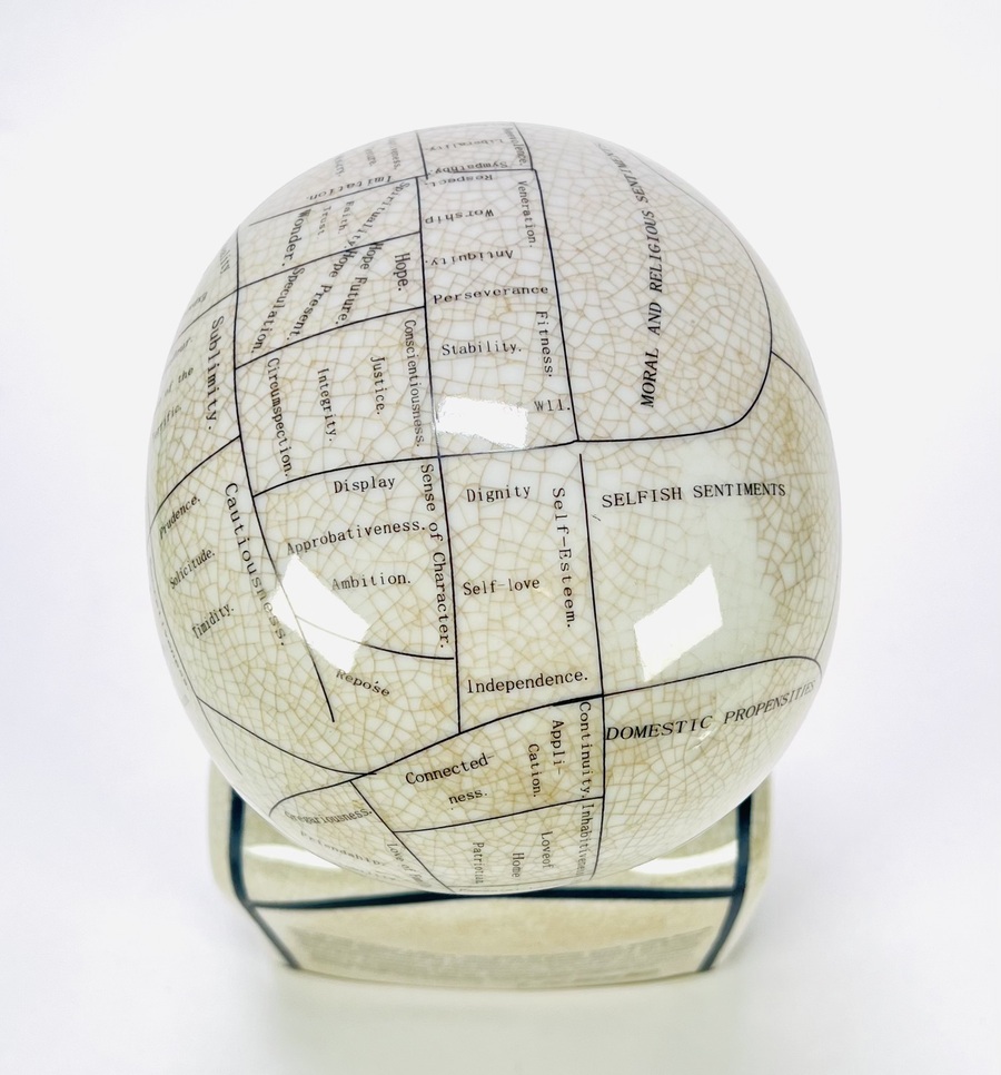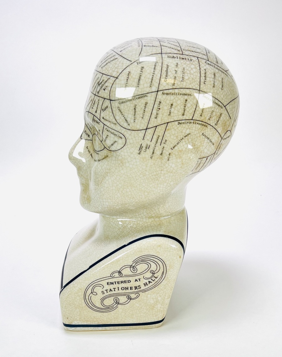 Een porseleinen frenologie hoofd naar L.N. Fowler eind 20e eeuw, met een craquelé glazuur. Het object is voorzien van een gedetailleerde indeling van het hoofd met frenologische secties en teksten. Kom langs tijdens de kijkdagen (29 t/m 31 augustus) en ontdek dit object zelf! |