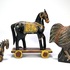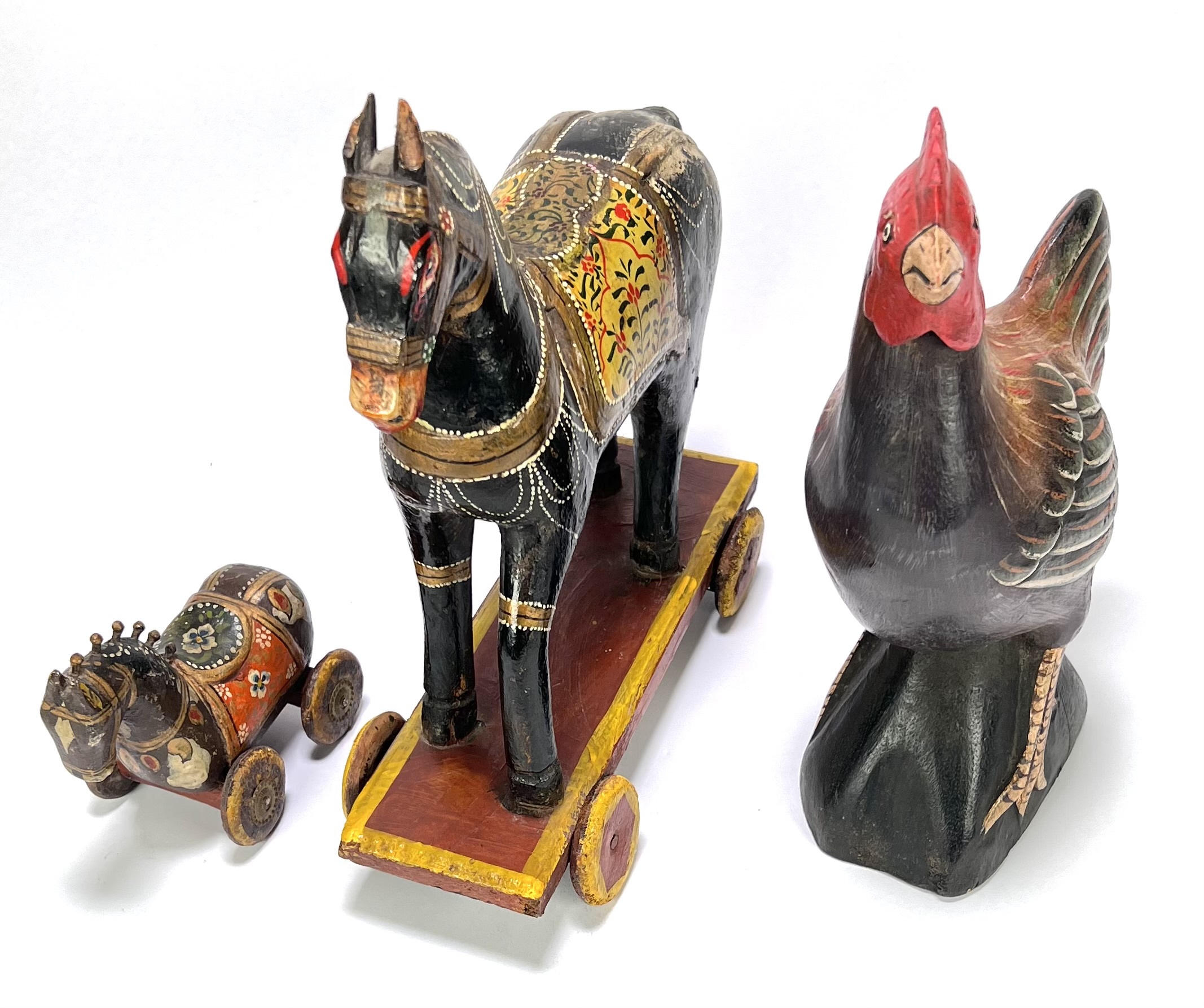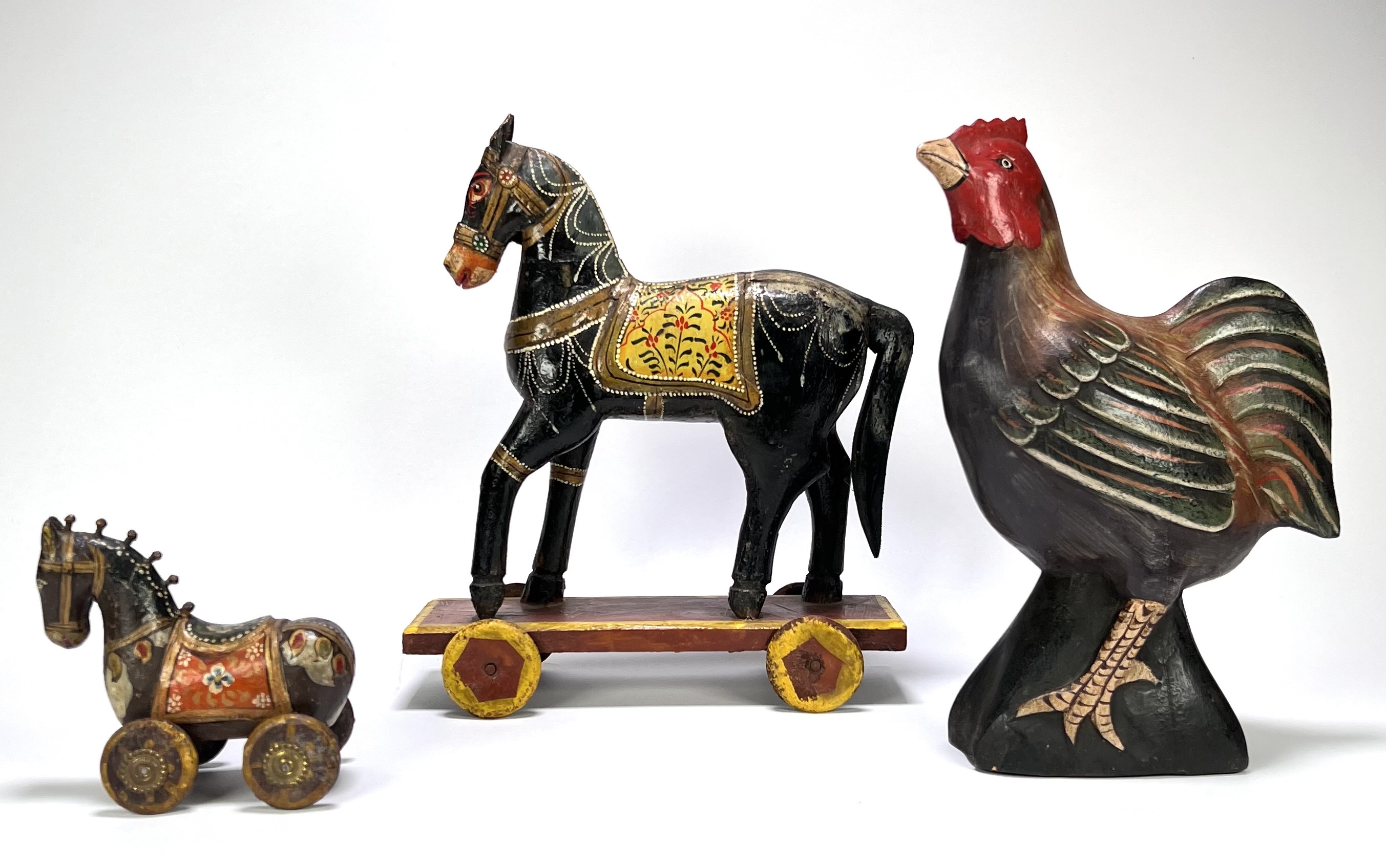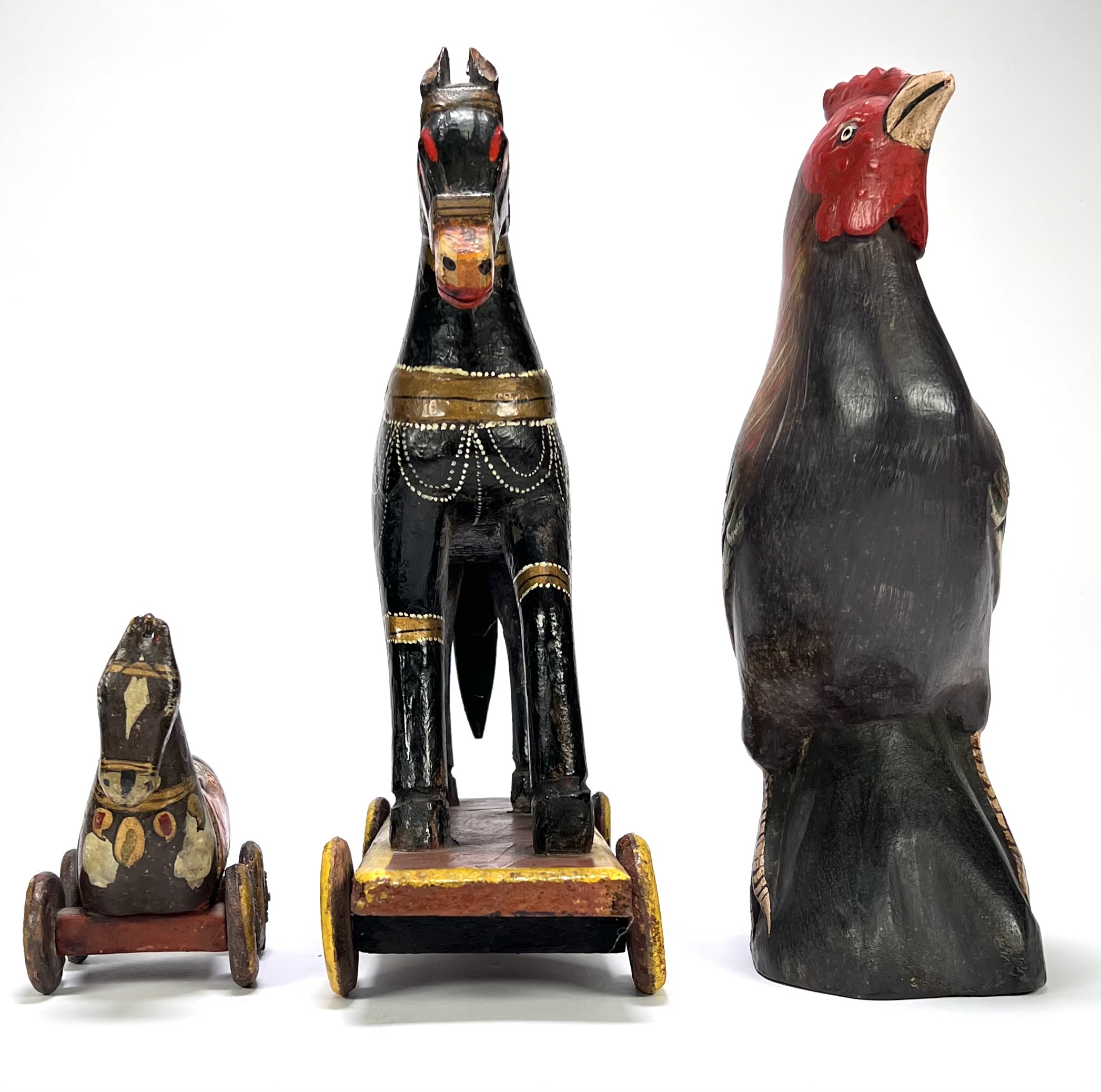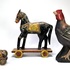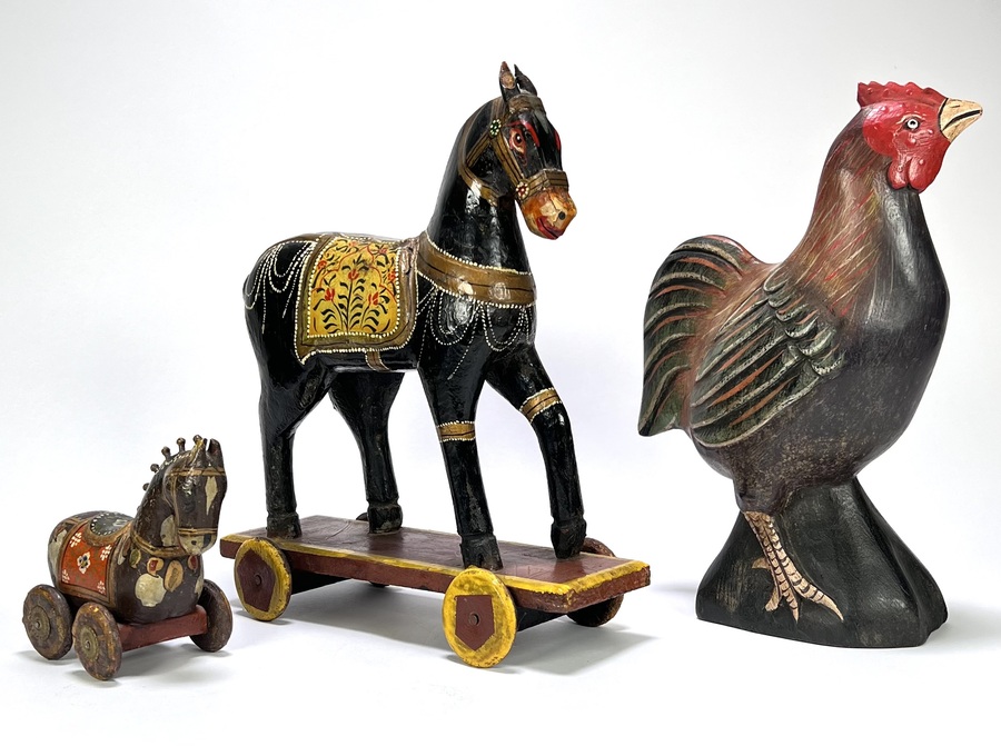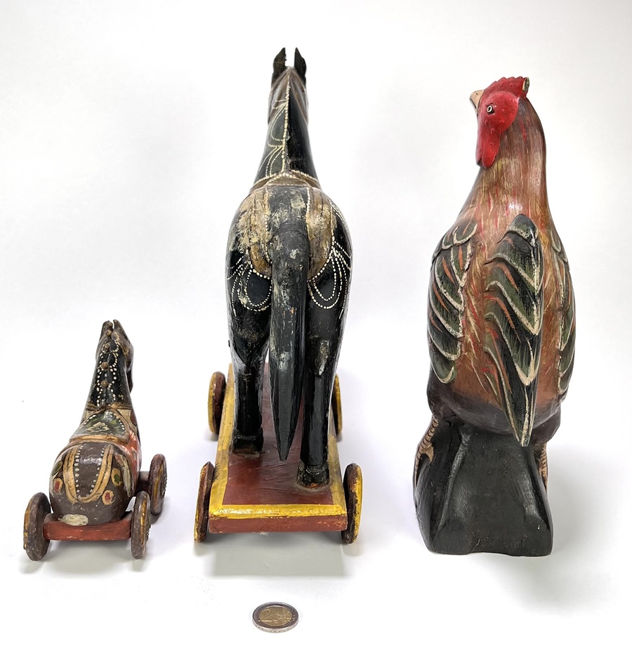 Drie handbeschilderde houten dieren/speelgoed, bestaande uit een zwart paard op wielen met florale motieven, een kleinere verrijdbare paardenfiguur met gestileerde decoratie en een staande haan met uitgesneden verendetail. Vervaardigd in hout en uitgevoerd in traditionele volkskunsttechniek. Datering: midden 20e eeuw. Zelf beoordelen? Je bent welkom op onze kijkdagen op 29, 30 en 31 augustus! |