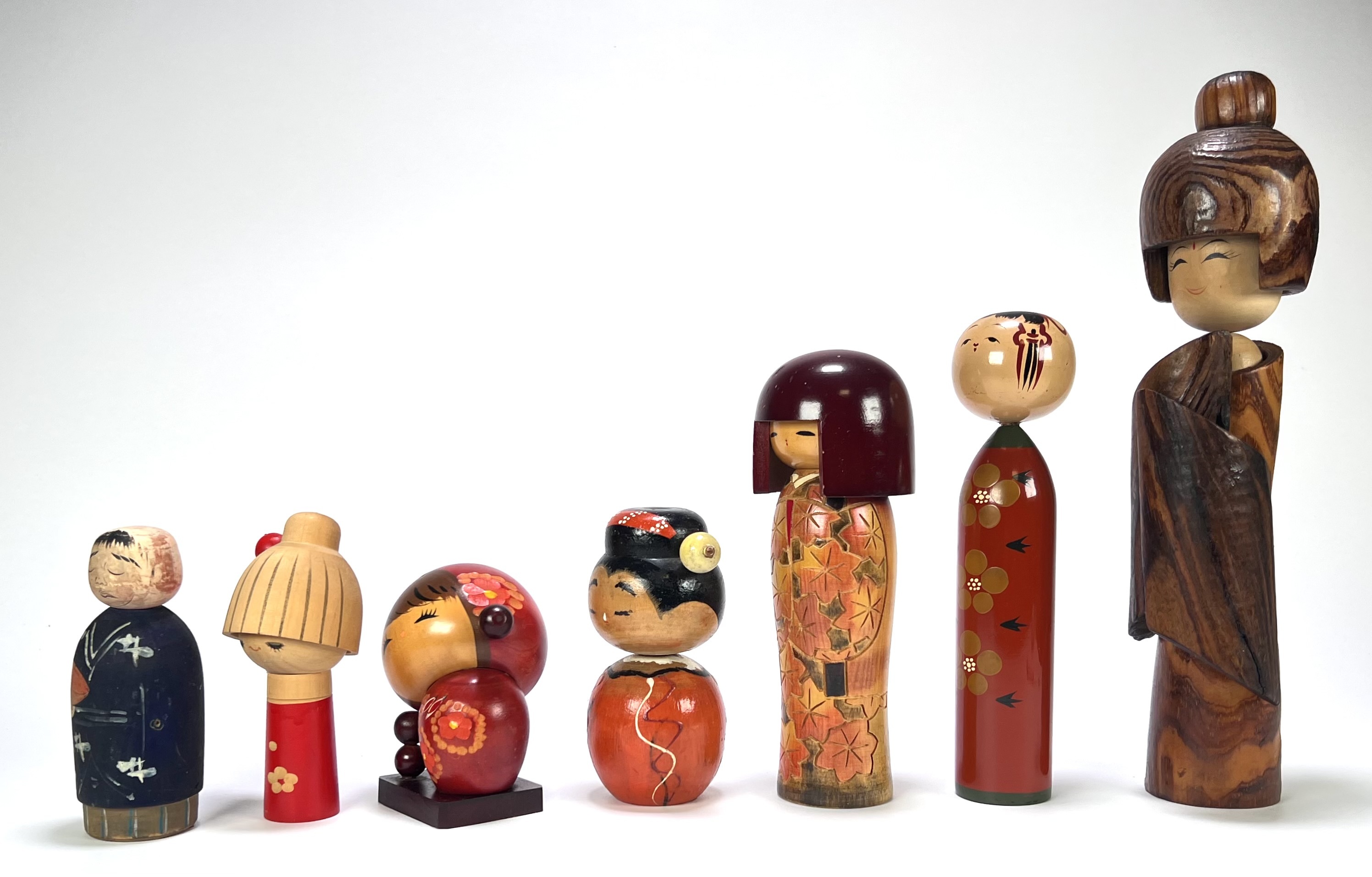Set van zeven Japanse kokeshi-poppen, uitgevoerd in hout en beschilderd met kimono- en bloemmotieven. De variatie in grootte en vorm weerspiegelt zowel klassieke als modernere interpretaties binnen de Japanse volkskunst. Datering omstreeks midden 20e eeuw. Kom langs tijdens de kijkdagen (29 t/m 31 augustus) en ontdek deze poppen zelf! |