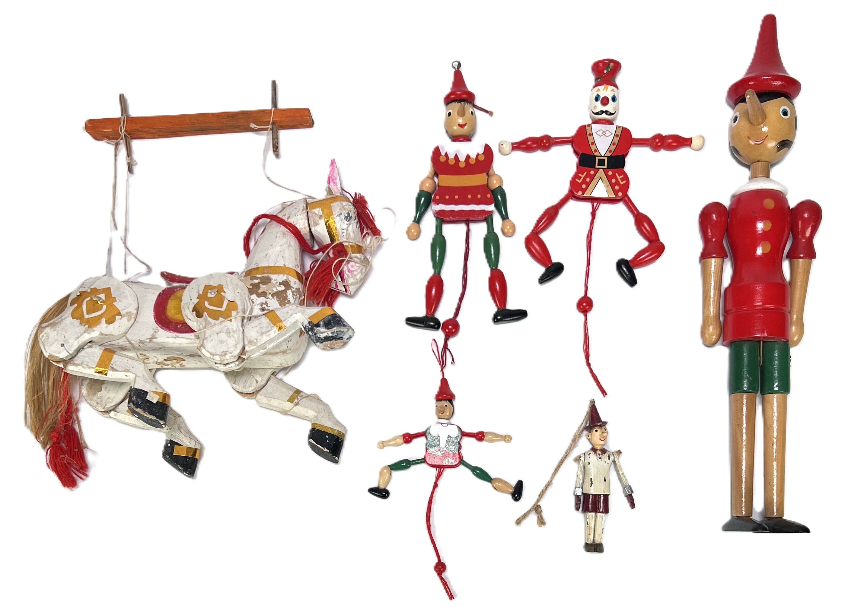 Vintage houten speelgoed, Pinocchio en marionetten, 20e eeuw